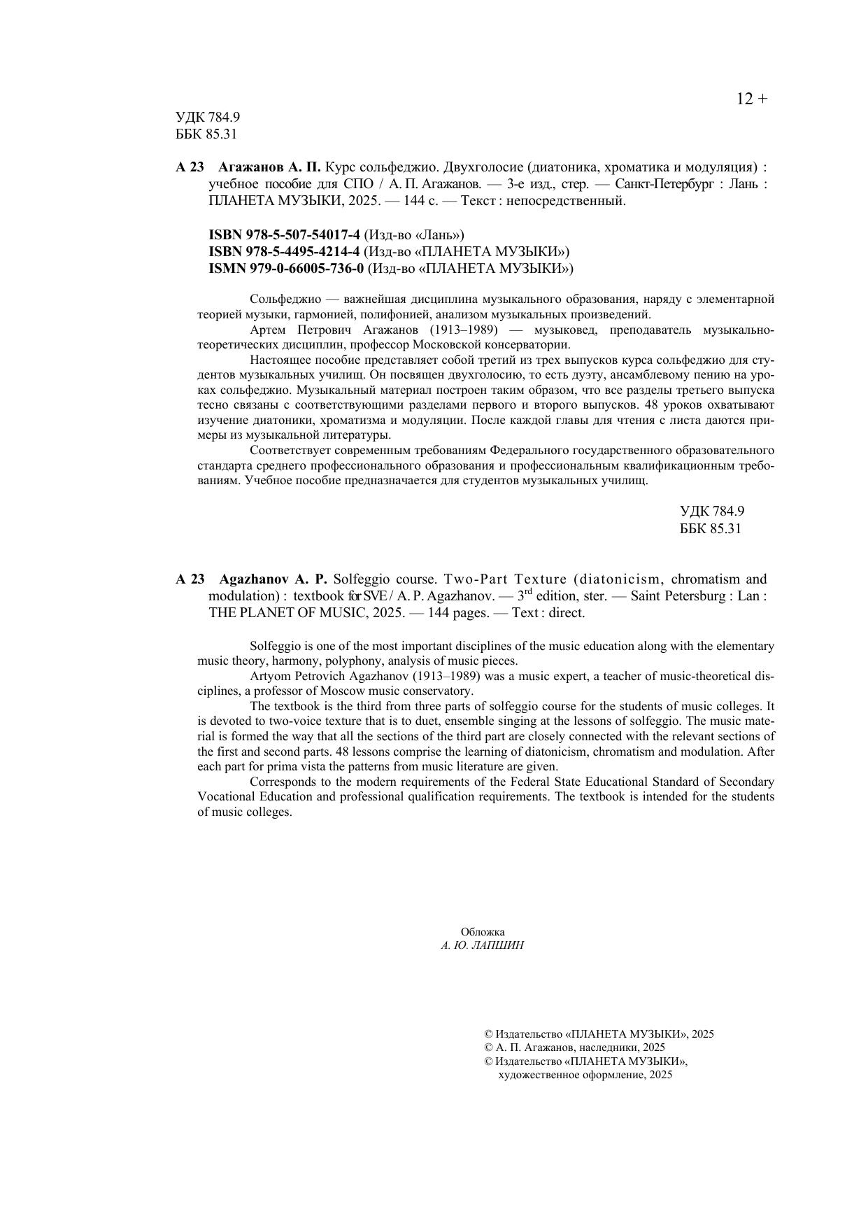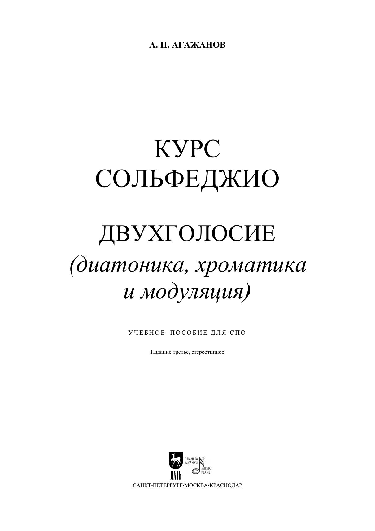 Сольфеджио — важнейшая дисциплина музыкального образования, наряду с элементарной теорией музыки, гармонией, полифонией, анализом музыкальных произведений. Артем Петрович Агажанов (1913–1989) — музыковед, преподаватель музыкально-тео-ретических дисциплин, профессор Московской консерватории. Настоящее пособие представляет собой третий из трех выпусков курса сольфеджио для студентов музыкальных училищ. Он посвящен двухголосию, то есть дуэту, ансамблевому пению на уроках сольфеджио. Музыкальный материал построен таким образом, что все разделы третьего выпуска тесно связаны с соответствующими разделами первого и второго выпусков. 48 уроков охватывают изучение диатоники, хроматизма и модуляции. После каждой главы для чтения с листа даются примеры из музыкальной литературы. Учебное пособие предназначается для студентов музыкальных училищ. Solfeggio is one of the most important disciplines of the music education along with the elementary music theory, harmony, polyphony, analysis of music pieces. Artyom Petrovich Agazhanov (1913–1989) was a music expert, a teacher of music-theoretical disciplines, a professor of Moscow music conservatory. The textbook is the third from three parts of solfeggio course for the students of music colleges. It is devoted to two-voice texture that is to duet, ensemble singing at the lessons of solfeggio. The music material is formed the way that all the sections of the third part are closely connected with the relevant sections of the first and second parts. 48 lessons comprise the learning of diatonicism, chromatism and modulation. After each part for prima vista the patterns from music literature are given. The textbook is intended for the students of music colleges.