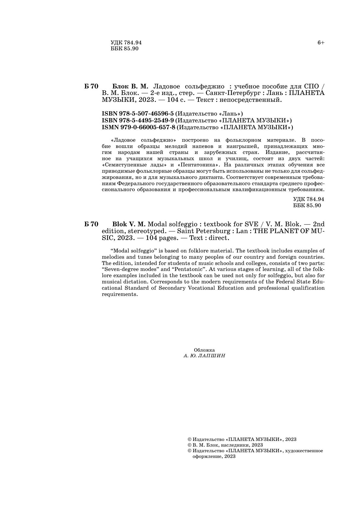 Ладовое сольфеджио построено на фольклорном материале. В пособие вошли образцы мелодий напевов и наигрышей, принадлежащих многим народам нашей страны и зарубежных стран. Издание, рассчитанное на студентов училищ и колледжей, состоит из двух частей: "Семиступенные лады" и "Пентатоника". На различных этапах обучения все приводимые фольклорные образцы могут быть использованы не только для сольфеджирования, но и для музыкального диктанта. Соответствует современным требованиям Федерального государственного образовательного стандарта среднего профессионального образования и профессиональным квалификационным требованиям. "Modal solfeggio" is based on folklore material. The textbook includes examples of melodies and tunes belonging to many peoples of our country and foreign countries. The edition, intended for students of colleges, consists of two parts: "Seven-degree modes" and "Pentatonic". At various stages of learning, all of the folklore examples included in the textbook can be used not only for solfeggio, but also for musical dictation. Corresponds to the modern requirements of the Federal State Educational Standard of Secondary Vocational Education and professional qualification requirements.
