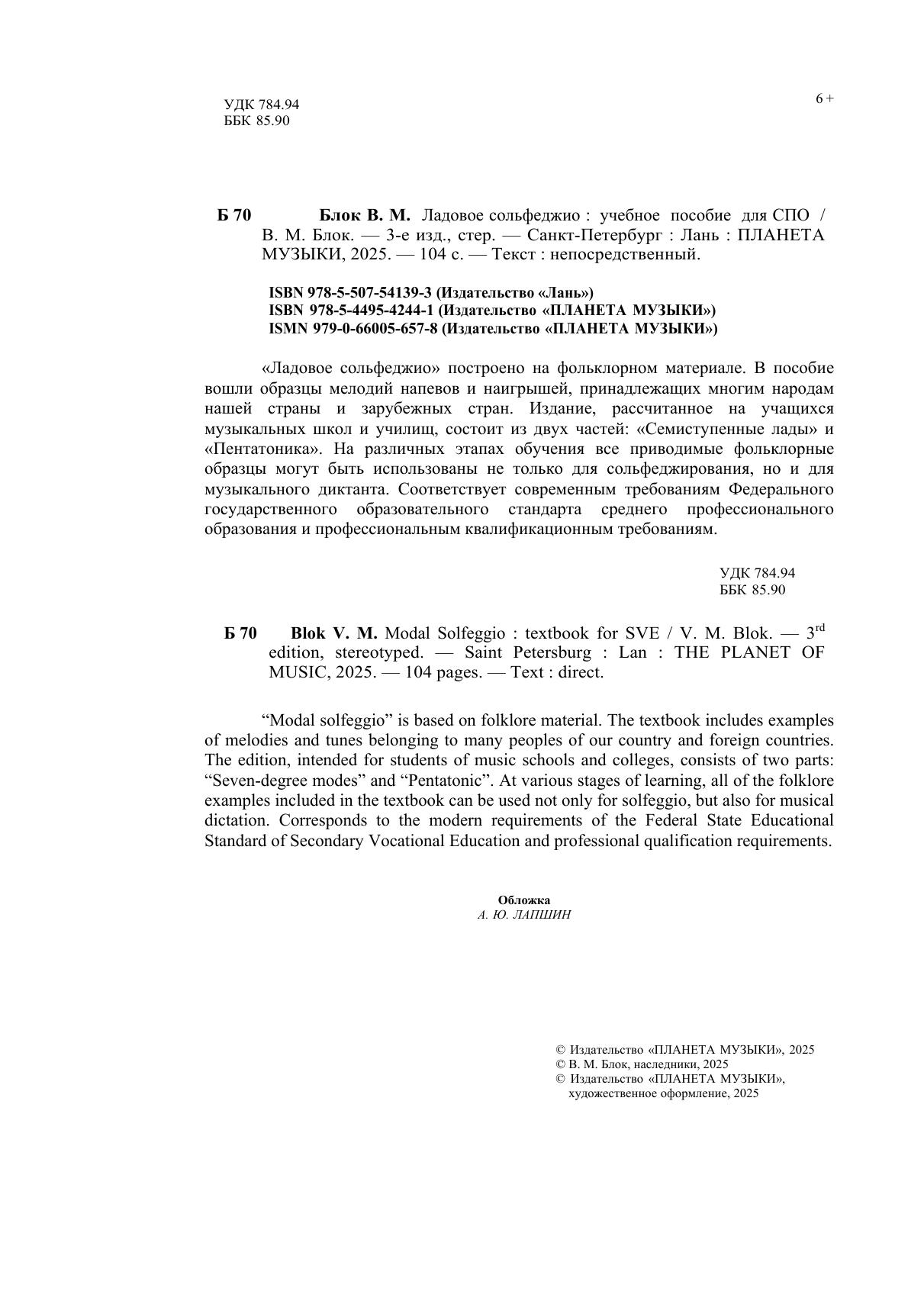 Ладовое сольфеджио построено на фольклорном материале. В пособие вошли образцы мелодий напевов и наигрышей, принадлежащих многим народам нашей страны и зарубежных стран. Издание, рассчитанное на студентов училищ и колледжей, состоит из двух частей: "Семиступенные лады" и "Пентатоника". На различных этапах обучения все приводимые фольклорные образцы могут быть использованы не только для сольфеджирования, но и для музыкального диктанта. Соответствует современным требованиям Федерального государственного образовательного стандарта среднего профессионального образования и профессиональным квалификационным требованиям. "Modal solfeggio" is based on folklore material. The textbook includes examples of melodies and tunes belonging to many peoples of our country and foreign countries. The edition, intended for students of colleges, consists of two parts: "Seven-degree modes" and "Pentatonic". At various stages of learning, all of the folklore examples included in the textbook can be used not only for solfeggio, but also for musical dictation. Corresponds to the modern requirements of the Federal State Educational Standard of Secondary Vocational Education and professional qualification requirements.