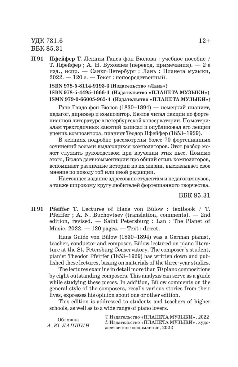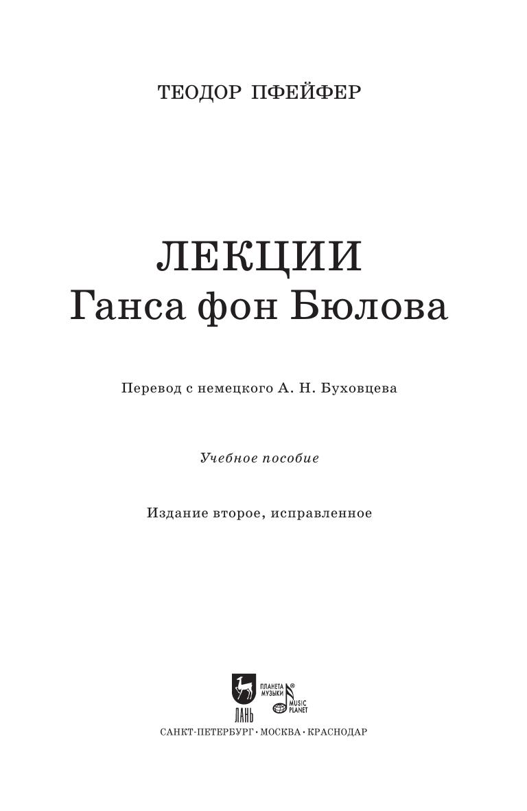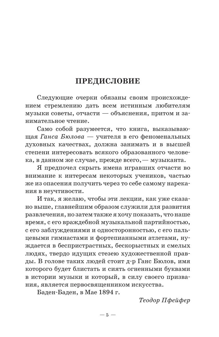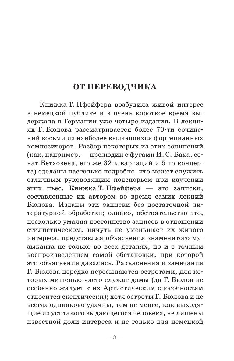 Бюлов Ганс-Гвидо фон (1830-1894) – немецкий пианист, педагог, дирижер и композитор. Во время своего пребывания в Санкт-Петербурге в 1885 году Бюлов читал лекции по фортепианной литературе в зале петербургской консерватории. По материалам трехгодичных занятий записал и опубликовал его лекции ученик композитора, пианист Теодор Пфейфер (1853-1929).