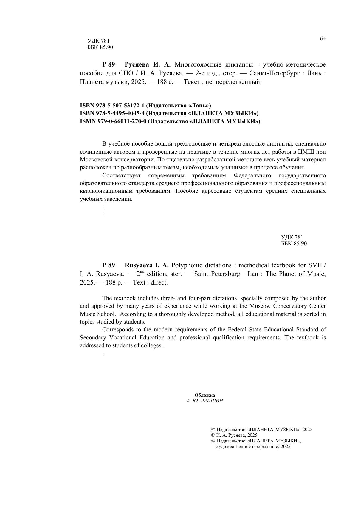 В учебное пособие вошли трёхголосные и четырёхголосные диктанты, специально сочинённые автором и проверенные на практике в течение многих лет работы в ЦМШ при Московской консерватории. По тщательно разработанной методике весь учебный материал расположен по разнообразным темам, необходимым учащимся в процессе обучения. Соответствует современным требованиям Федерального государственного образовательного стандарта среднего профессионального образования и профессиональным квалификационным требованиям. Пособие адресовано студентам средних специальных учебных заведений. The textbook includes three- and four-part dictations, specially composed by the author and approved by many years of experience while working at the Moscow Concervatory Center Music School. According to a thoroughly developed method, all educational material is sorted in topics studied by students. Corresponds to the modern requirements of the Federal State Educational Standard of Secondary Vocational Education and professional qualification requirements. The textbook is addressed to students of colleges.