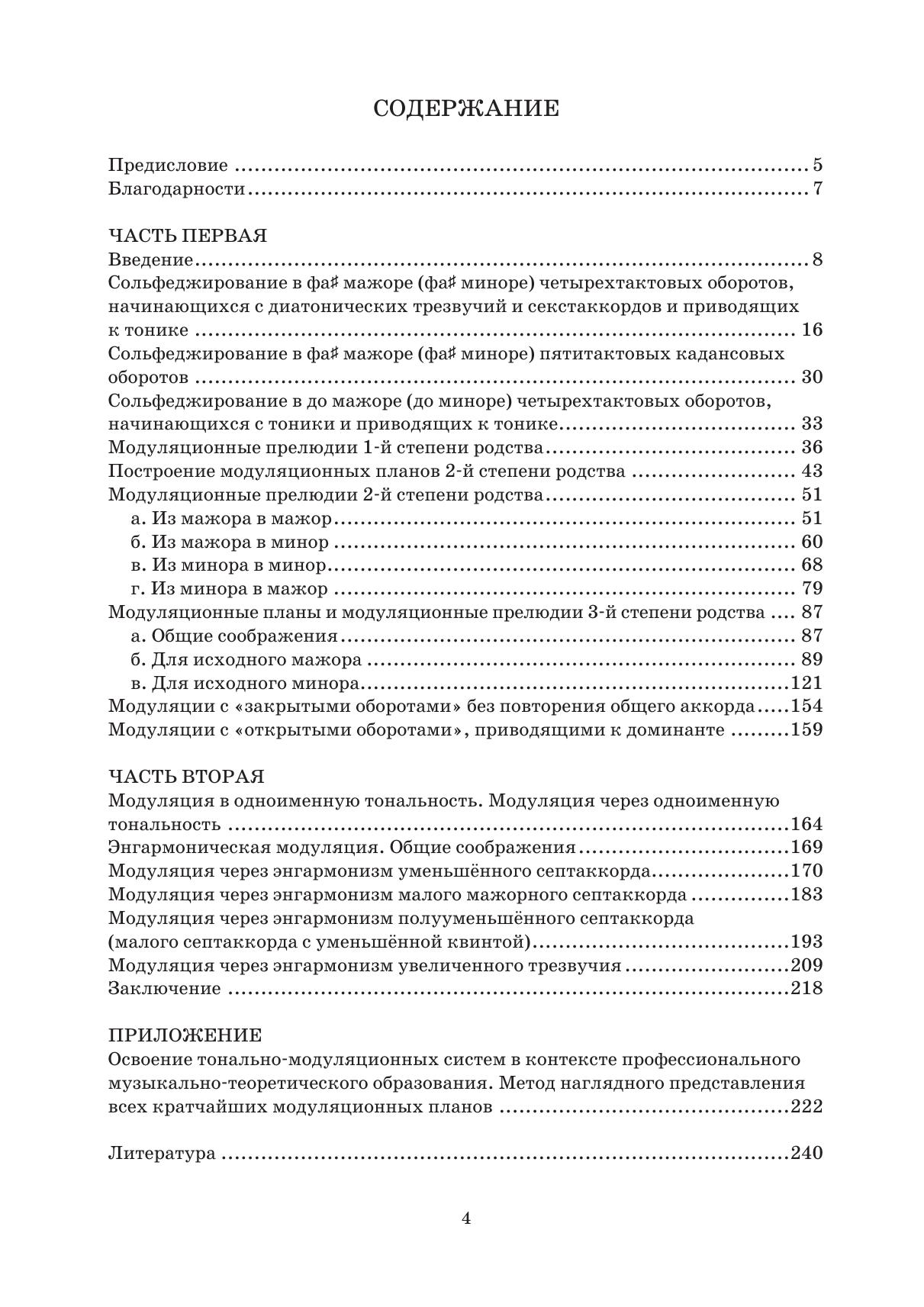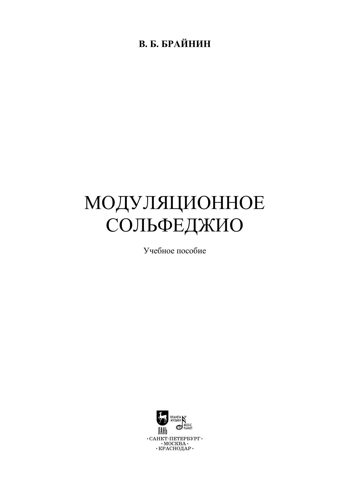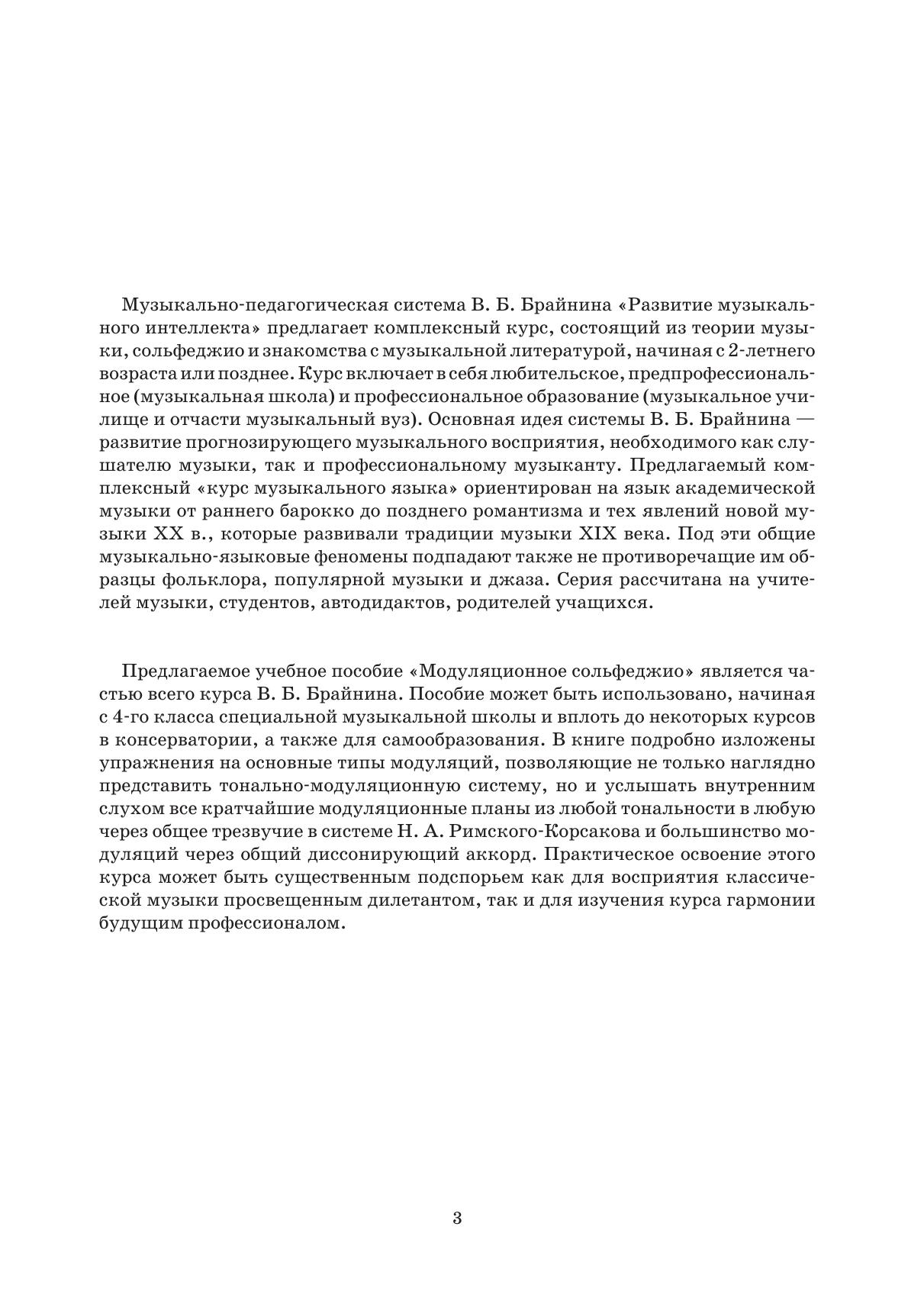 Музыкально-педагогическая система В. Б. Брайнина «Развитие музыкального интеллекта» предлагает комплексный курс, состоящий из теории музыки, сольфеджио и знакомства с музыкальной литературой. Данное учебное пособие является частью этого курса. Пособие может быть использовано, начиная с 4-го класса специальной музыкальной школы и вплоть до некоторых курсов в консерватории, а также для самообразования. В книге подробно изложены упражнения на основные типы модуляций, позволяющие не только наглядно представить тонально-модуляционную систему, но и услышать внутренним слухом все кратчайшие модуляционные планы из любой тональности в любую через общее трезвучие в системе Н. А. Римского-Корсакова и большинство модуляций через общий диссонирующий аккорд. Практическое освоение этого курса может быть существенным подспорьем как для восприятия классической музыки просвещенным дилетантом, так и для изучения курса гармонии будущим профессионалом. Valeri Brainin’s pedagogical system, The Development of Musical Intelligence, is a comprehensive course combining music theory, ear training, solfège, and musical literature (as an introduction to classical works through listening). This textbook is part of the system. It can be used from the 4th grade of a specialized music school for gifted children, through certain conservatory-level courses, and for self-study. The book offers detailed exercises on the basic forms of modulation, helping students understand key relationships, grasp modulation techniques, and hear the shortest paths from any key to any other — through a triad common to both keys (according to Rimsky-Korsakov’s system of key relationships) or through a dissonant chord common to both keys. Mastery of this material is useful for advanced amateurs wishing to deepen their understanding of classical music and for future professionals studying.