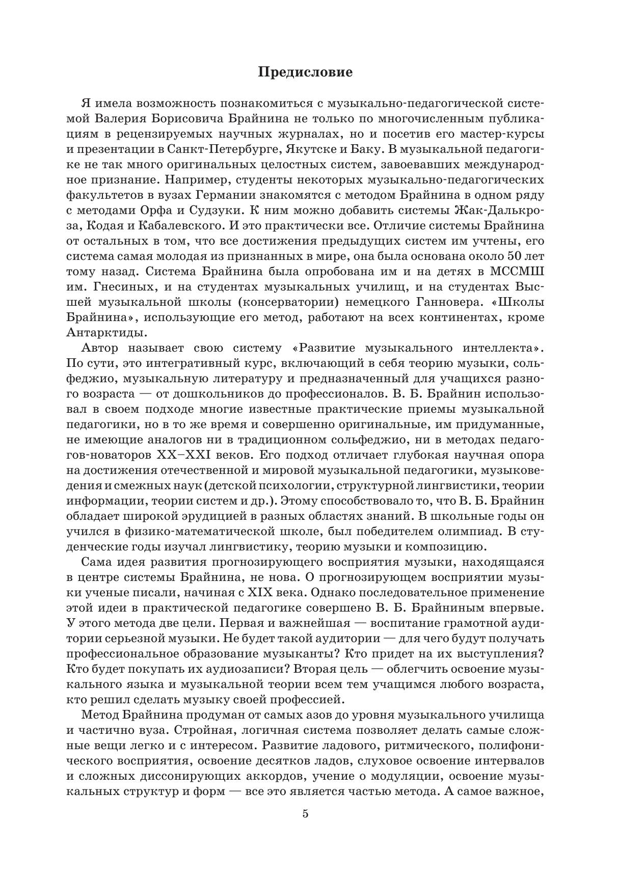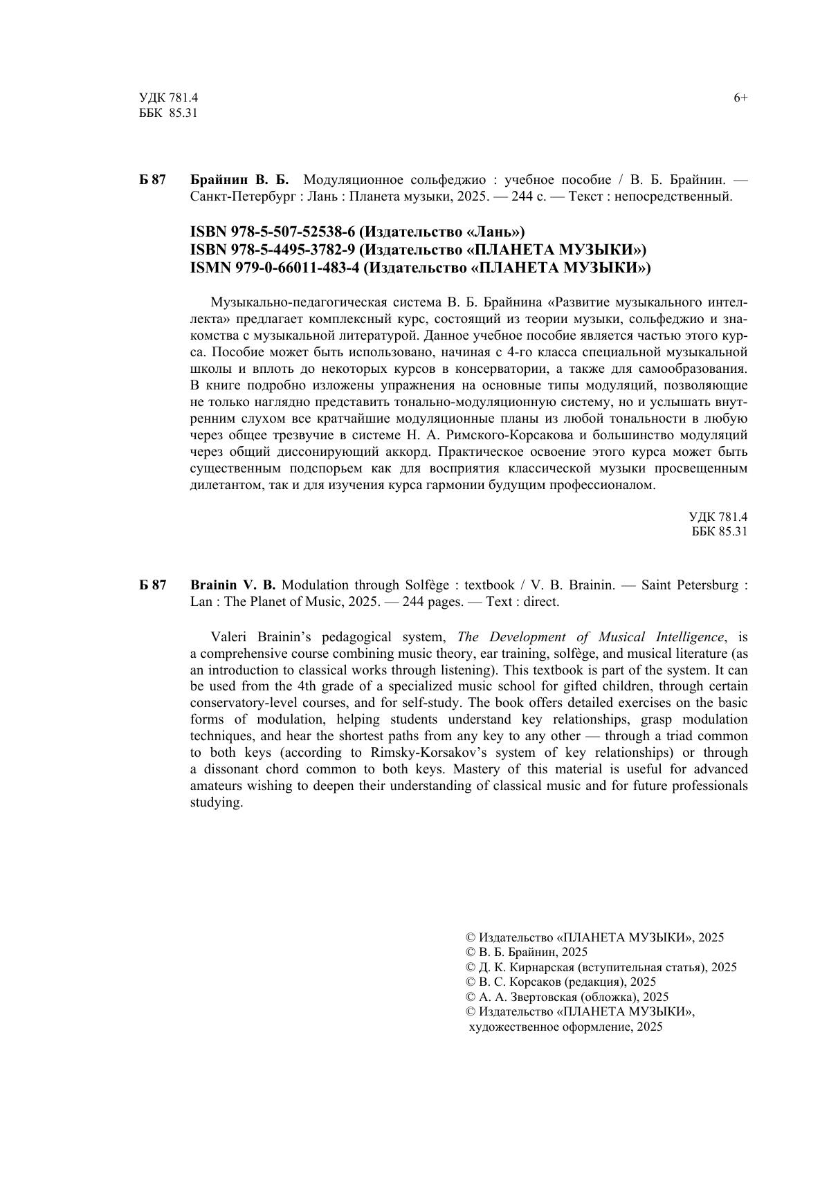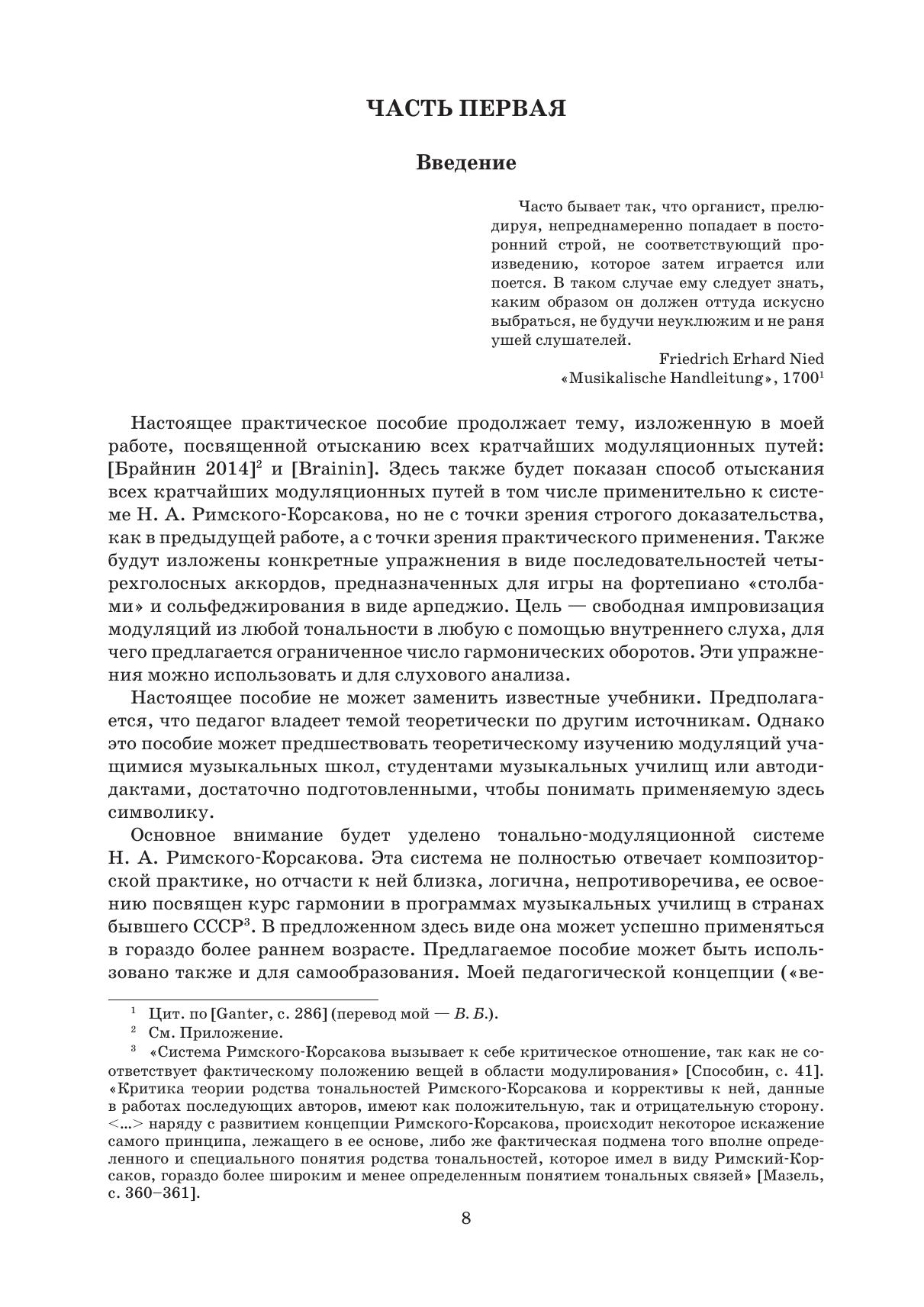 Музыкально-педагогическая система В. Б. Брайнина «Развитие музыкального интеллекта» предлагает комплексный курс, состоящий из теории музыки, сольфеджио и знакомства с музыкальной литературой. Данное учебное пособие является частью этого курса. Пособие может быть использовано, начиная с 4-го класса специальной музыкальной школы и вплоть до некоторых курсов в консерватории, а также для самообразования. В книге подробно изложены упражнения на основные типы модуляций, позволяющие не только наглядно представить тонально-модуляционную систему, но и услышать внутренним слухом все кратчайшие модуляционные планы из любой тональности в любую через общее трезвучие в системе Н. А. Римского-Корсакова и большинство модуляций через общий диссонирующий аккорд. Практическое освоение этого курса может быть существенным подспорьем как для восприятия классической музыки просвещенным дилетантом, так и для изучения курса гармонии будущим профессионалом. Valeri Brainin’s pedagogical system, The Development of Musical Intelligence, is a comprehensive course combining music theory, ear training, solfège, and musical literature (as an introduction to classical works through listening). This textbook is part of the system. It can be used from the 4th grade of a specialized music school for gifted children, through certain conservatory-level courses, and for self-study. The book offers detailed exercises on the basic forms of modulation, helping students understand key relationships, grasp modulation techniques, and hear the shortest paths from any key to any other — through a triad common to both keys (according to Rimsky-Korsakov’s system of key relationships) or through a dissonant chord common to both keys. Mastery of this material is useful for advanced amateurs wishing to deepen their understanding of classical music and for future professionals studying.