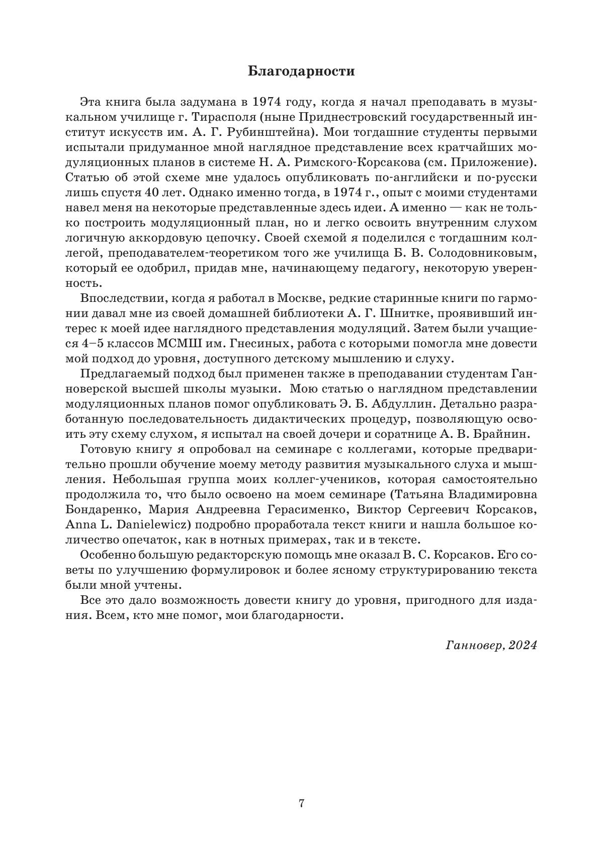 Музыкально-педагогическая система В. Б. Брайнина «Развитие музыкального интеллекта» предлагает комплексный курс, состоящий из теории музыки, сольфеджио и знакомства с музыкальной литературой. Данное учебное пособие является частью этого курса. Пособие может быть использовано, начиная с 4-го класса специальной музыкальной школы и вплоть до некоторых курсов в консерватории, а также для самообразования. В книге подробно изложены упражнения на основные типы модуляций, позволяющие не только наглядно представить тонально-модуляционную систему, но и услышать внутренним слухом все кратчайшие модуляционные планы из любой тональности в любую через общее трезвучие в системе Н. А. Римского-Корсакова и большинство модуляций через общий диссонирующий аккорд. Практическое освоение этого курса может быть существенным подспорьем как для восприятия классической музыки просвещенным дилетантом, так и для изучения курса гармонии будущим профессионалом. Valeri Brainin’s pedagogical system, The Development of Musical Intelligence, is a comprehensive course combining music theory, ear training, solfège, and musical literature (as an introduction to classical works through listening). This textbook is part of the system. It can be used from the 4th grade of a specialized music school for gifted children, through certain conservatory-level courses, and for self-study. The book offers detailed exercises on the basic forms of modulation, helping students understand key relationships, grasp modulation techniques, and hear the shortest paths from any key to any other — through a triad common to both keys (according to Rimsky-Korsakov’s system of key relationships) or through a dissonant chord common to both keys. Mastery of this material is useful for advanced amateurs wishing to deepen their understanding of classical music and for future professionals studying.