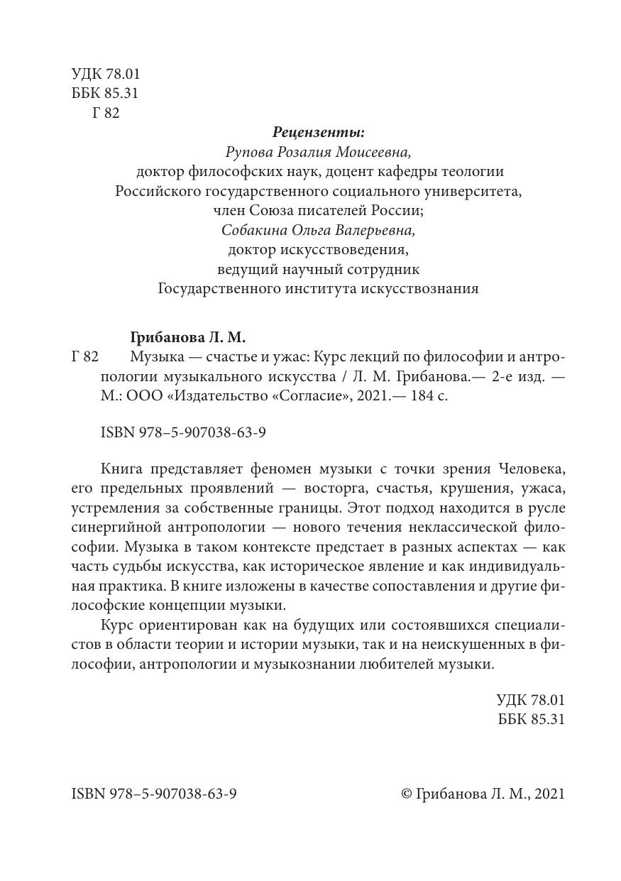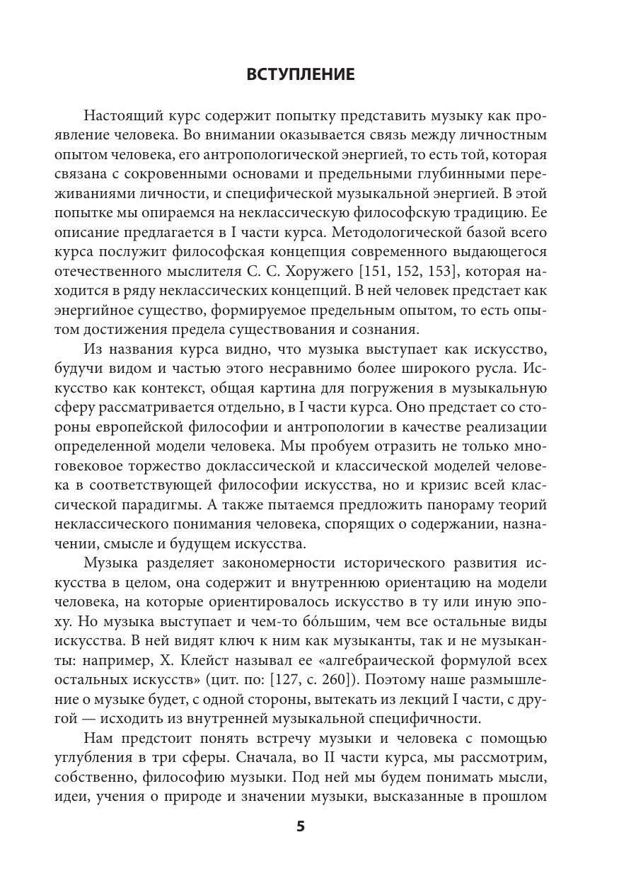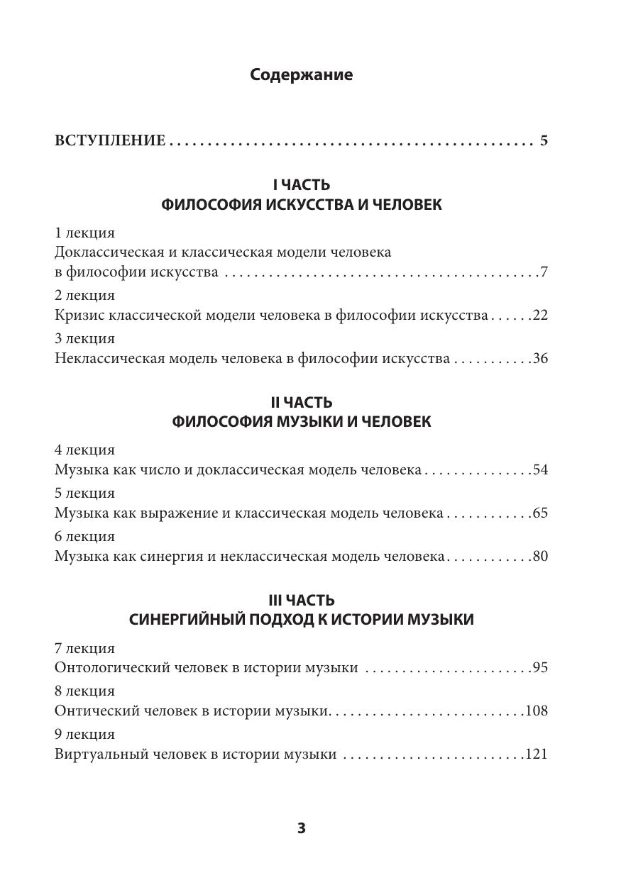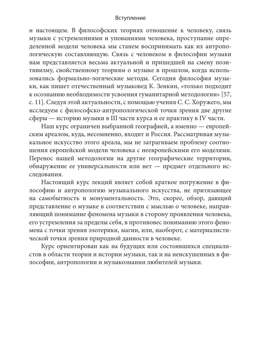Книга представляет феномен музыки с точки зрения Человека, его предельных проявлений — восторга, счастья, крушения, ужаса, устремления за собственные границы. Этот подход находится в русле синергийной антропологии — нового течения неклассической философии. Музыка в таком контексте предстает в разных аспектах — как часть судьбы искусства, как историческое явление и как индивидуальная практика. В книге изложены в качестве сопоставления и другие философские концепции музыки. Курс ориентирован как на будущих или состоявшихся специалистов в области теории и истории музыки, так и на неискушенных в философии, антропологии и музыкознании любителей музыки.
