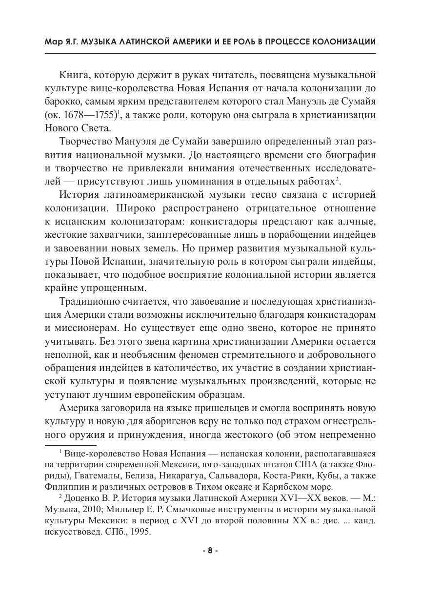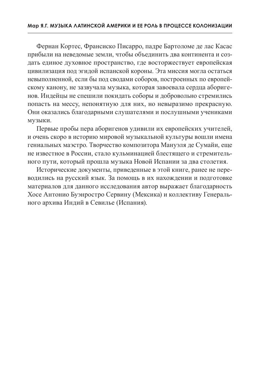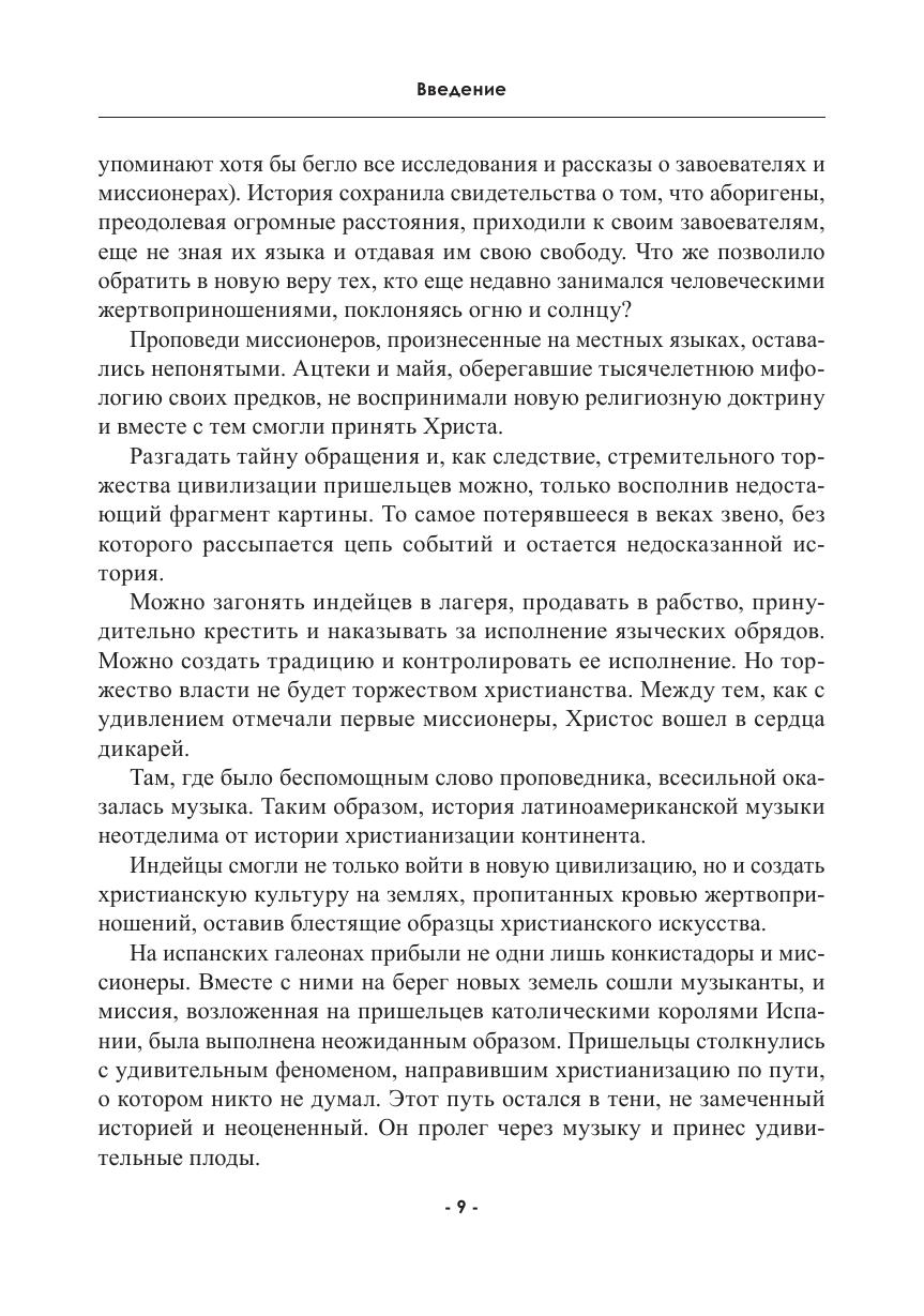 Книга посвящена истории академической музыки Латинской Америки в контексте испанской колонизации. В живой и увлекательной форме, опираясь на материалы испанских и латиноамериканских архивов, которые ранее не переводились на русский язык, автор доказывает, что христианизация и колонизация Америки стали возможными благодаря музыке, а испанские колонизаторы — вопреки распространенному мнению об их массовой жестокости — выступили просветителями индейцев, сыграли важную роль в сохранении индейской культуры и заложили основы будущей государственности стран Латинской Америки и США. Развитие музыкальной культуры Нового Света иллюстрируется на примере биографии креольского композитора Мануэля де Сумайи, а также малоизвестных, и зачастую забавных фактов из истории Испании и Латинской Америки.