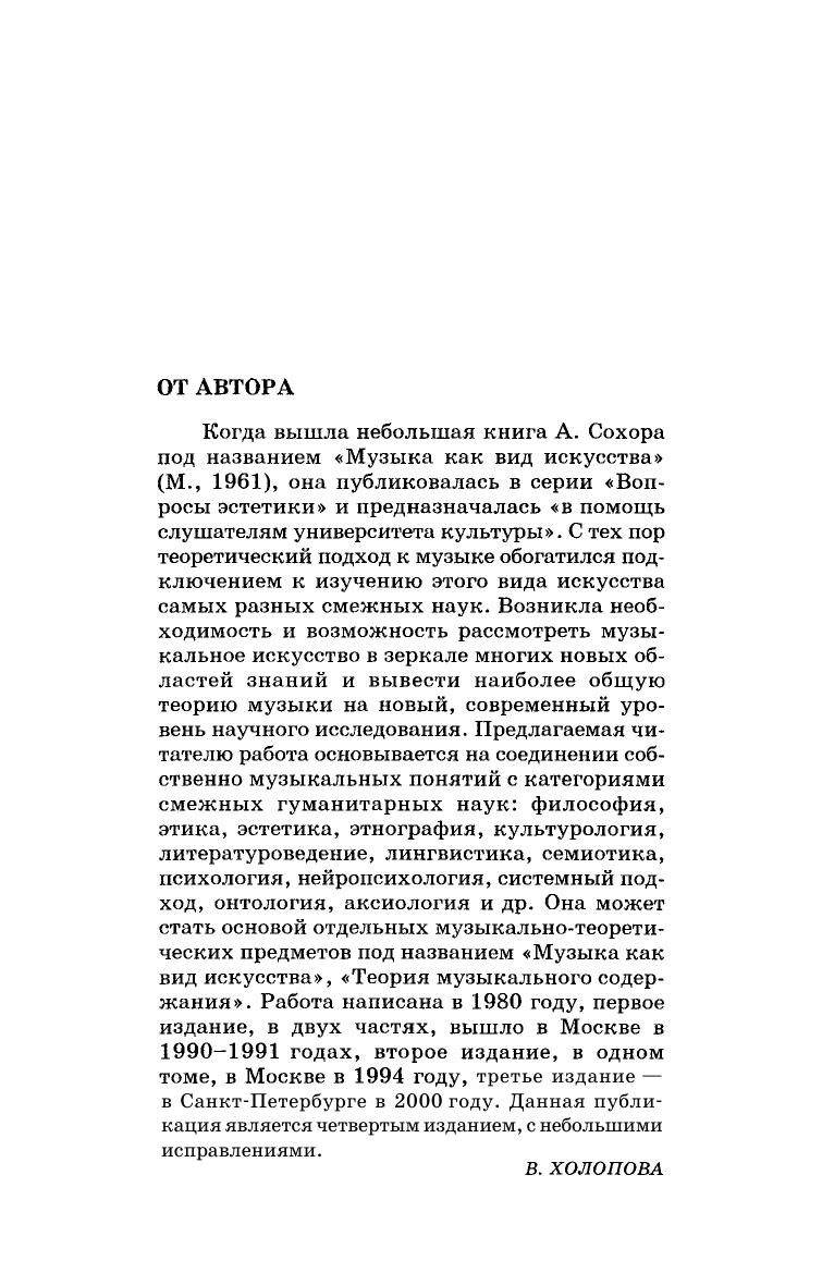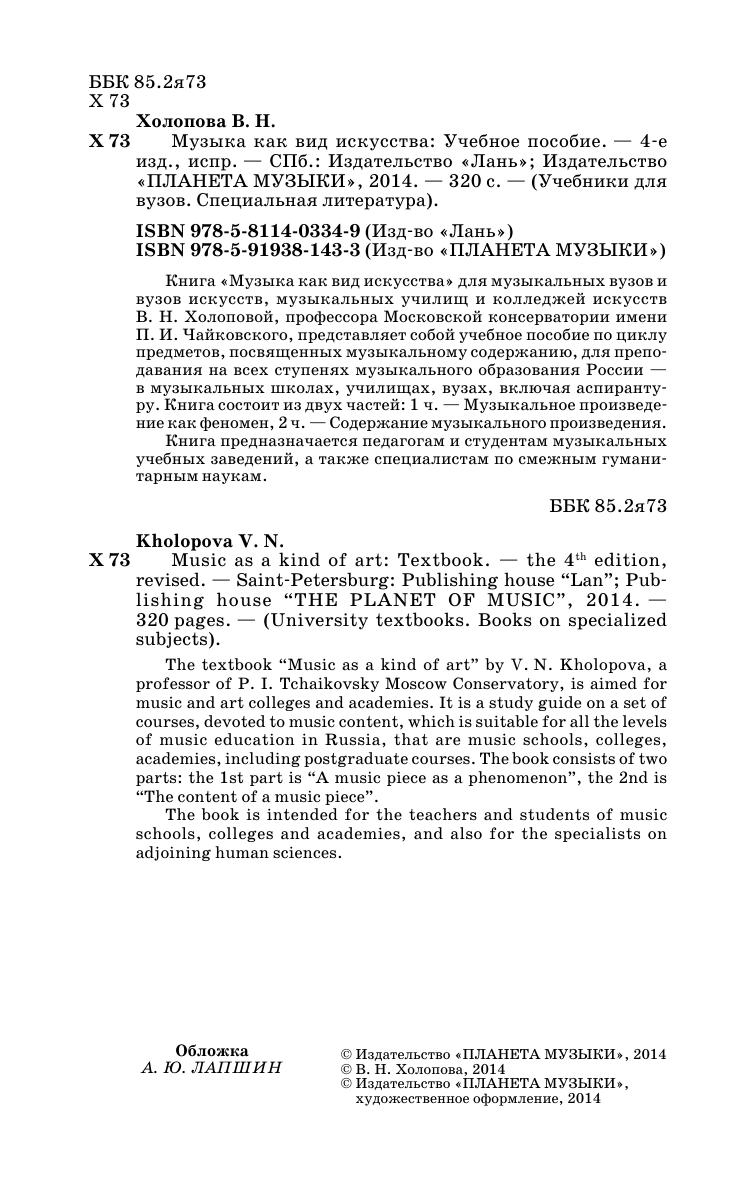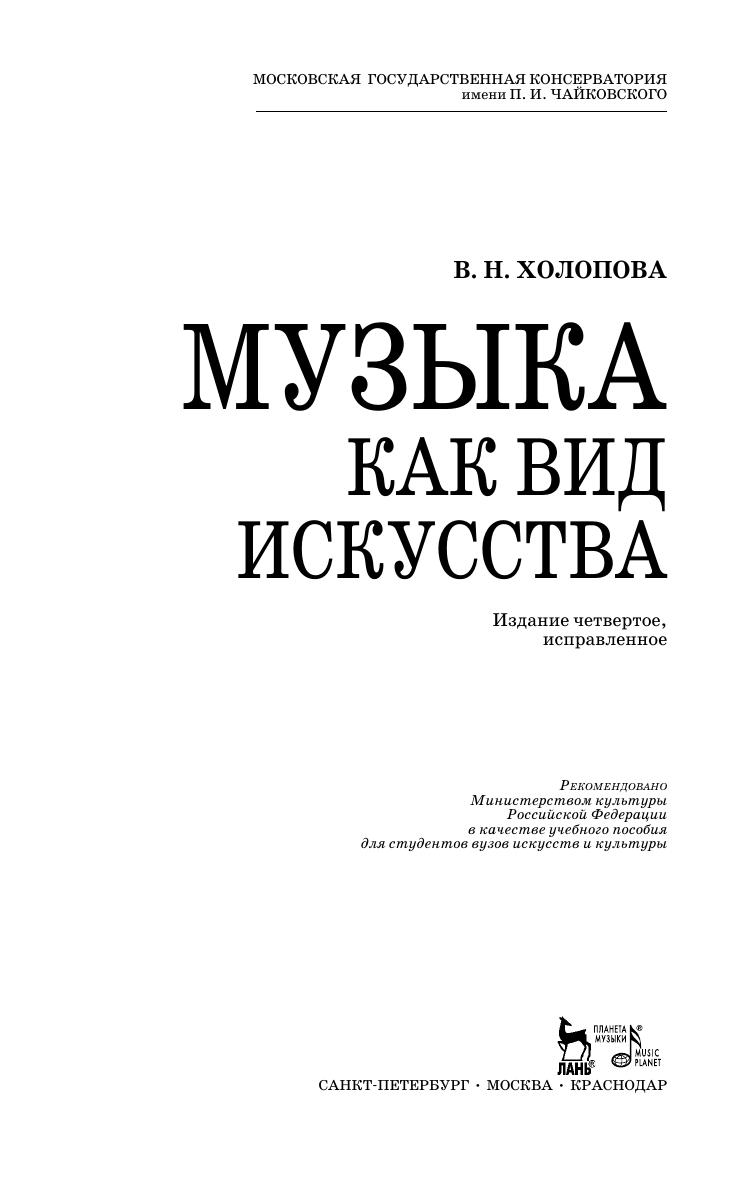 The textbook “Music as a kind of art” by V.N. Kholopova, a professor of P. I. Tchaikovsky Moscow Conservatory, is aimed for music and art colleges and academies. It is a study guide on a set of courses, devoted to music content, which is suitable for all the levels of music education in Russia, that are music schools, colleges, academies, including postgraduate courses. The book consists of two parts: the 1st part is “A music piece as a phenomenon”, the 2nd is “The content of a music piece”. The book is intended for the teachers and students of music schools, colleges and academies, and also for the specialists on adjoining human sciences.