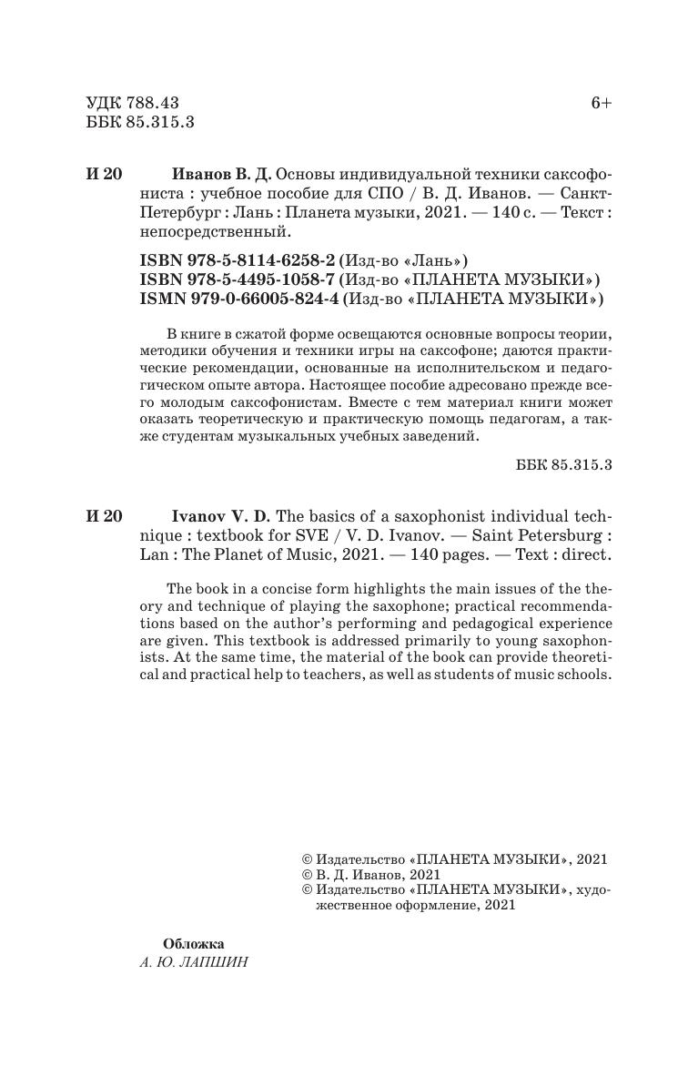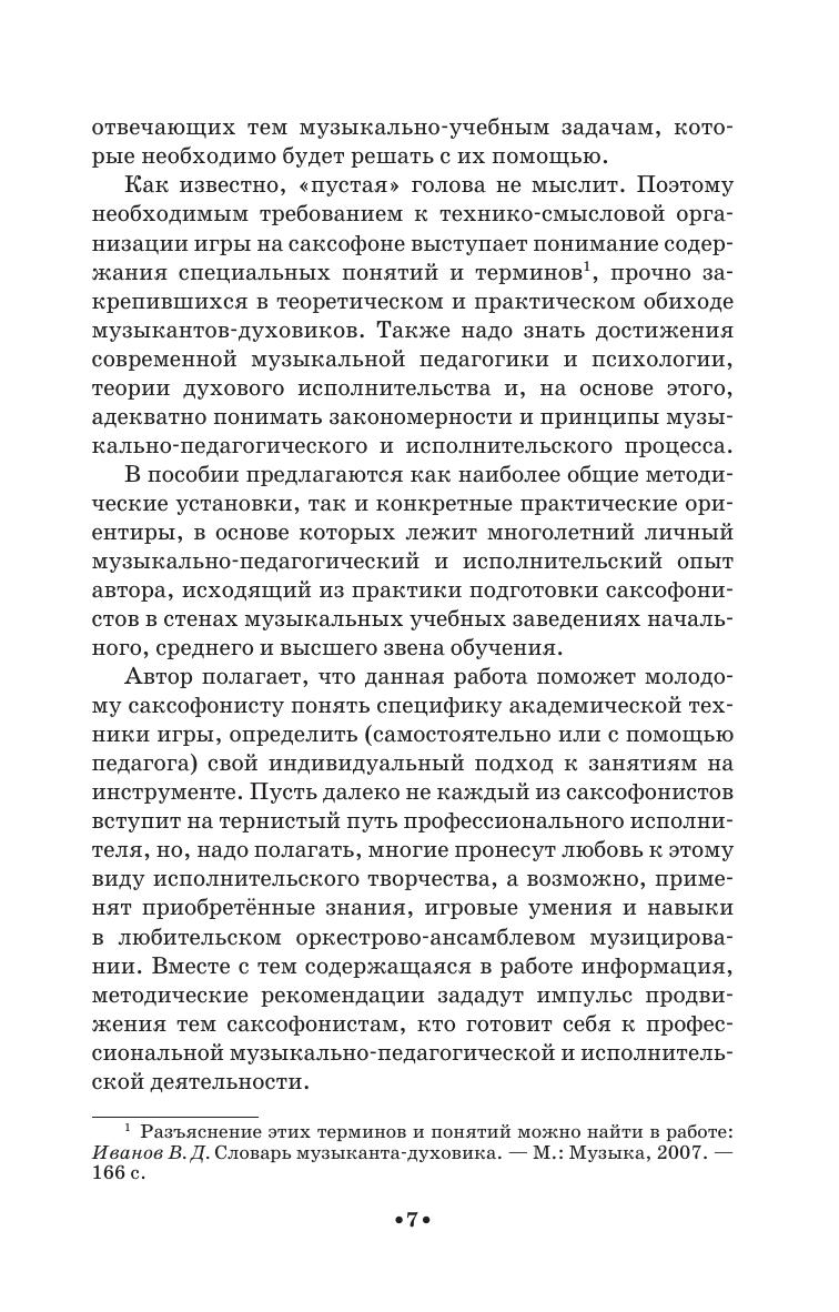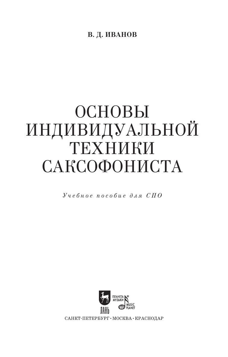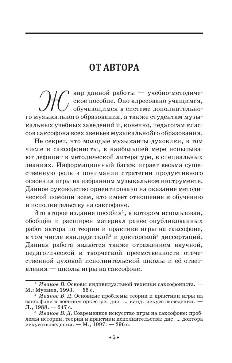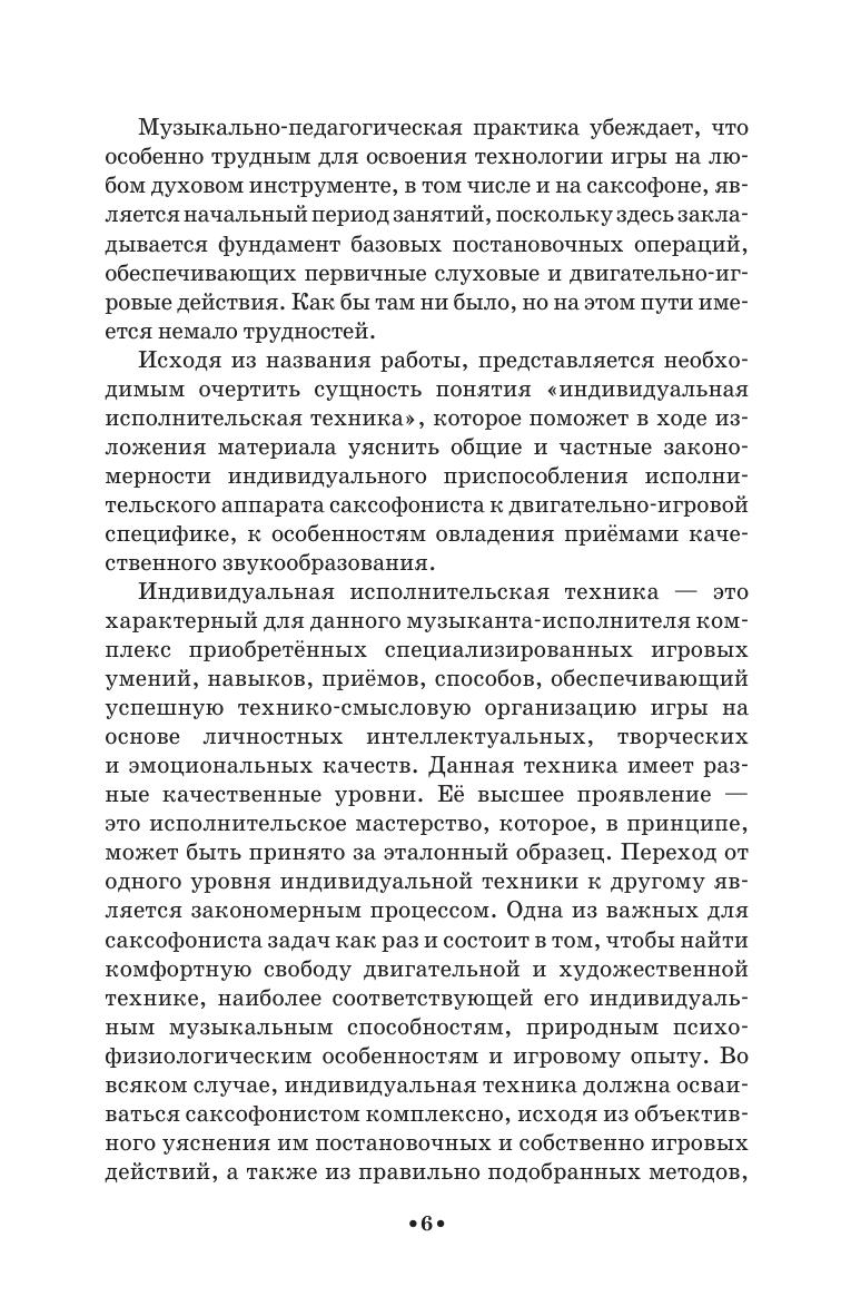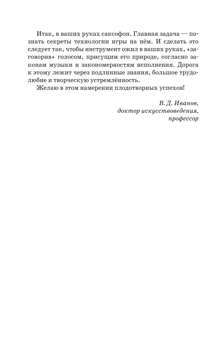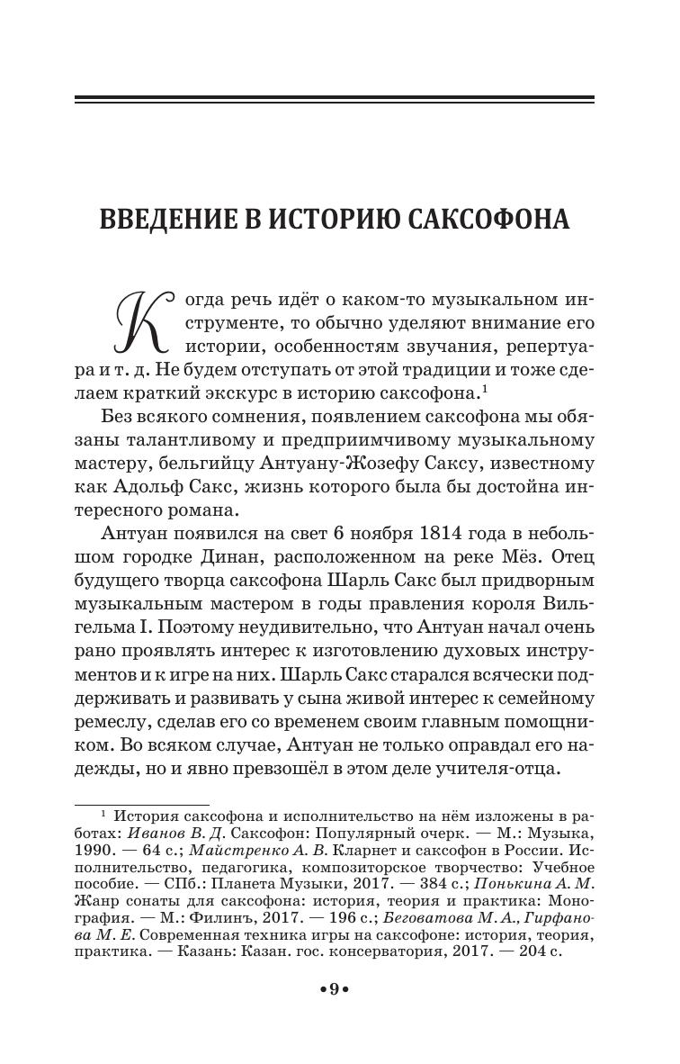 The book in a concise form highlights the main issues of the theory and technique of playing the saxophone; practical recommendations based on the author’s performing and pedagogical experience are given. This textbook is addressed primarily to young saxophonists. At the same time, the material of the book can provide theoretical and practical help to teachers, as well as students of music schools.