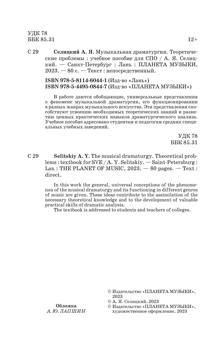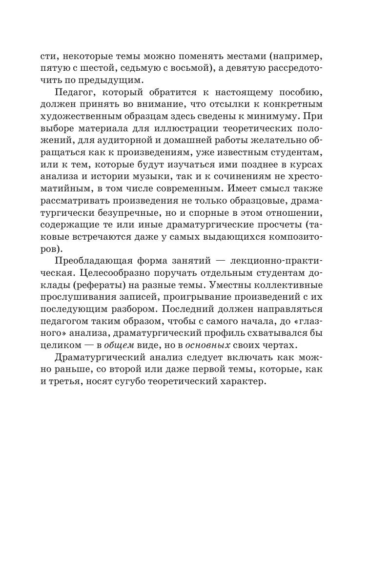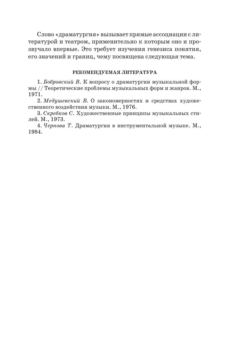 В работе даются обобщающие, универсальные представления о феномене музыкальной драматургии, его функционировании в разных жанрах музыкального искусства. Эти представления способствуют усвоению необходимых теоретических знаний и развитию ценных практических навыков драматургического анализа. Учебное пособие адресовано студентам и педагогам средних специальных учебных заведений. In this work the general, universal conceptions of the phenomenon of the musical dramaturgy and its functioning in different genres of music are given. These ideas contribute to the assimilation of the necessary theoretical knowledge and to the development of valuable practical skills of dramatic analysis. The textbook is addressed to students and teachers of colleges.