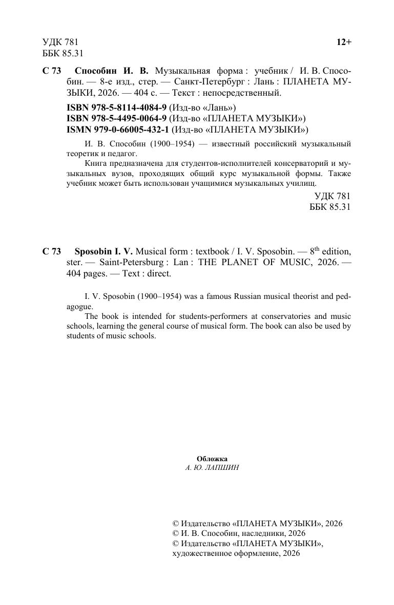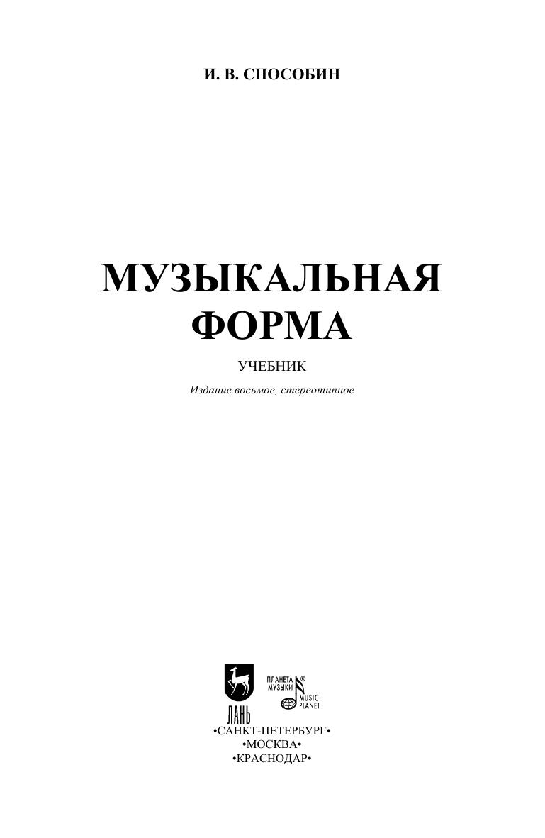 И. В. Способин (1900–1954) — известный российский музыкальный теоретик и педагог. Книга предназначена для студентов-исполнителей консерваторий и музыкальных вузов, проходящих общий курс музыкальной формы. Также учебник может быть использован учащимися музыкальных училищ.