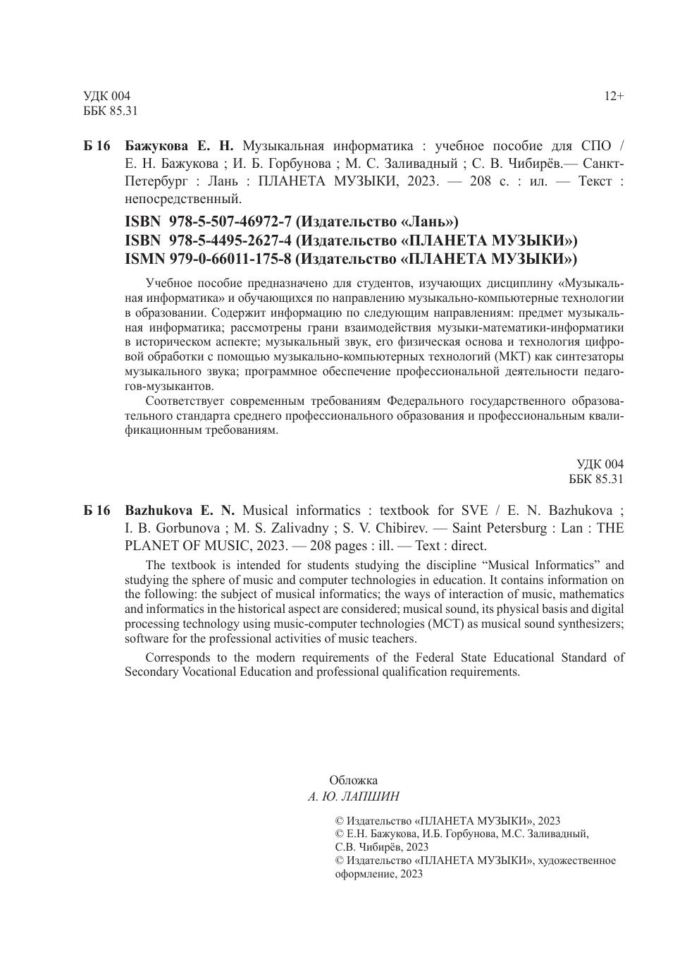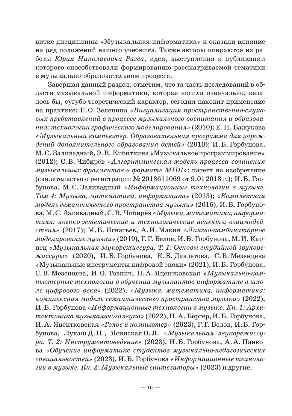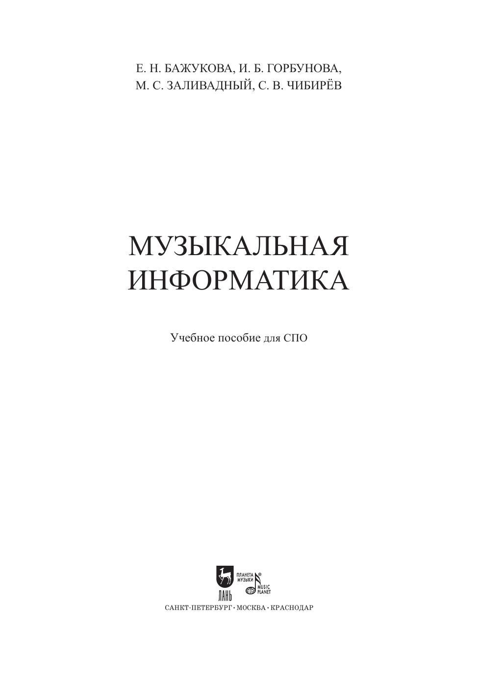 Учебное пособие предназначено для студентов, изучающих дисциплину «Музыкальная информатика» и обучающихся по направлению музыкально-компьютерные технологии в образовании. Содержит информацию по следующим направлениям: предмет музыкальная информатика, рассмотрены грани взаимодействия музыки-математики-информатики в историческом аспекте, музыкальный звук его физическая основа и технология цифровой обработки с помощью музыкально-компьютерных технологий (МКТ) как синтезаторы музыкального звука, программное обеспечение профессиональной деятельности педагогов-музыкантов. Соответствует современным требованиям Федерального государственного образовательного стандарта среднего профессионального образования и профессиональным квалификационным требованиям. The textbook is intended for students of higher schools and students of advanced training and professional retraining programs studying the discipline “Musical Informatics” and studying the sphere of music and computer technologies in education. It contains information on the following: the subject of musical informatics, the ways of interaction of music, mathematics and informatics in the historical aspect are considered, musical sound, its physical basis and digital processing technology using music-computer technologies (MCT) as musical sound synthesizers, software for the professional activities of music teachers. Corresponds to the modern requirements of the Federal State Educational Standard of Secondary Vocational Education and professional qualification requirements.
