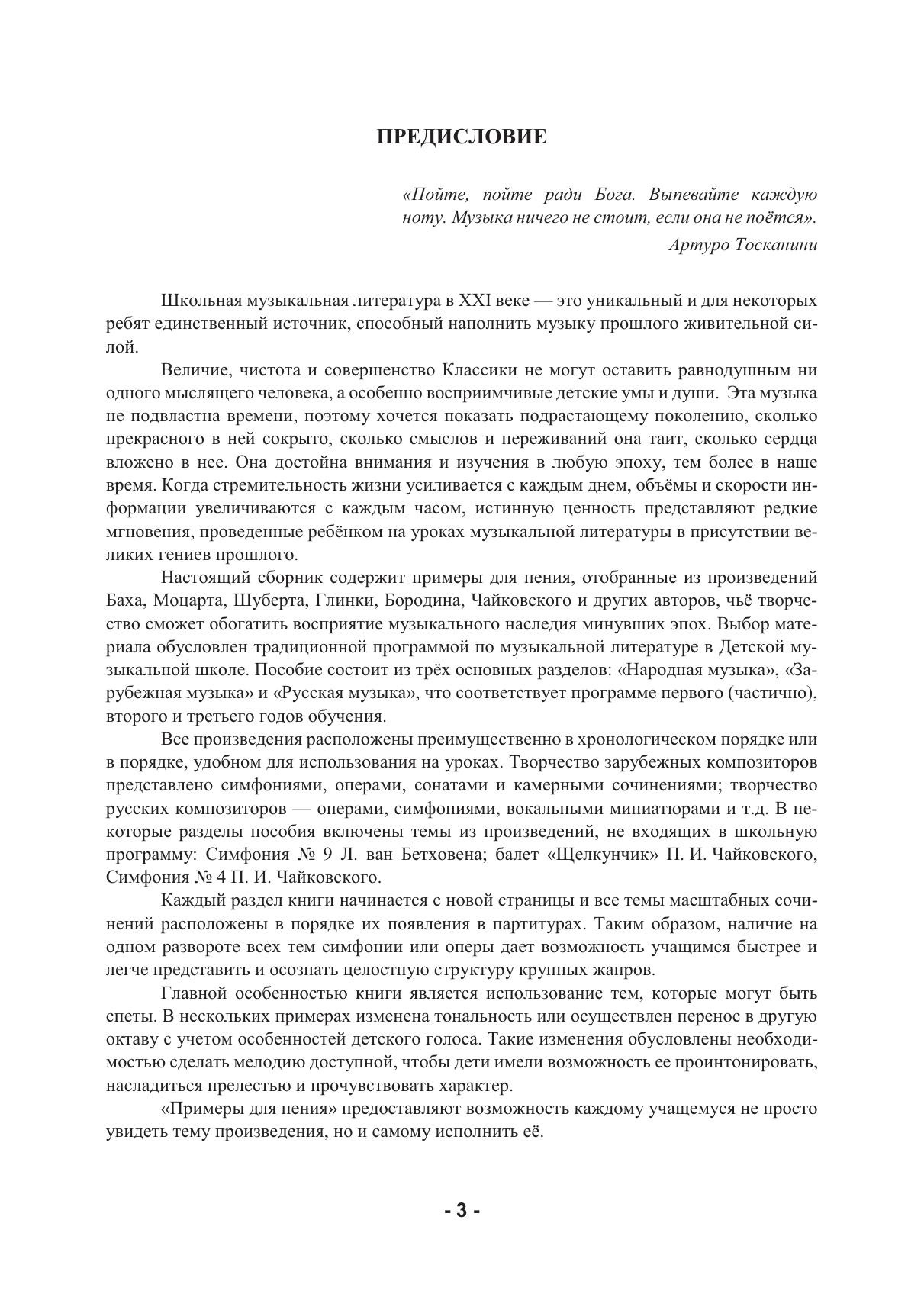 Данный сборник включает в себя примеры для пения из классических произведений западной и русской музыки. Примеры сгруппированы в соответствии со школьной программой по музыкальной литературе. Материал охватывает период творчества И. С. Баха, венских классиков, М. И. Глинки, композиторов «Могучей кучки», П. И.Чайковского.