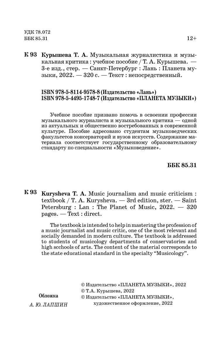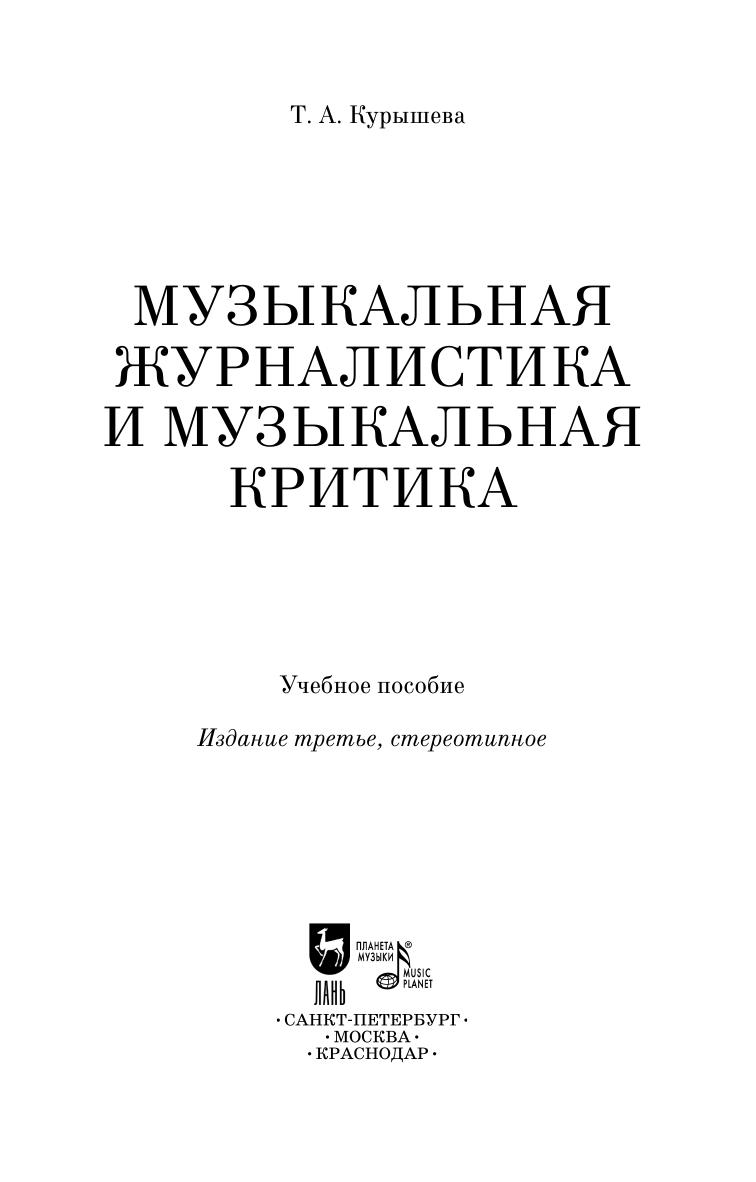 The textbook is intended to help in mastering the profession of a music journalist and music critic, one of the most relevant and socially demanded in modern culture. The textbook is addressed to students of musicology departments of conservatories and high scchools of arts. The content of the material corresponds to the state educational standard in the specialty "Musicology".