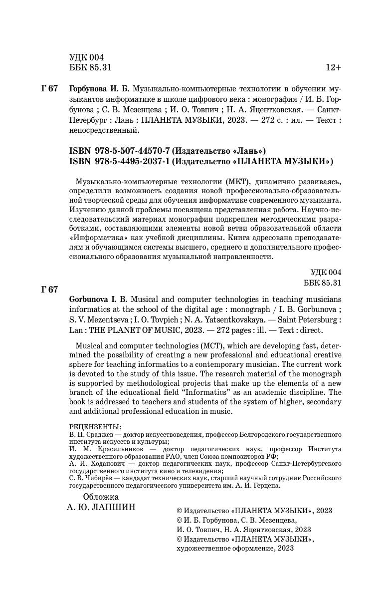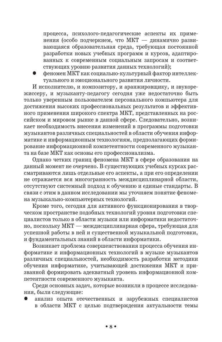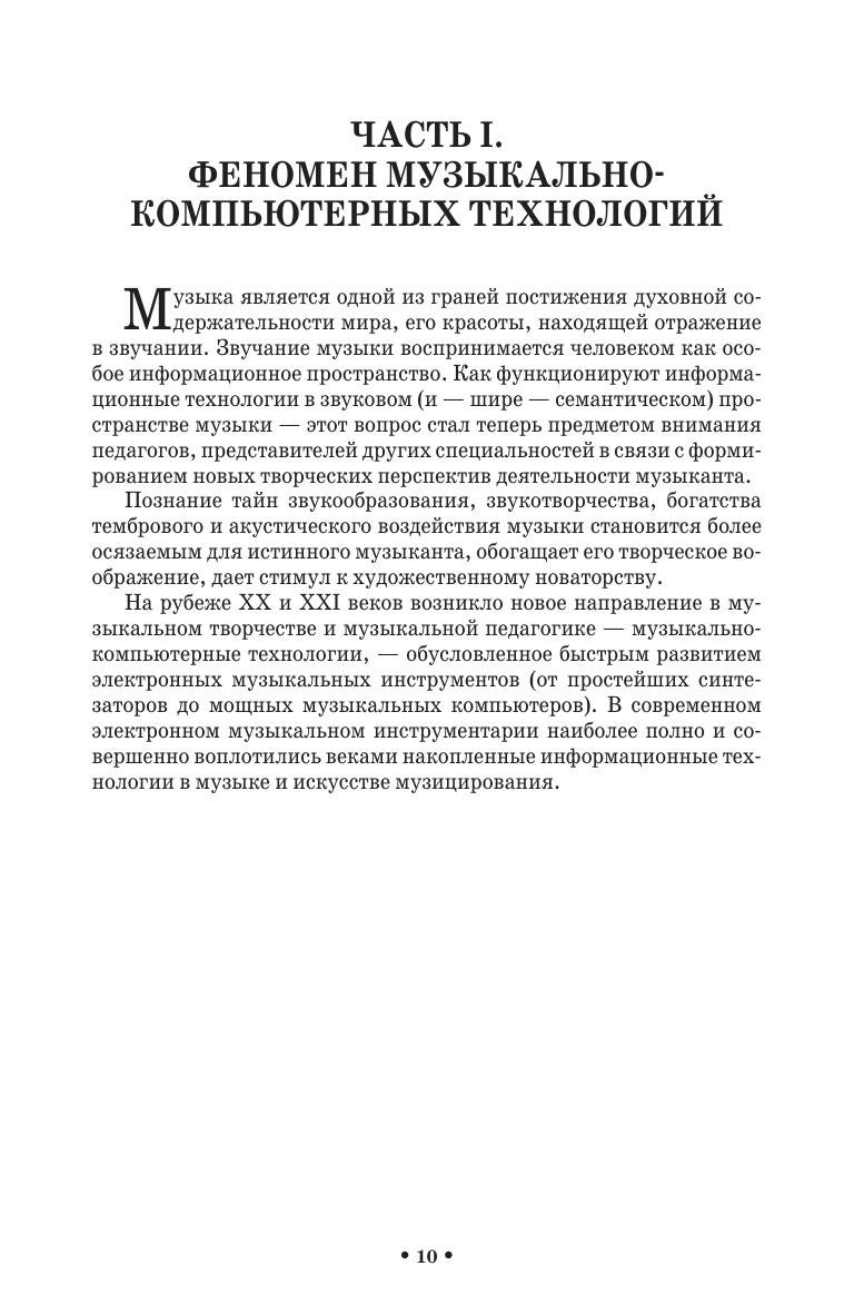 Музыкально-компьютерные технологии (МКТ), динамично развиваясь, определили возможность создания новой профессионально-образовательной творческой среды для обучения информатике современного музыканта. Изучению данной проблемы посвящена представленная работа. Научно-исследовательский материал монографии, подкреплен методическими разработками, составляющими элементы новой ветви образовательной области «Информатика» как учебной дисциплины. Книга адресована преподавателям и обучающимся системы высшего, среднего и дополнительного профессионального образования музыкальной направленности.