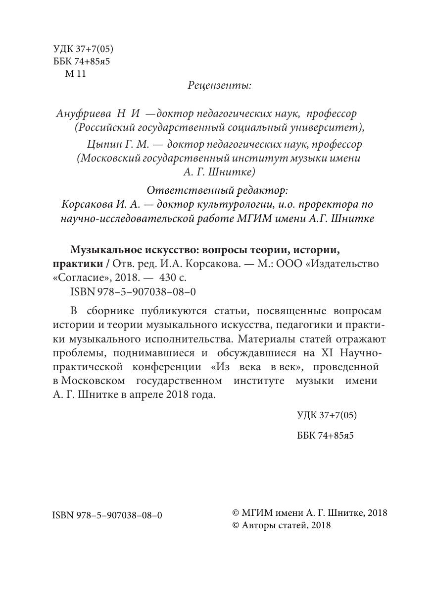 В сборнике публикуются статьи, посвященные вопросам истории и теории музыкального искусства, педагогики и практики музыкального исполнительства. Материалы статей отражают проблемы, поднимавшиеся и обсуждавшиеся на XI Научно-практической конференции «Из века в век», проведенной в Московском государственном институте музыки имени А. Г. Шнитке в апреле 2018 года.