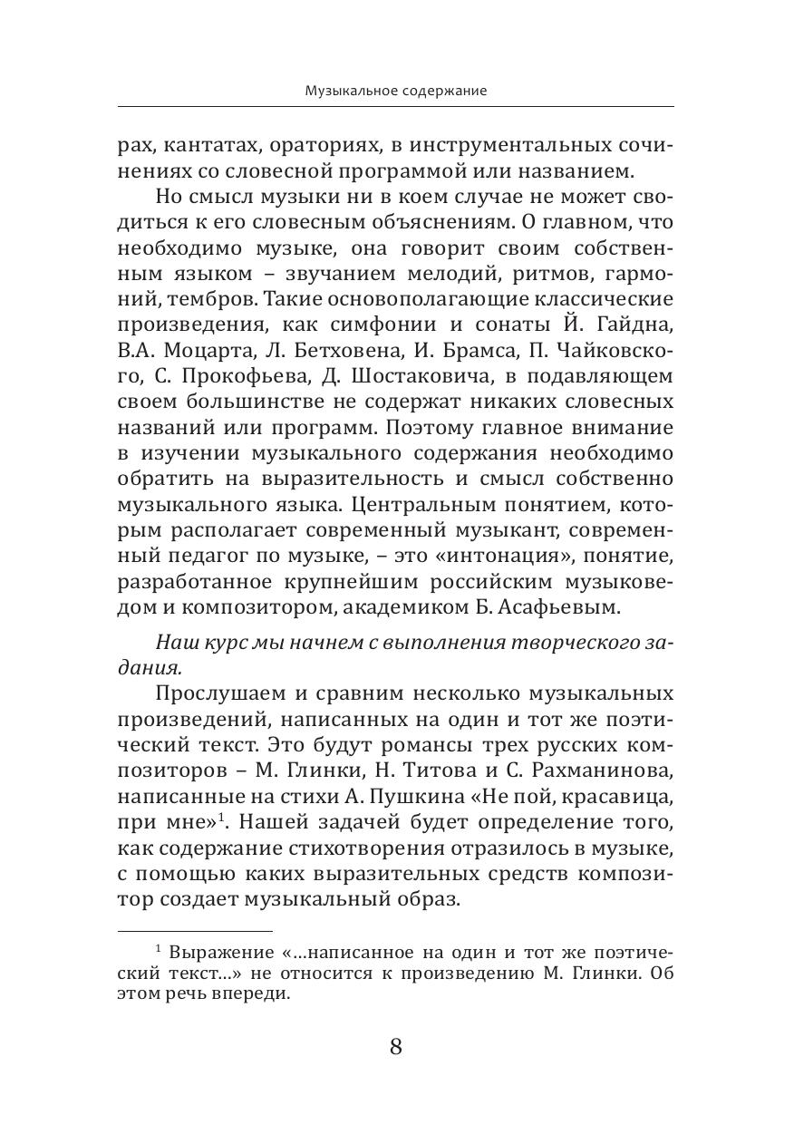 Впервые созданное В. Н. Холоповой, Н. В. Бойцовой и Е. М. Акишиной учебное пособие “Музыкальное содержание” является базовым изданием для всего научно-педагогического направления по музыкальному содержанию в России. В нем изложены такие важнейшие теоретические понятия, как музыкальная интонация, базовые эмоции, специальное и неспециальное содержание, три стороны музыкального содержания и др. и определена их роль в эпоху барокко, классики, романтизма, XX–XXI веков. Емкие определения и необходимые нотные примеры делают данное учебное пособие доступным, полезным, информативным и для студентов и для преподавателей специализированных музыкальных учреждений, а также для широкого круга читателей, интересующихся академической музыкой. The “Music Content” textbook, newly created by V. N. Kholopova, N. V. Boitsova and Y. M. Akishina is the basic publication on music content for the entire scientific and pedagogical sphere in Russia. It states such important theoretical concepts as music intonation, basic emotions, special and non-special content, three aspects of music content, etc. and defines their role in the era of baroque, classics, romanticism, 20th and 21st centuries. Lapidary definitions and necessary musical examples make this textbook understandable, useful, informative both for students and teachers of specialized musical institutions, as well as for a wide range of readers interested in academic music.