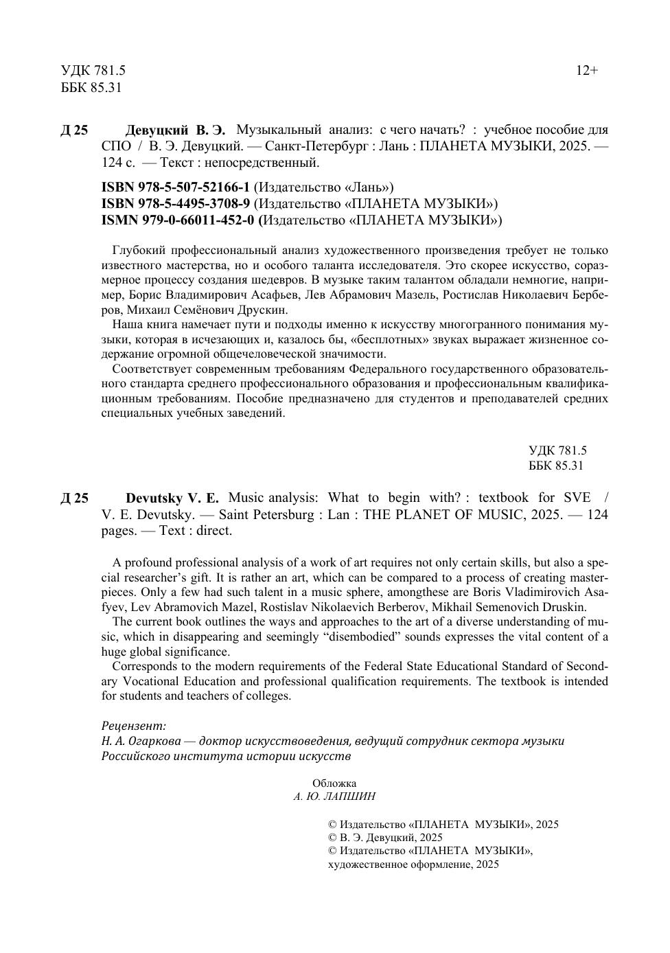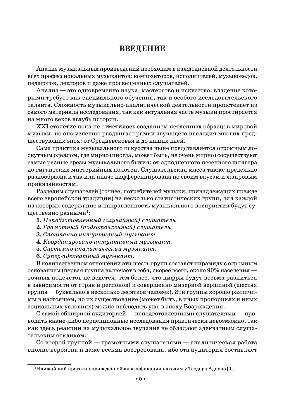 Глубокий профессиональный анализ художественного произведения требует не только известного мастерства, но и особого таланта исследователя. Это скорее искусство, соразмерное процессу создания шедевров. В музыке таким талантом обладали немногие, например, Борис Владимирович Асафьев, Лев Абрамович Мазель, Ростислав Николаевич Берберов, Михаил Семёнович Друскин. Наша книга намечает пути и подходы именно к искусству многогранного понимания музыки, которая в исчезающих и, казалось бы, «бесплотных» звуках, выражает жизненное содержание огромной общечеловеческой значимости. Соответствует современным требованиям Федерального государственного образовательного стандарта среднего профессионального образования и профессиональным квалификационным требованиям. Пособие предназначено для студентов и преподавателей средних специальных учебных заведений, а также композиторам, исполнителям и всем интересующимся проблемами музыкального творчества. A profound professional analysis of a work of art requires not only certain skills, but also a special researcher’s gift. It is rather an art, which can be compared to a process of creating master-pieces. Only a few had such talent in a music sphere, amongthese are Boris Vladimirovich Asafyev, Lev Abramovich Mazel, Rostislav Nikolaevich Berberov, Mikhail Semenovich Druskin. The current book outlines the ways and approaches to the art of a diverse understanding of music, which in disappearing and seemingly “disembodied” sounds expresses the vital content of a huge global significance. Corresponds to the modern requirements of the Federal State Educational Standard of Secondary Vocational Education and professional qualification requirements. The textbook is intended for students and teachers of colleges.