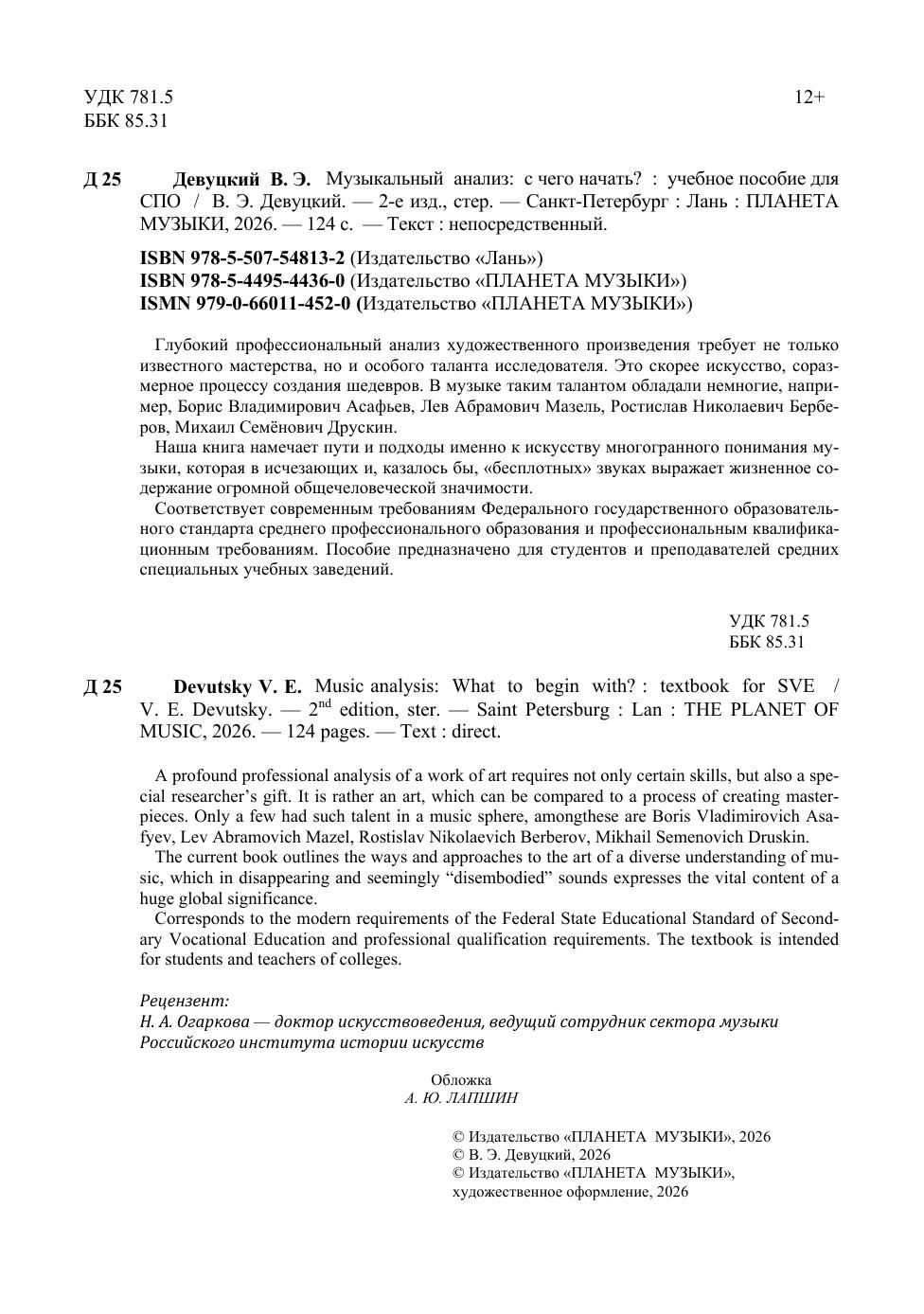 Глубокий профессиональный анализ художественного произведения требует не только известного мастерства, но и особого таланта исследователя. Это скорее искусство, соразмерное процессу создания шедевров. В музыке таким талантом обладали немногие, например, Борис Владимирович Асафьев, Лев Абрамович Мазель, Ростислав Николаевич Берберов, Михаил Семёнович Друскин. Наша книга намечает пути и подходы именно к искусству многогранного понимания музыки, которая в исчезающих и, казалось бы, «бесплотных» звуках, выражает жизненное содержание огромной общечеловеческой значимости. Соответствует современным требованиям Федерального государственного образовательного стандарта среднего профессионального образования и профессиональным квалификационным требованиям. Пособие предназначено для студентов и преподавателей средних специальных учебных заведений, а также композиторам, исполнителям и всем интересующимся проблемами музыкального творчества. A profound professional analysis of a work of art requires not only certain skills, but also a special researcher’s gift. It is rather an art, which can be compared to a process of creating master-pieces. Only a few had such talent in a music sphere, amongthese are Boris Vladimirovich Asafyev, Lev Abramovich Mazel, Rostislav Nikolaevich Berberov, Mikhail Semenovich Druskin. The current book outlines the ways and approaches to the art of a diverse understanding of music, which in disappearing and seemingly “disembodied” sounds expresses the vital content of a huge global significance. Corresponds to the modern requirements of the Federal State Educational Standard of Secondary Vocational Education and professional qualification requirements. The textbook is intended for students and teachers of colleges.