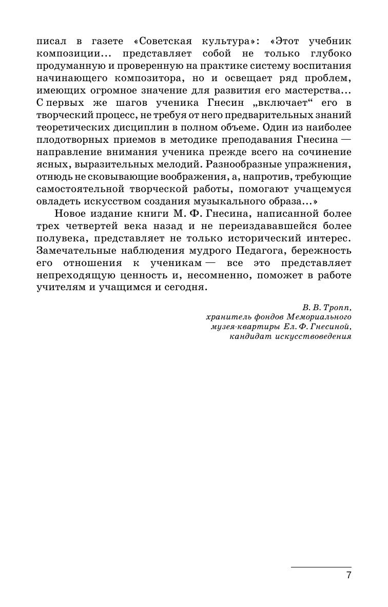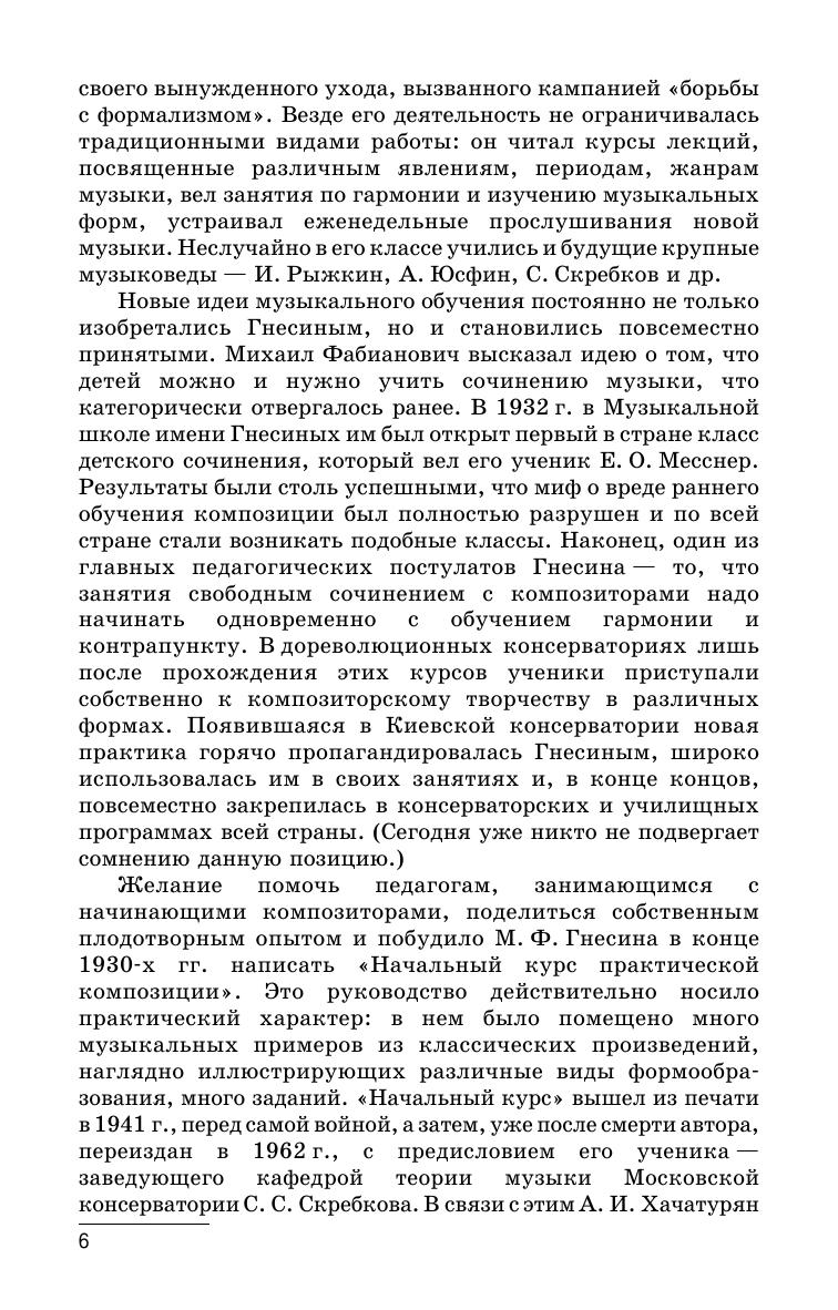 Целью книги Михаила Фабиановича Гнесина является помощь в первоначальном обучении и в известной степени — самообучении практической композиции. Читатели не встретят в этой книге полное и новое разрешение теоретических проблем, связанных с вопросами музыкального формообразования. В качестве практического руководства данная книга могла бы включить лишь целесообразный подбор упражнений, на опыте показавших свою пригодность в процессе обучения композиции. Однако в состав книги введен еще ряд статей методического и отчасти чисто теоретического характера. Книга адресована педагогам, учащимся и музыкантам-теоретикам. Purpose of the book, written by of Mikhail Fabianovich Gnesin, is help in initial training and to a certain extent — the self-learning of the practical composition. Readers will not meet in this book a complete and new solution to theoretical problems related to questions of musical form. As a practical guide, this book could include only an expedient selection of exercises that have shown their experience in the process of learning the composition. However, the book includes a number of articles of methodical and partly purely theoretical nature. The book is addressed to teachers, pupils and musicians-theoreticians.