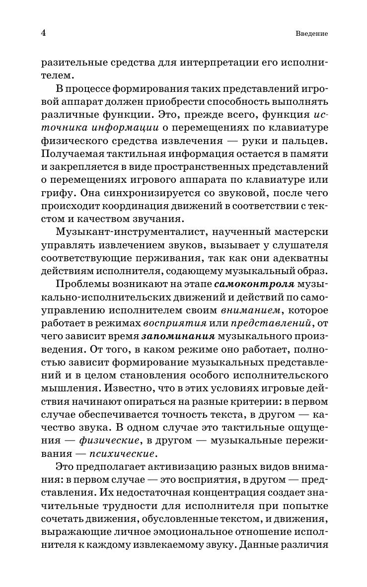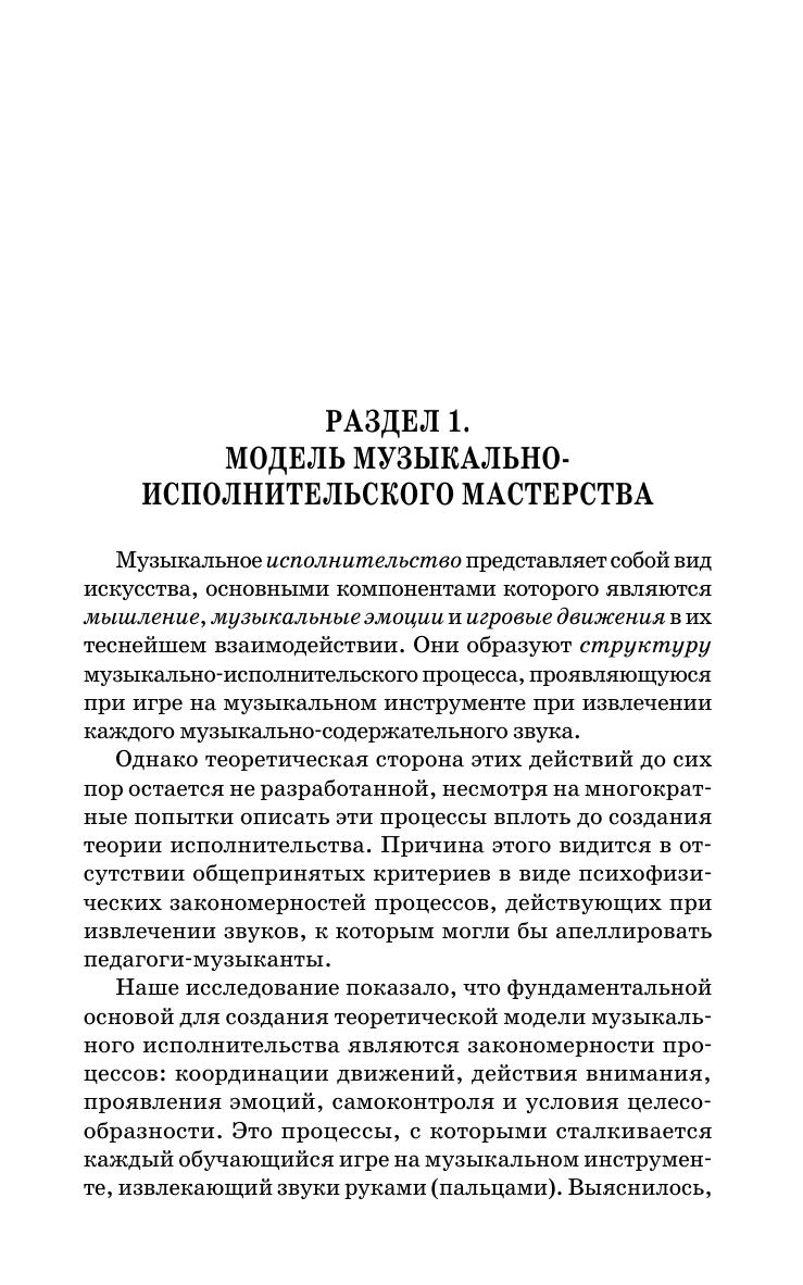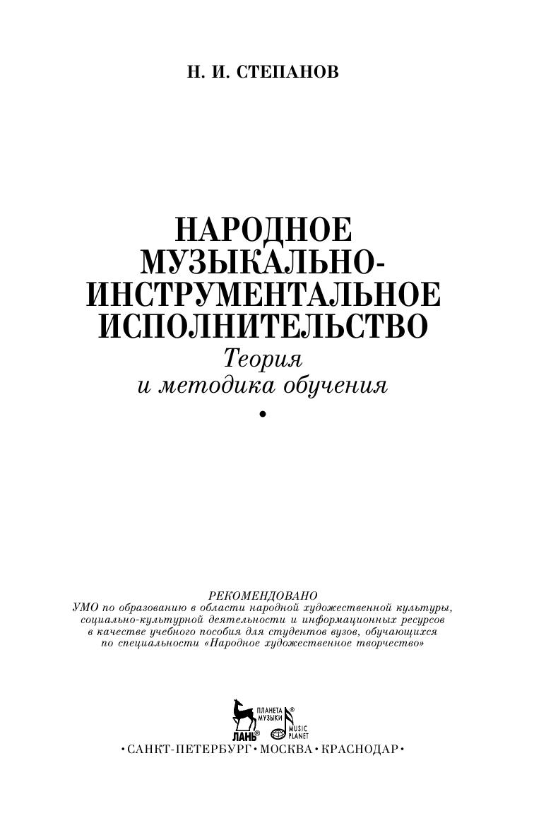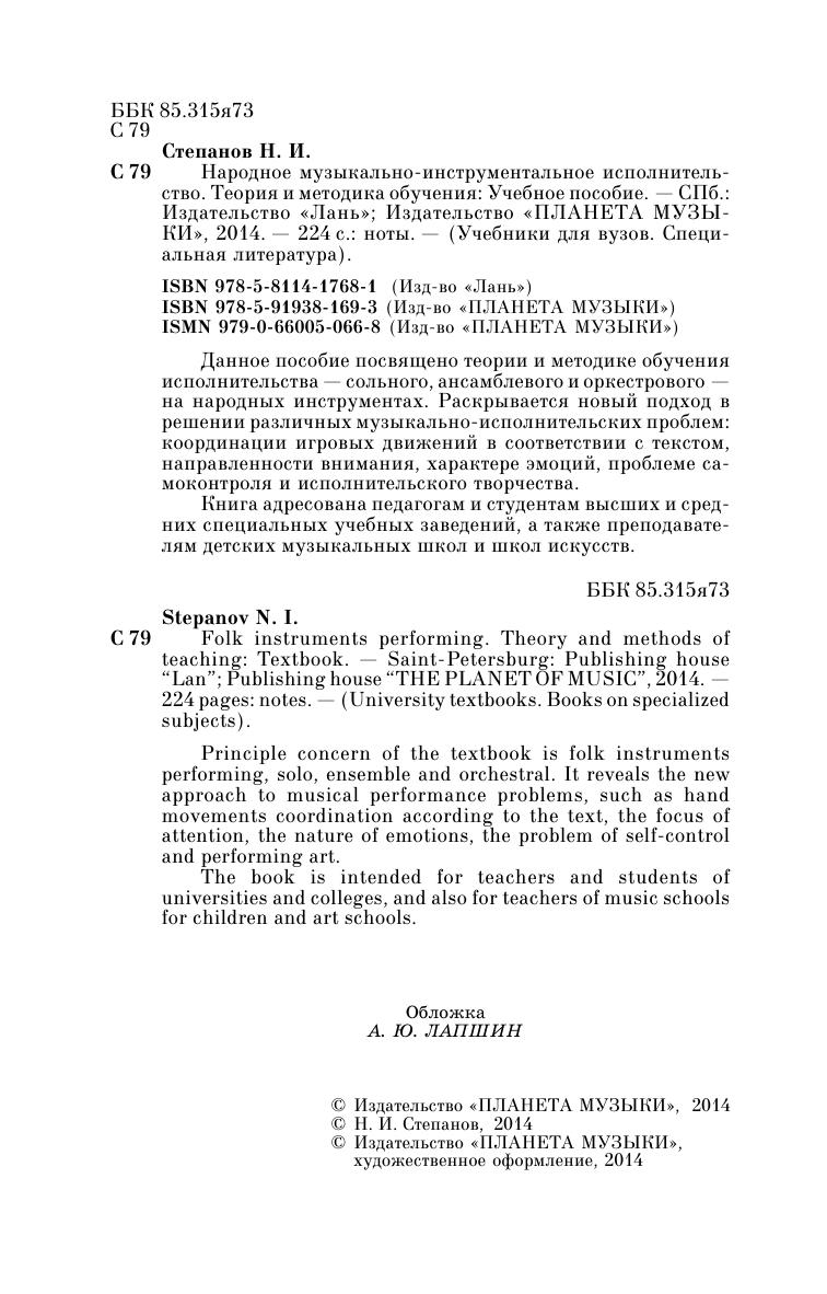 Principle concern of the textbook is folk instruments performing, solo, ensemble and orchestral. It reveals the new approach to musical performance problems, such as hand movements coordination according to the text, the focus of attention, the nature of emotions, self-control. The book is intended for teachers and students of universities and colleges, and also for teachers of music schools for children and art schools.