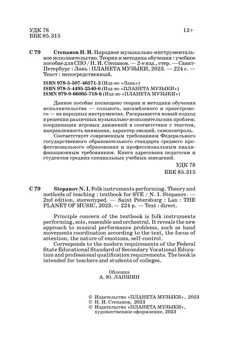 Principle concern of the textbook is folk instruments performing, solo, ensemble and orchestral. It reveals the new approach to musical performance problems, such as hand movements coordination according to the text, the focus of attention, the nature of emotions, self-control.