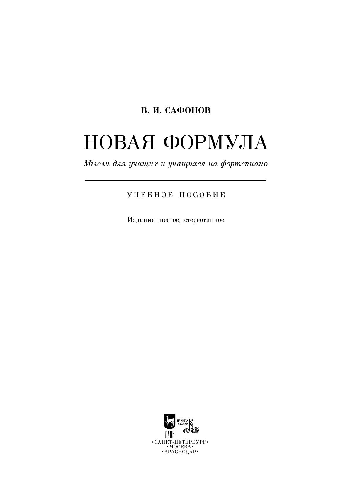Василий Ильич Сафонов (1852–1918) – крупный русский дирижер, пианист, педагог, общественный деятель, директор Московской консерватории. Среди учеников В.И.Сафонова целая плеяда выдающихся музыкантов: Скрябин, Гречанинов, Николаев, Гедике, Левин, Гнесина, Метнер и многие другие. Новаторское пособие по игре на фортепиано «Новая формула» впервые увидело свет в Лондоне в 1916 г. на английском языке (“New Formula for The Piano Teacher and Piano Student”), затем последовали переводы на девять языков, в том числе русский. Учебное пособие предназначено пианистам, учащимся, студентам и педагогам музыкальных учебных заведений.