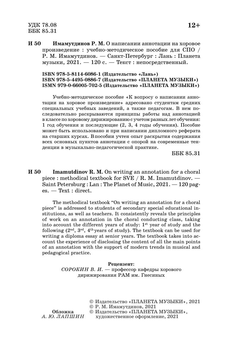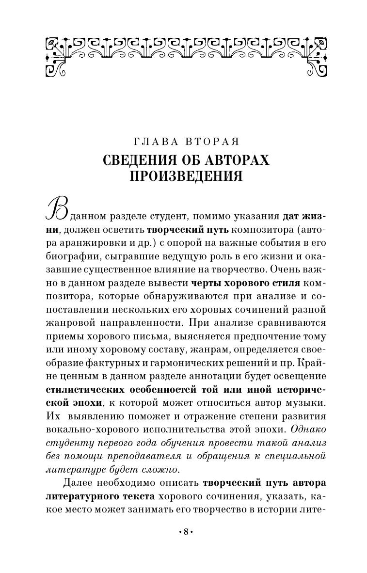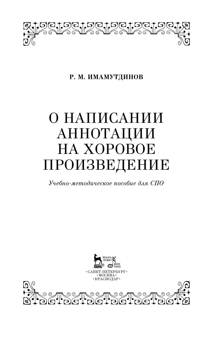Учебное пособие "О написании аннотации на хоровое произведение" адресовано студентам средних специальных учебных заведений, а также педагогам. В нем последовательно раскрываются принципы работы над аннотацией в классе по хоровому дирижированию с учетом разных лет обучения: 1 год обучения и последующие (2, 3, 4 годы обучения). Пособие может быть использовано и при написании дипломного реферата на старших курсах. В пособии учтен опыт раскрытия содержания всех основных пунктов аннотации с опорой на современные тенденции в музыкально-педагогической практике.