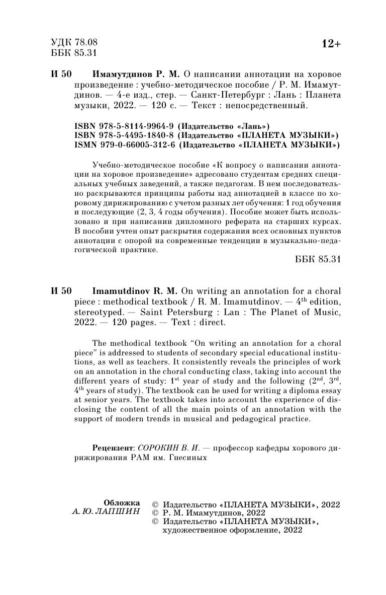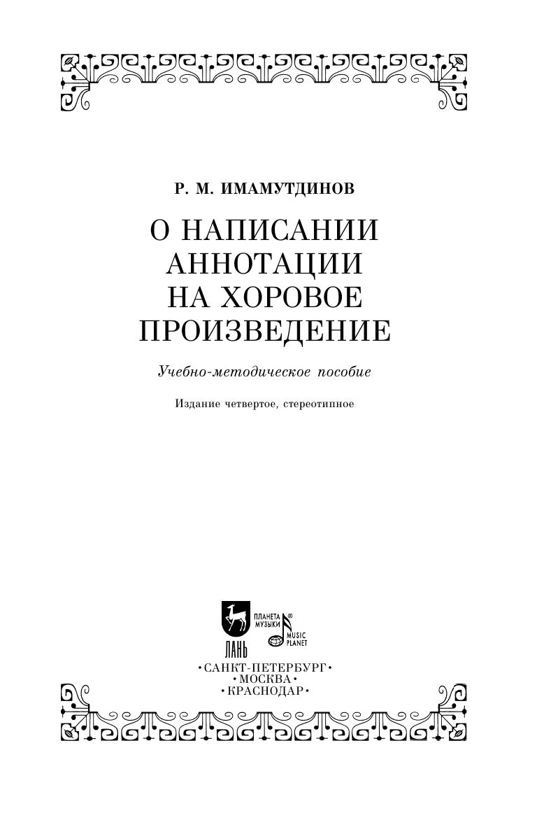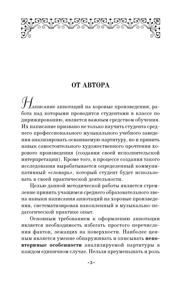 Учебное пособие "О написании аннотации на хоровое произведение" адресовано студентам средних специальных учебных заведений, а также педагогам. В нем последовательно раскрываются принципы работы над аннотацией в классе по хоровому дирижированию с учетом разных лет обучения: 1 год обучения и последующие (2, 3, 4 годы обучения). Пособие может быть использовано и при написании дипломного реферата на старших курсах. В пособии учтен опыт раскрытия содержания всех основных пунктов аннотации с опорой на современные тенденции в музыкально-педагогической практике.