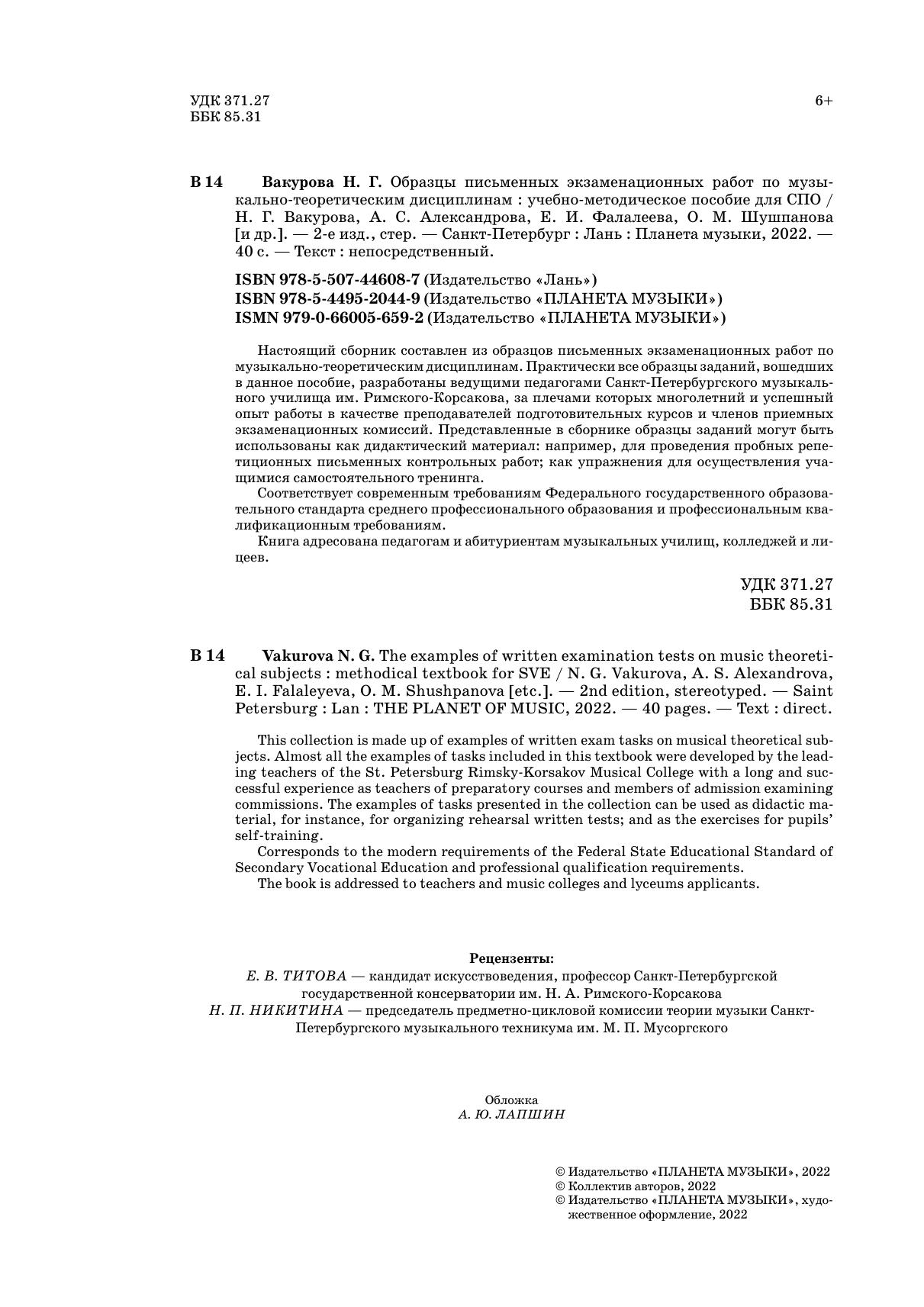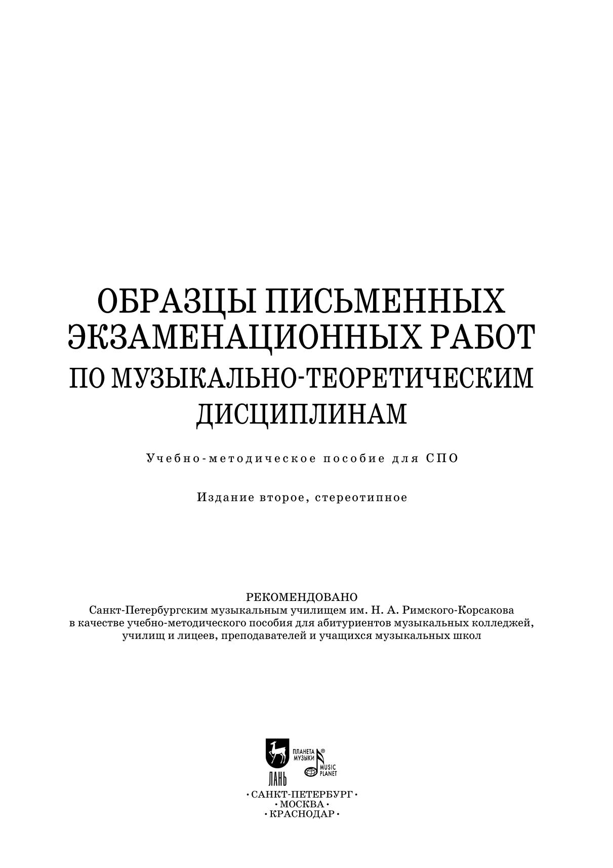 This collection is made up of examples of written exam tasks on musical theoretical subjects. Almost all the examples of tasks included in this textbook were developed by the leading teachers of the St. Petersburg Rimsky-Korsakov Musical College with a long and successful experience as teachers of preparatory courses and members of admission examining commissions. The examples of tasks presented in the collection can be used as didactic material, for instance, for organizing rehearsal written tests; and as the exercises for pupils’ self-training.