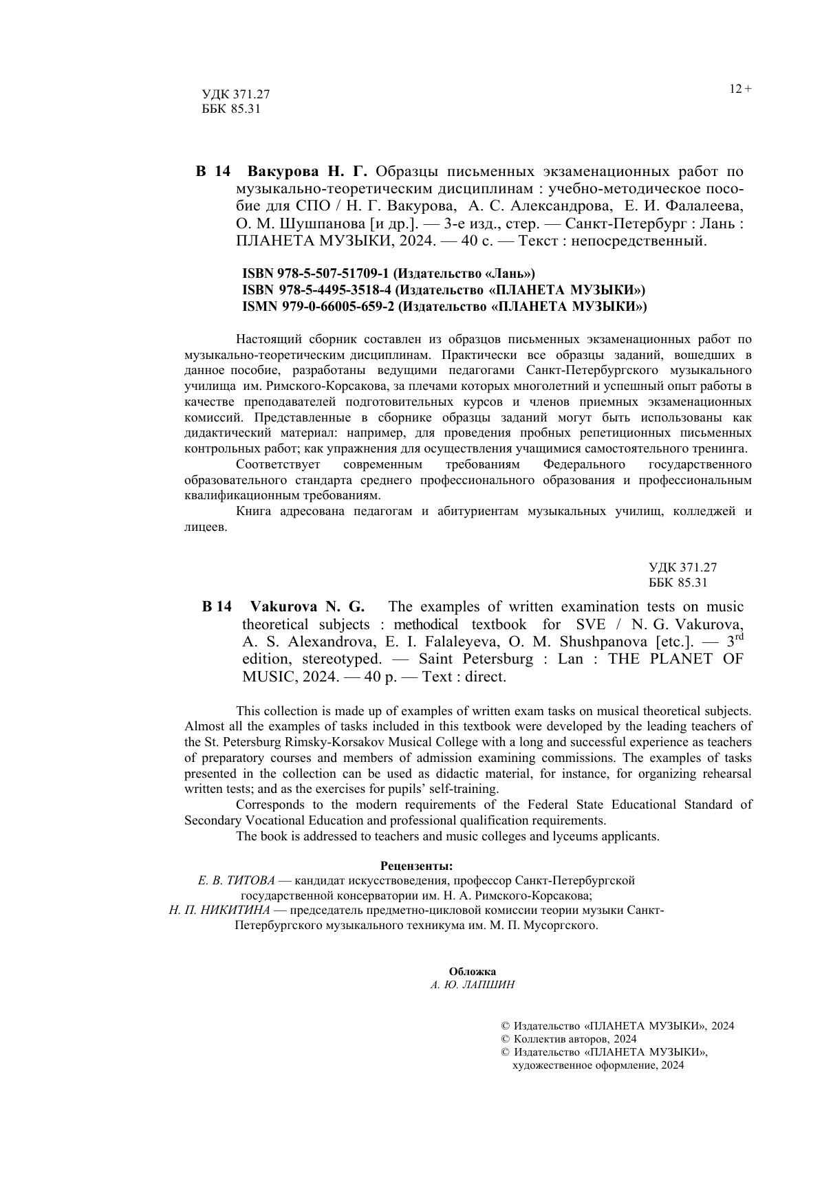 Настоящий сборник составлен из образцов письменных экзаменационных работ по музыкально-теоретическим дисциплинам. Практически все образцы заданий, вошедших в данное пособие, разработаны ведущими педагогами Санкт-Петербургского музыкального училища им. Римского-Корсакова, за плечами которых многолетний и успешный опыт работы в качестве преподавателей подготовительных курсов и членов приемных экзаменационных комиссий. Представленные в сборнике образцы заданий могут быть использованы как дидактический материал: например, для проведения пробных репетиционных письменных контрольных работ, как упражнения для осуществления учащимися самостоятельного тренинга. Книга адресована педагогам и абитуриентам музыкальных училищ, колледжей и лицеев. This collection is made up of examples of written exam tasks on musical theoretical subjects. Almost all the examples of tasks included in this textbook were developed by the leading teachers of the St. Petersburg Rimsky-Korsakov Musical College with a long and successful experience as teachers of preparatory courses and members of admission examining commissions. The examples of tasks presented in the collection can be used as didactic material, for instance, for organizing rehearsal written tests, and as the exercises for pupils’ self-training. The book is addressed to teachers and music colleges and lyceums applicants.
