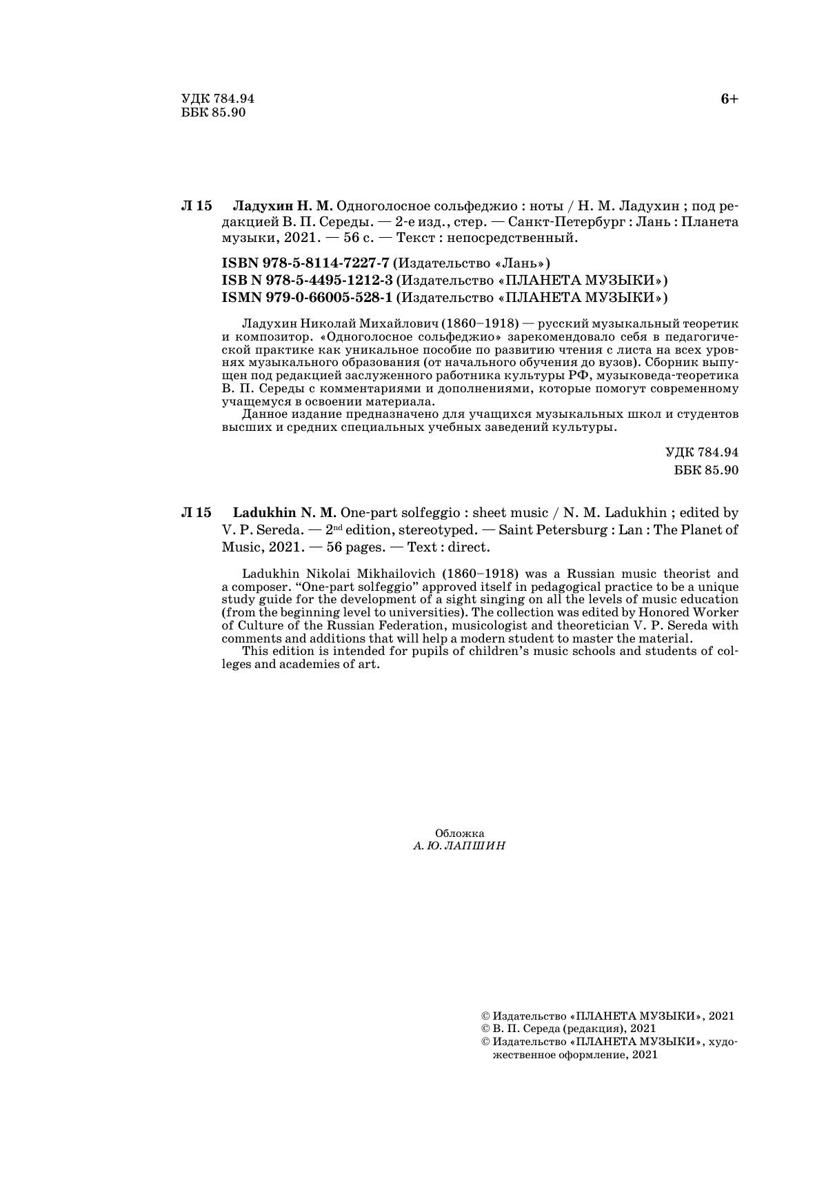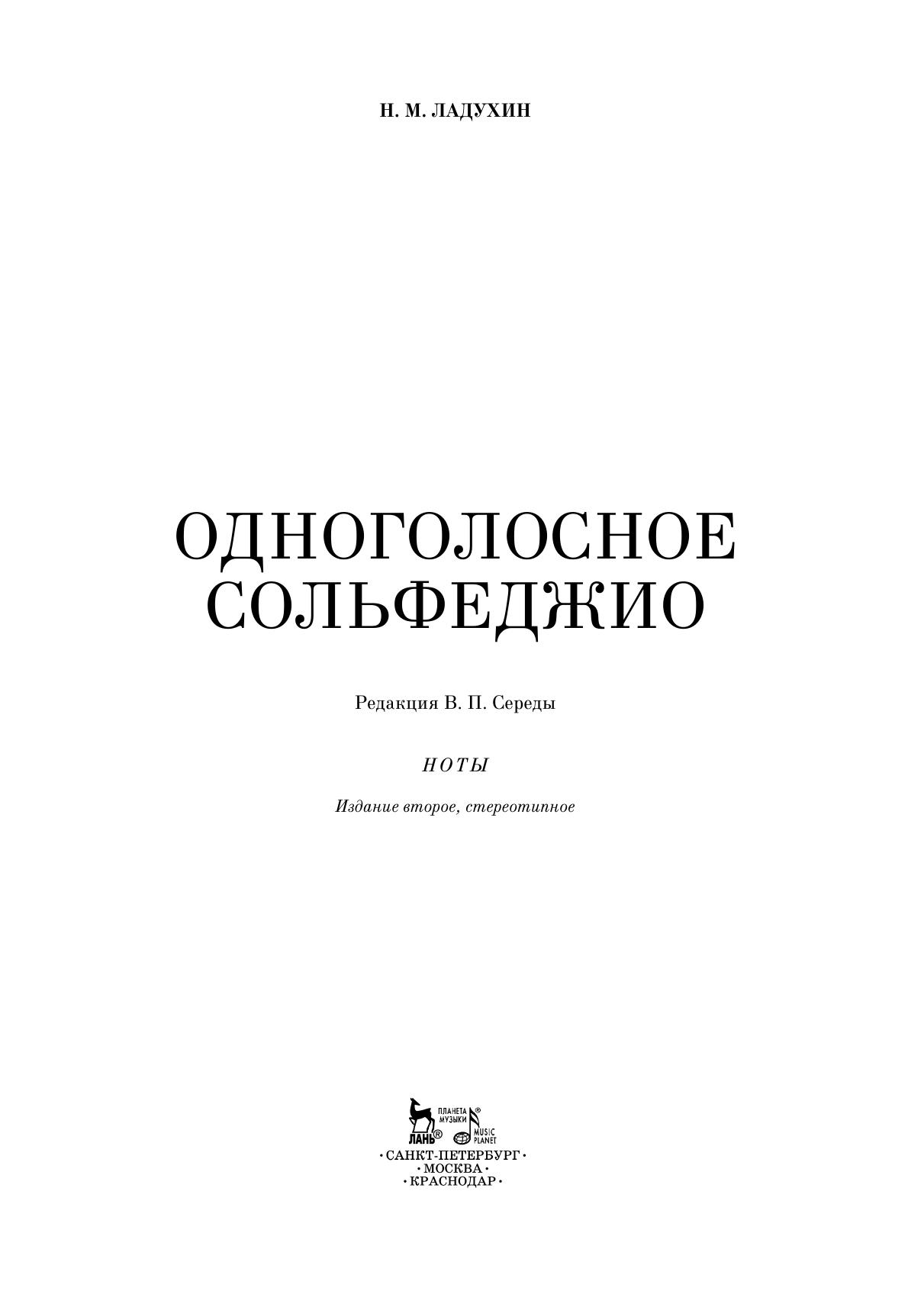 Ладухин Николай Михайлович (1860–1918) — русский музыкальный теоретик и композитор. «Одноголосное сольфеджио» зарекомендовало себя в педагогической практике как уникальное пособие по развитию чтения с листа на всех уровнях музыкального образования (от начального обучения до вузов). Сборник выпущен под редакцией заслуженного работника культуры РФ, музыковеда-теоретика В. П. Середы с комментариями и дополнениями, которые помогут современному учащемуся в освоении материала.
