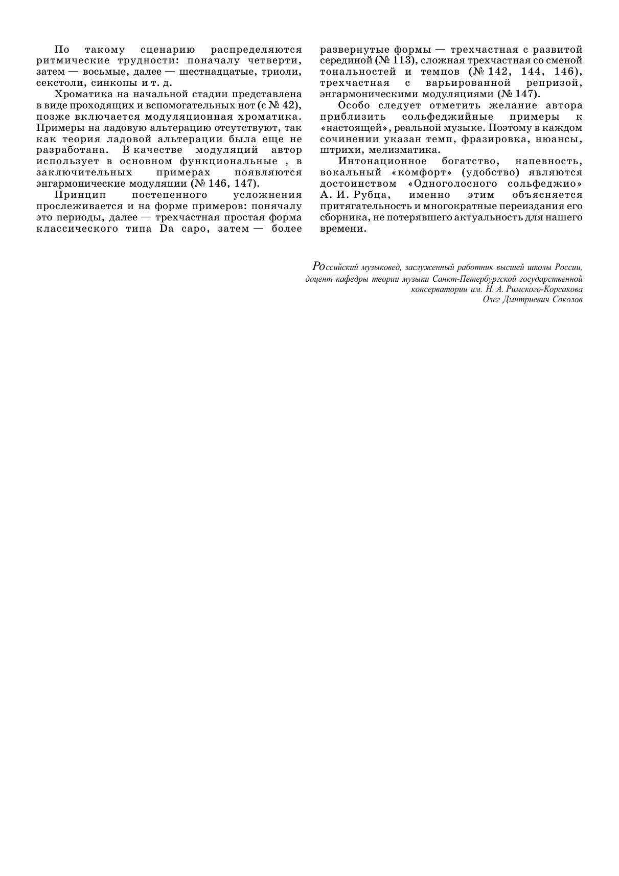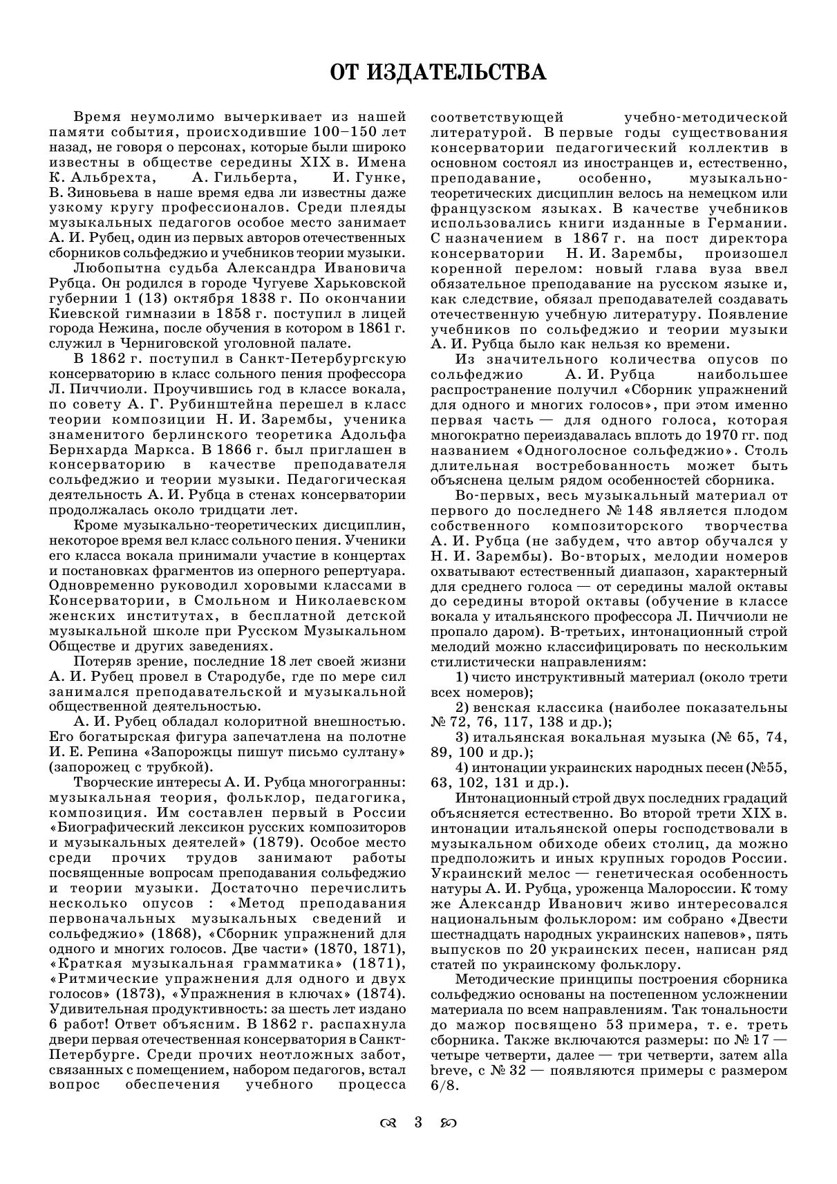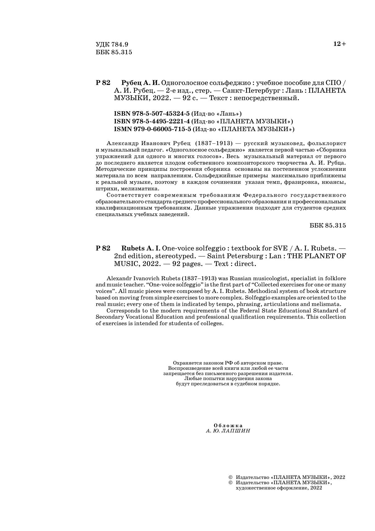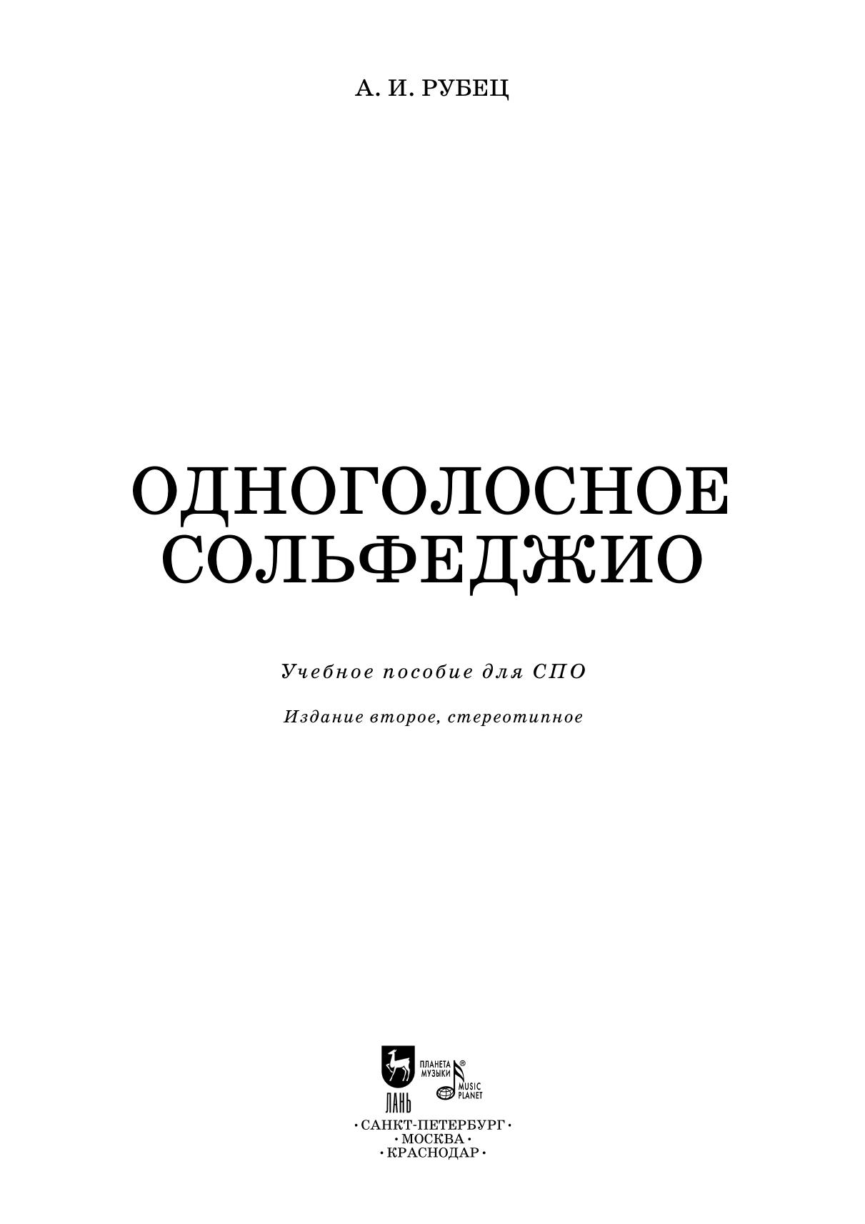 Alexandr Ivanovich Rubets (1837–1913) was Russian musicologist, specialist in folklore and music teacher. “One-voice solfeggio” is the first part of “Collected exercises for one or many voices”. All music pieces were composed by A. I. Rubets. Methodical system of book structure based on moving from simple exercises to more complex. Solfeggio examples are oriented to the real music; every one of them is indicated by tempo, phrasing, articulations and melismata. Corresponds to the modern requirements of the Federal State Educational Standard of Secondary Vocational Education and professional qualification requirements.
