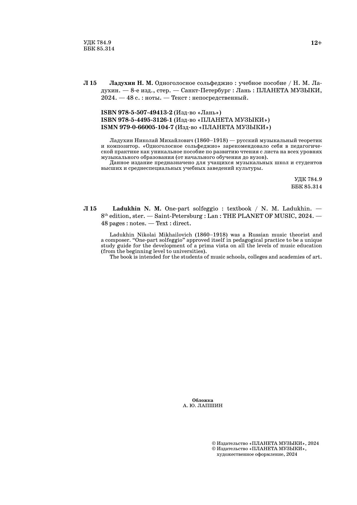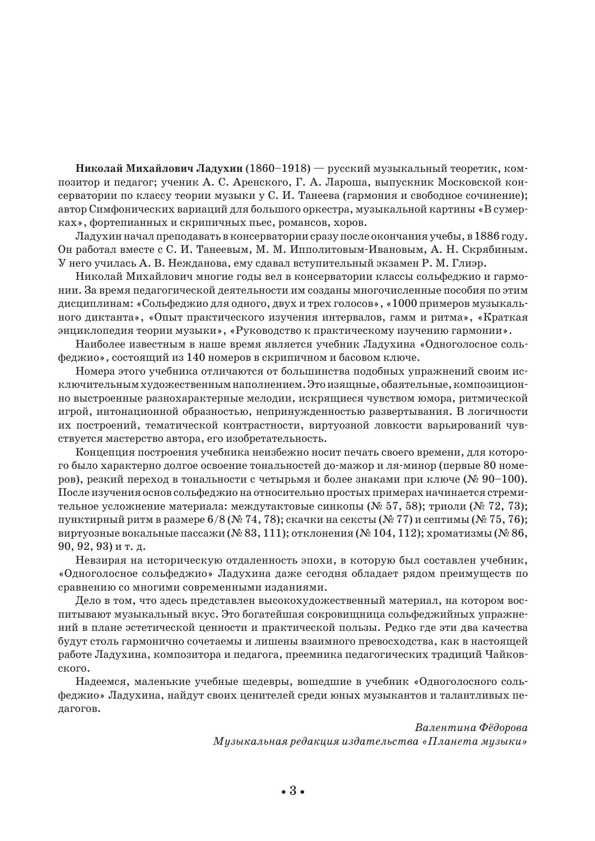Ладухин Николай Михайлович (1860–1918) — русский музыкальный теоретик и композитор. «Одноголосное сольфеджио» зарекомендовало себя в педагогической практике как уникальное пособие по развитию чтения с листа на всех уровнях музыкального образования (от начального обучения до вузов). Данное издание предназначено для учащихся музыкальных школ и студентов высших и среднеспециальных учебных заведений культуры.