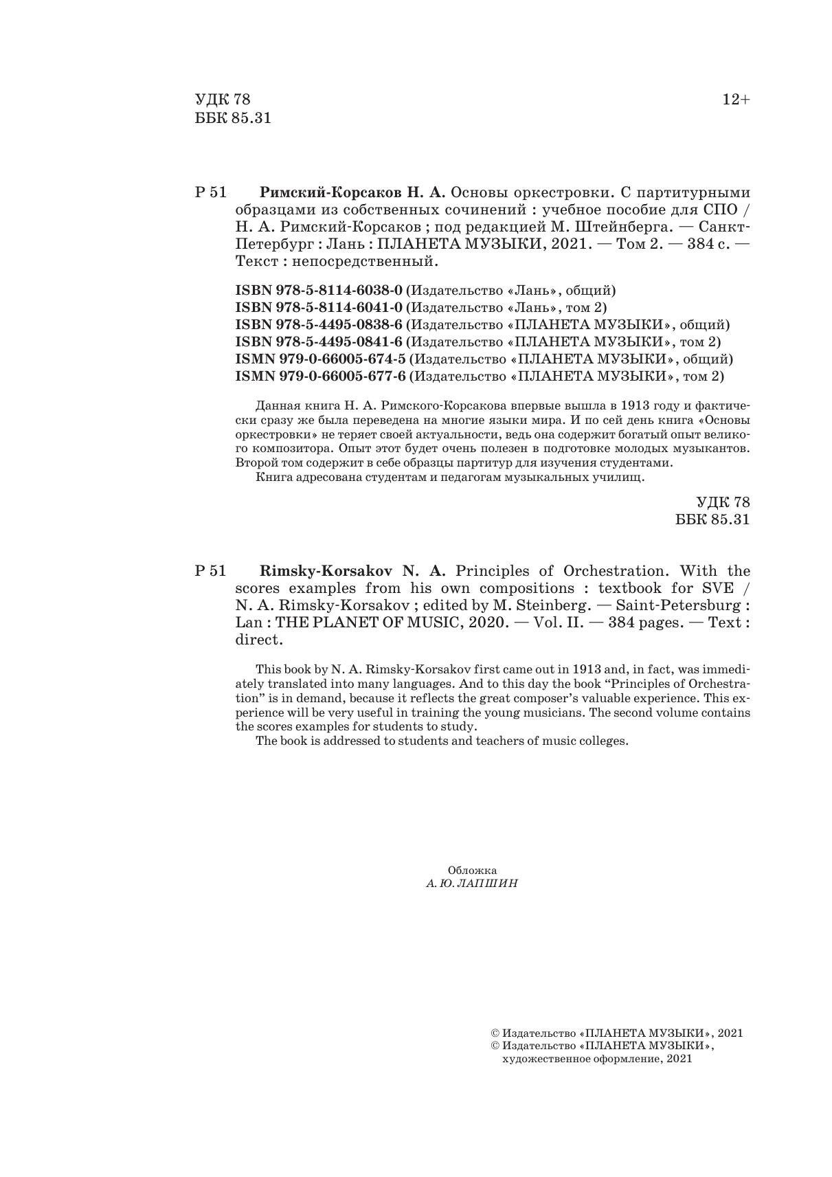 Данная книга Н.А. Римского-Корсакова впервые вышла в 1913 году и фактически сразу же была переведена на многие языки мира. И по сей день книга "Основы оркестровки" не теряет своей актуальности, ведь она содержит богатый опыт великого композитора. Опыт этот будет очень полезен в подготовке молодых музыкантов. Второй том содержит в себе образцы партитур для изучения студентами. Книга адресована студентам и педагогам музыкальных училищ.