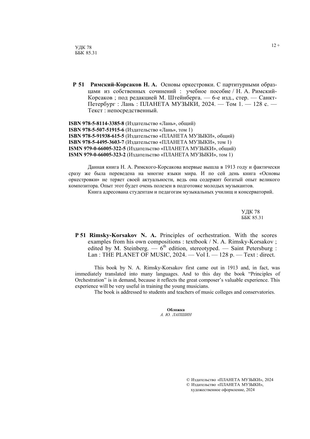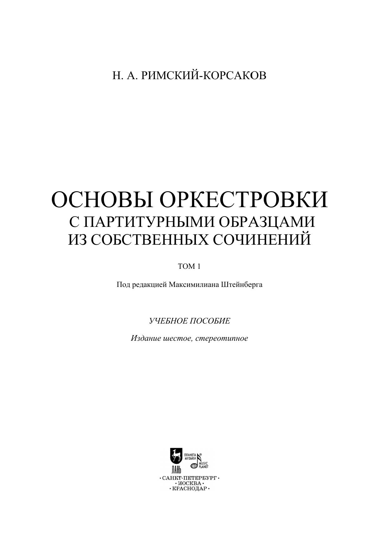Данная книга Н.А. Римского-Корсакова впервые вышла в 1913 году и фактически сразу же была переведена на многие языки мира. И по сей день книга "Основы оркестровки" не теряет своей актуальности, ведь она содержит богатый опыт великого композитора. Опыт этот будет очень полезен в подготовке молодых музыкантов. Книга адресована студентам и педагогам музыкальных училищ и консерваторий. This book by N. A. Rimsky-Korsakov first came out in 1913 and, in fact, was immediately translated into many languages. And to this day the book "Principles of Orchestration" is in demand, because it reflects the great composer’s valuable experience. This experience will be very useful in training the young musicians. The book is addressed to students and teachers of music colleges and conservatories.