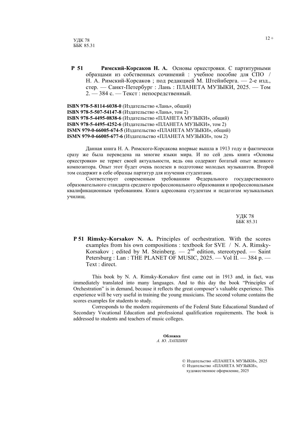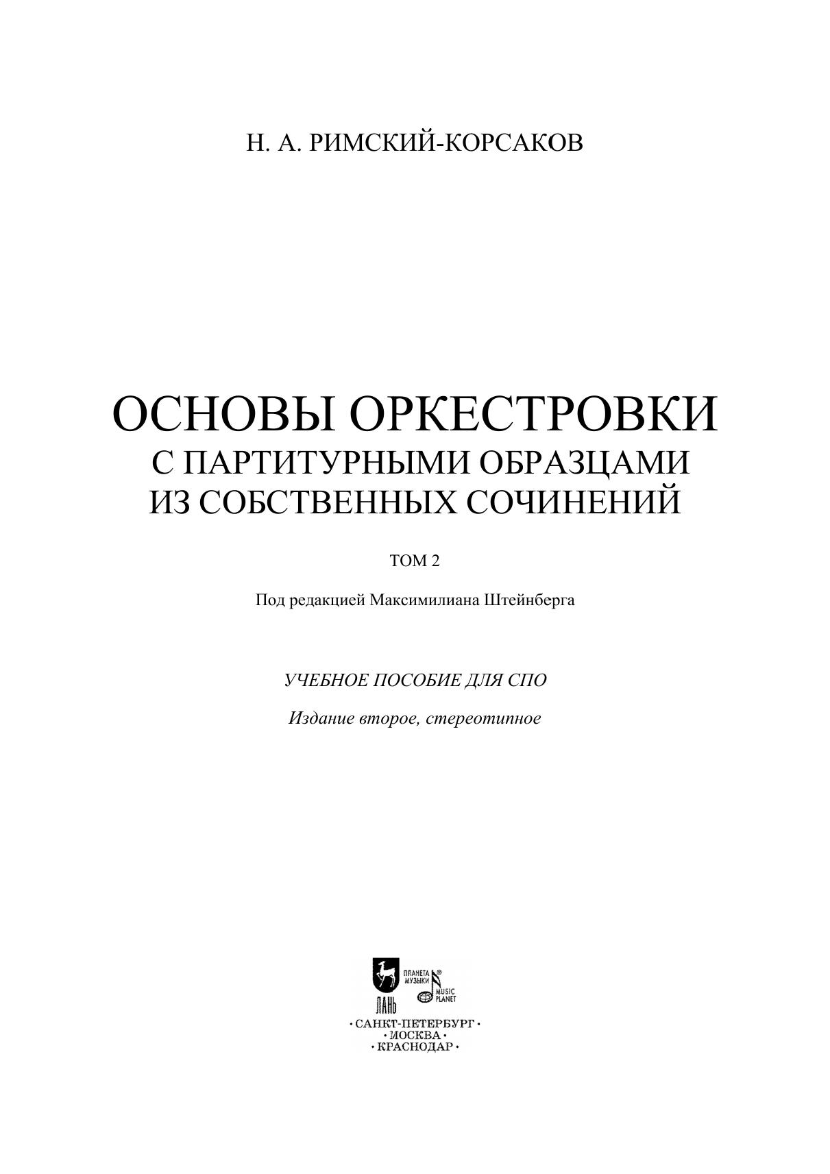 Данная книга Н.А. Римского-Корсакова впервые вышла в 1913 году и фактически сразу же была переведена на многие языки мира. И по сей день книга "Основы оркестровки" не теряет своей актуальности, ведь она содержит богатый опыт великого композитора. Опыт этот будет очень полезен в подготовке молодых музыкантов. Второй том содержит в себе образцы партитур для изучения студентами. Книга адресована студентам и педагогам музыкальных училищ. This book by N. A. Rimsky-Korsakov first came out in 1913 and, in fact, was immediately translated into many languages. And to this day the book "Principles of Orchestration" is in demand, because it reflects the great composer’s valuable experience. This experience will be very useful in training the young musicians. The second volume contains the scores examples for students to study. The book is addressed to students and teachers of music colleges.