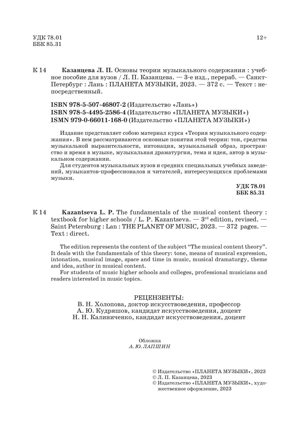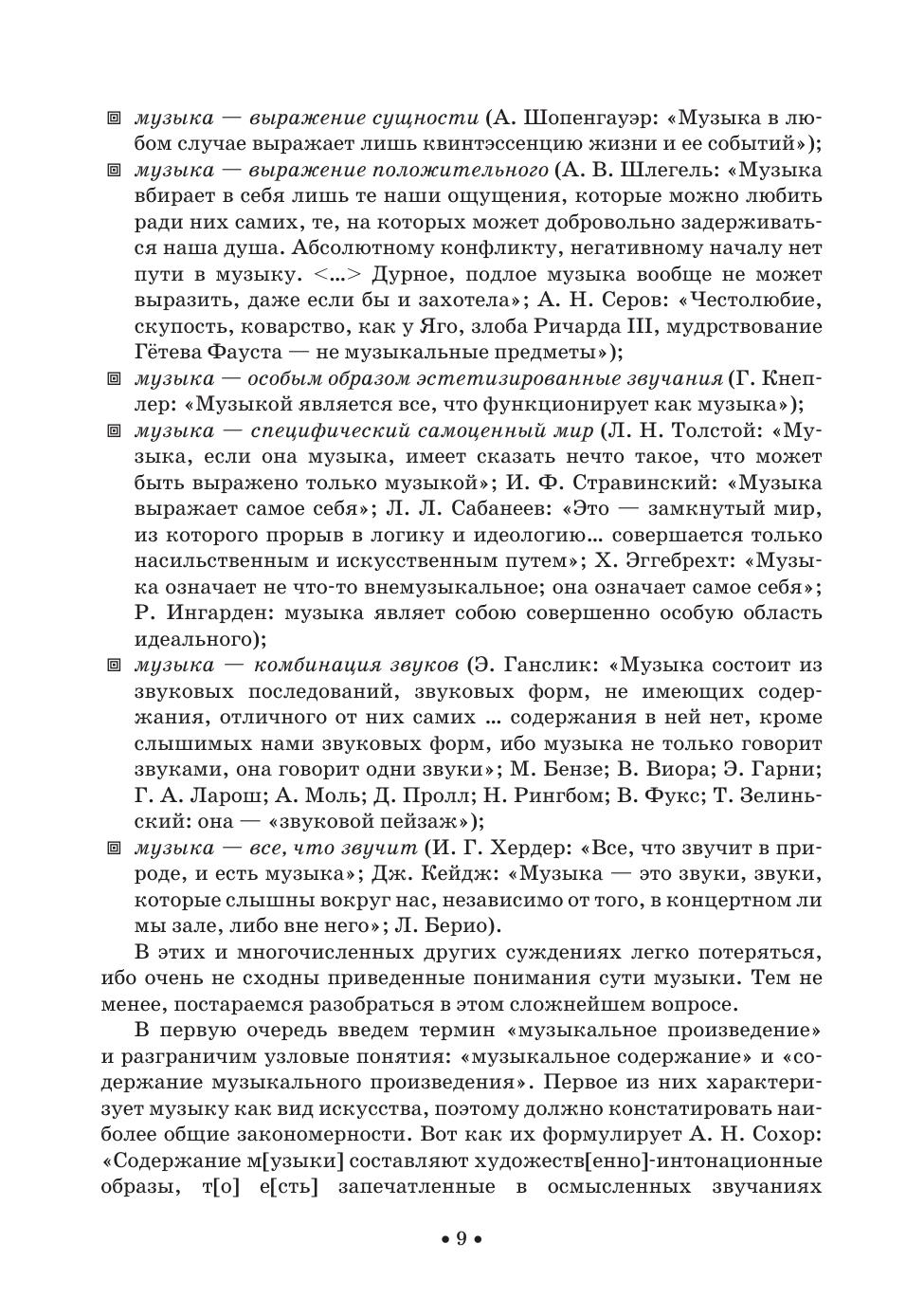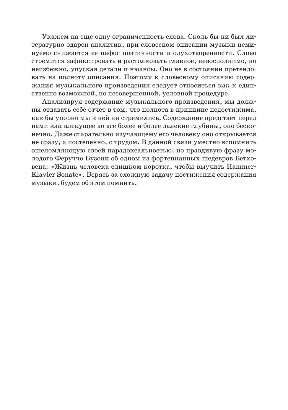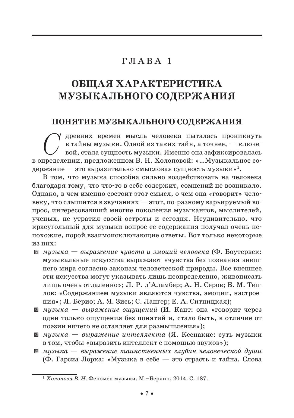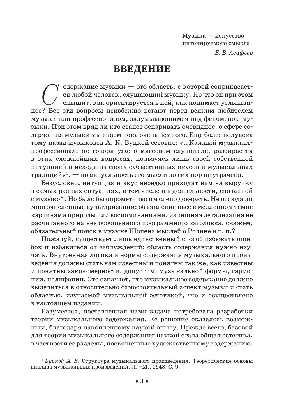 Издание представляет собою материал курса «Теория музыкального содержания». В нем рассматриваются основные понятия этой теории: тон, средства музыкальной выразительности, интонация, музыкальный образ, пространство и время в музыке, музыкальная драматургия, тема и идея, автор в музыкальном содержании. Для студентов музыкальных вузов и средних специальных учебных заведений, музыкантов-профессионалов и читателей, интересующихся проблемами музыки. The edition represents the content of the subject “The musical content theory”. It deals with the fundamentals of this theory: tone, means of musical expression, intonation, musical image, space and time in music, musical dramaturgy, theme and idea, author in musical content. For students of music higher schools and colleges, professional musicians and readers interested in music topics.