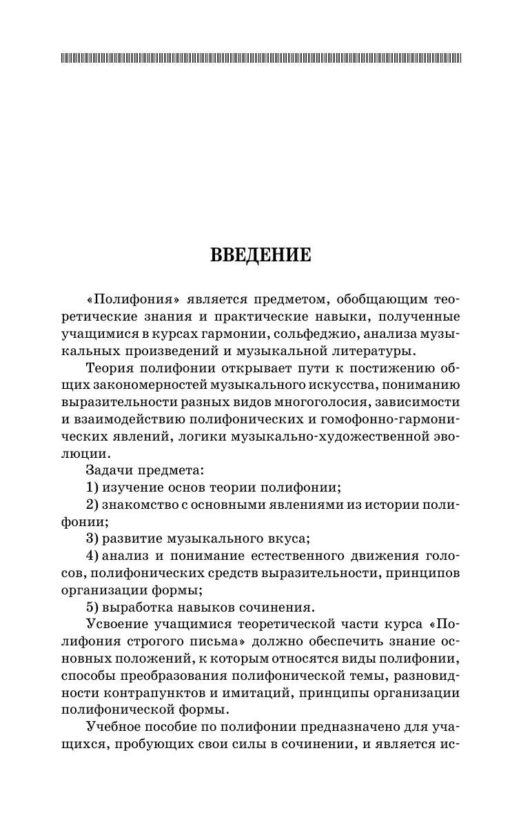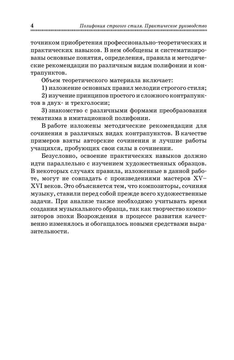 Учебное пособие является кратким изложением теоретического курса "Полифонии строгого стиля" и практическим руководством к сочинению различных видов двух и трёхголосных контрапунктов, в котором обобщены и систематизированы основные определения, правила, методические рекомендации по выполнению творческих заданий.
