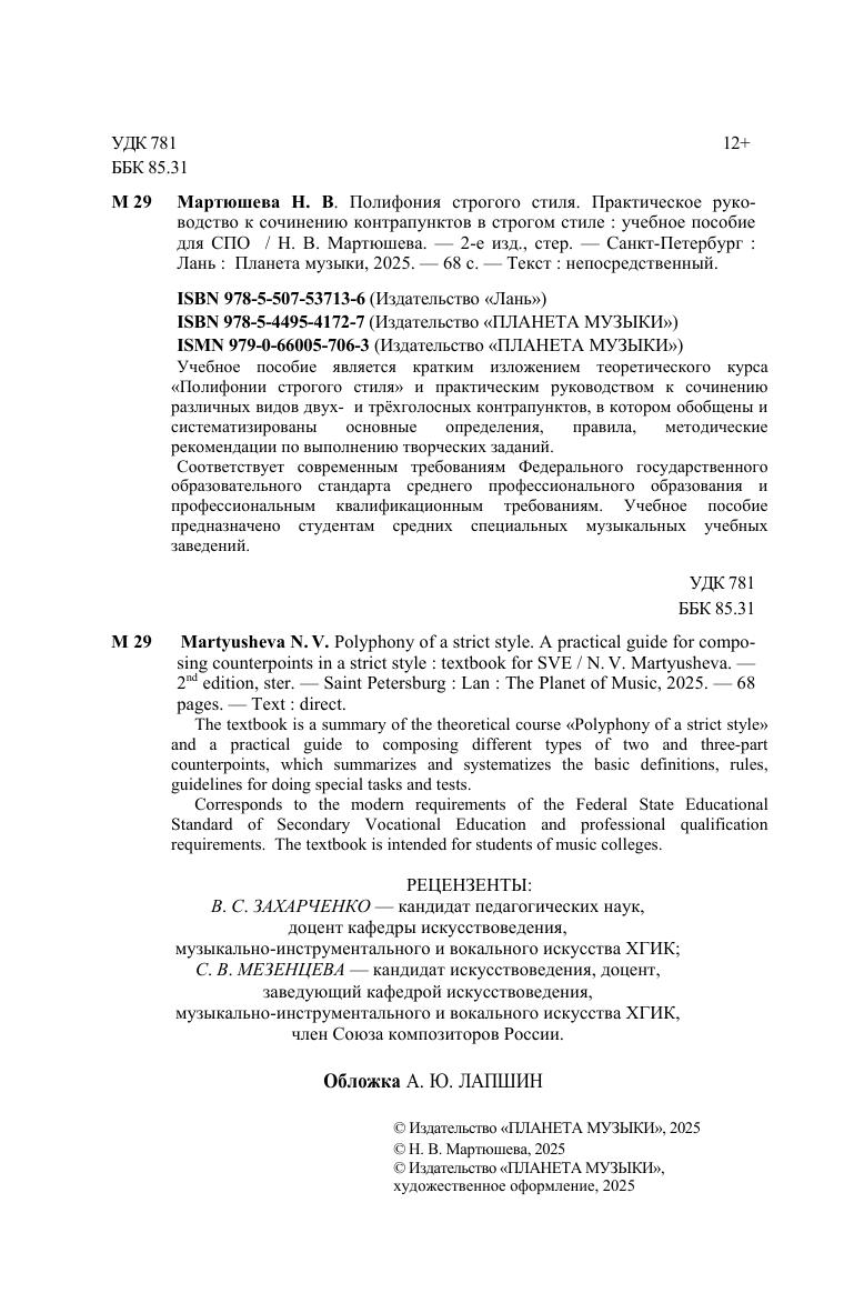 Учебное пособие является кратким изложением теоретического курса "Полифонии строгого стиля" и практическим руководством к сочинению различных видов двух и трёхголосных контрапунктов, в котором обобщены и систематизированы основные определения, правила, методические рекомендации по выполнению творческих заданий. Учебное пособие предназначено студентам средних специальных музыкальных учебных заведений. The textbook is a summary of the theoretical course "Polyphony of a strict style" and a practical guide to composing different types of two and three-part counterpoints, which summarizes and systematizes the basic definitions, rules, guidelines for doing special tasks and tests. The textbook is intended for students of music colleges.