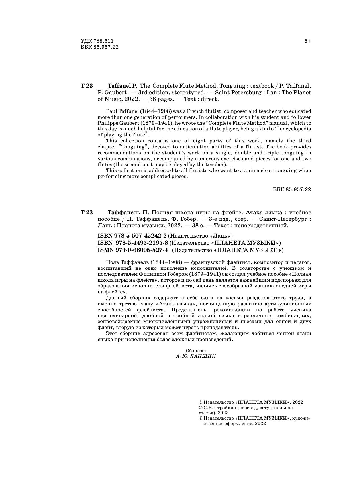 Данный сборник содержит в себе один из восьми разделов этого труда, а именно третью главу «Атака языка», посвященную развитию артикуляционных способностей флейтиста. Представлены рекомендации по работе ученика над одинарной, двойной и тройной атакой языка в различных комбинациях, сопровождаемые многочисленными упражнениями и пьесами для одной и двух флейт, вторую из которых может играть преподаватель.