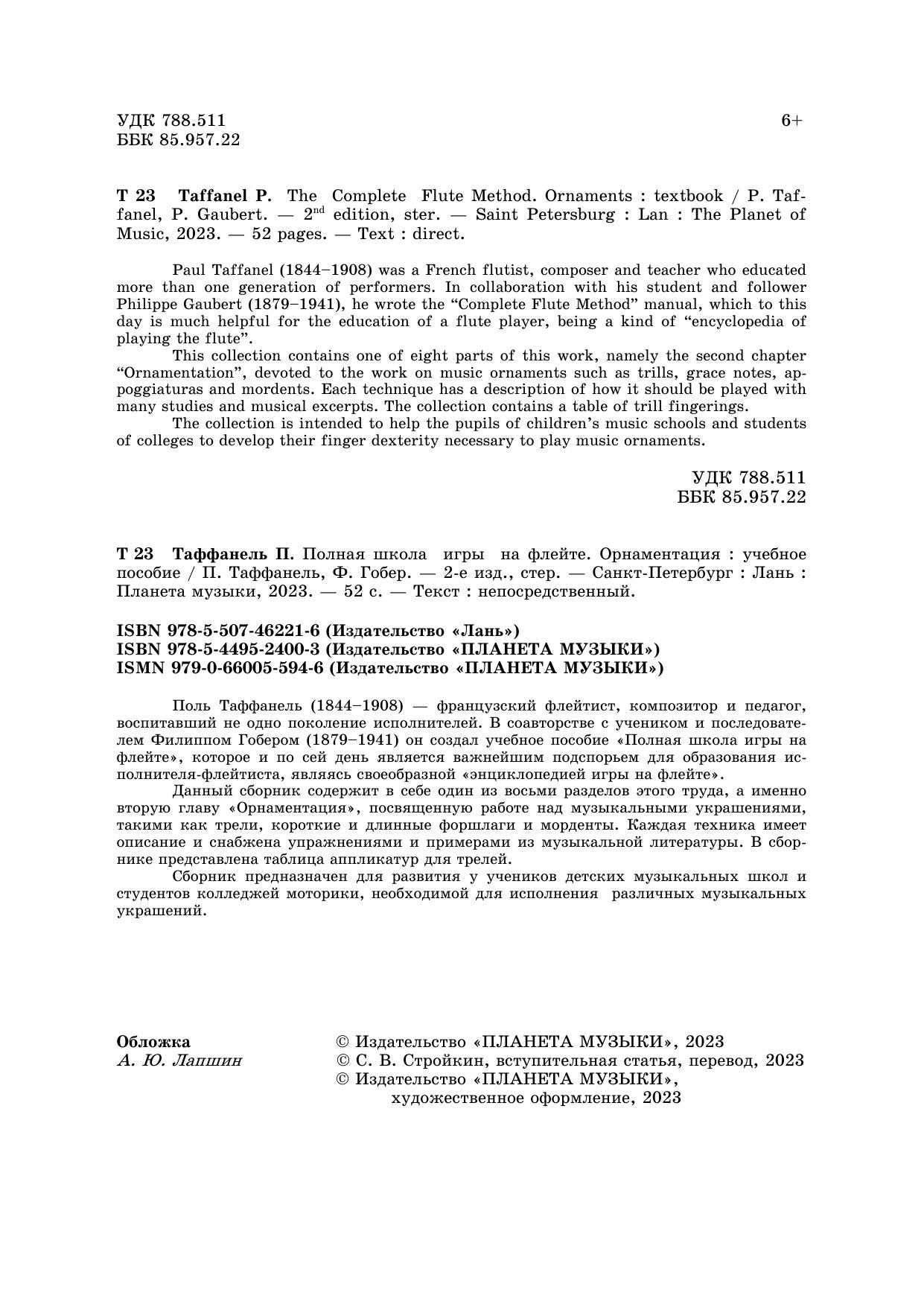 This collection contains one of eight parts of this work, namely the second chapter “Ornamentation”, devoted to the work on music ornaments such as trills, grace notes, appoggiaturas and mordents. Each technique has a description of how it should be played with many studies and musical excerpts. The collection contains a table of trill fingerings.