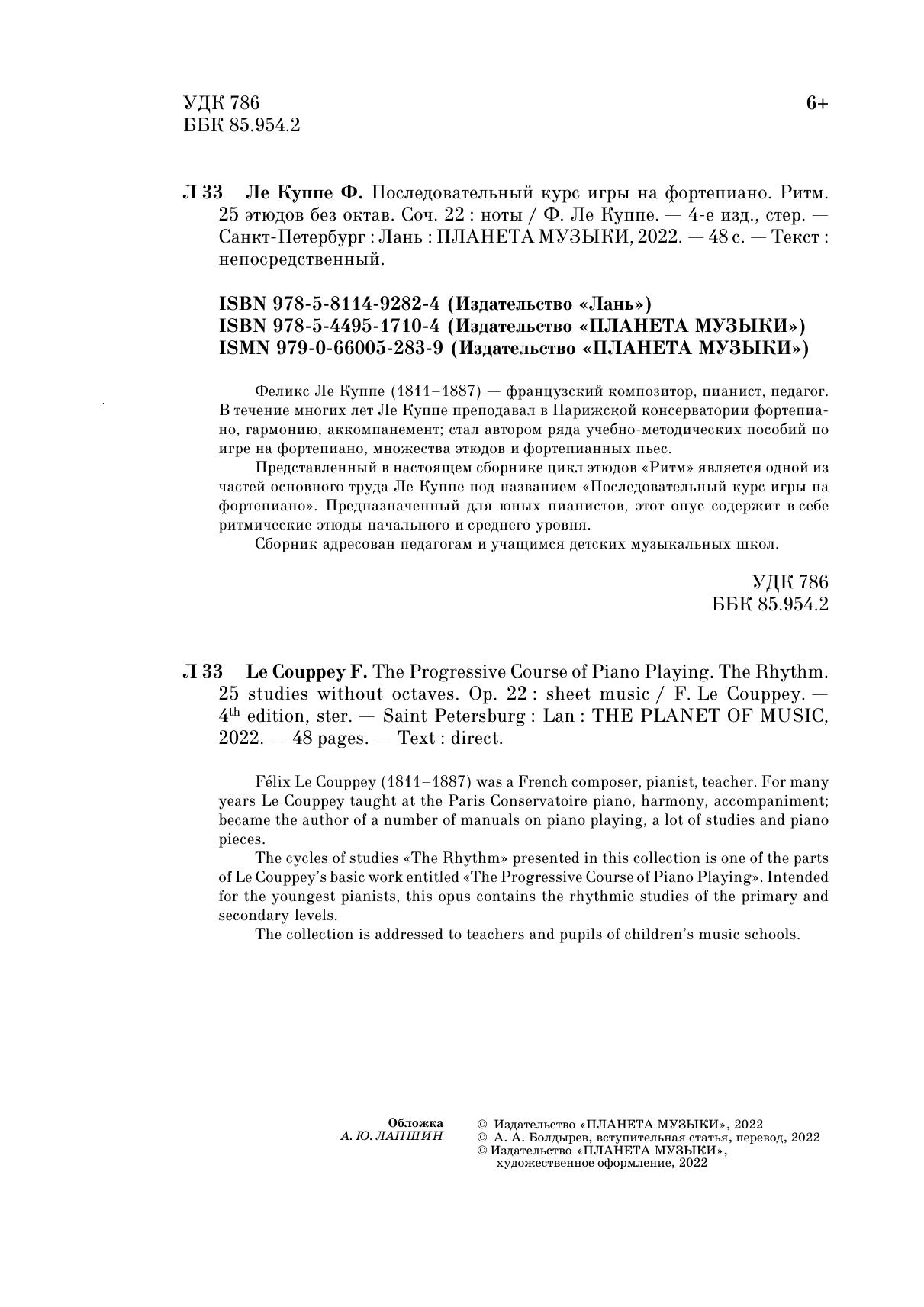 Феликс Ле Куппе (1811–1887) – французский композитор, пианист, педагог. В течение многих лет Ле Куппе преподавал в Парижской консерватории фортепиано, гармонию, аккомпанемент; стал автором ряда учебно-методических пособий по игре на фортепиано, множества этюдов и фортепианных пьес. Представленный в настоящем сборнике цикл этюдов «Ритм» является одной из частей основного труда Ле Куппе под названием «Последовательный курс игры на фортепиано». Предназначенный для юных пианистов, этот опус содержит в себе ритмические этюды начального и среднего уровня.