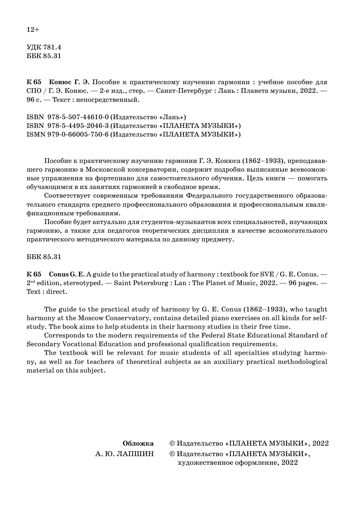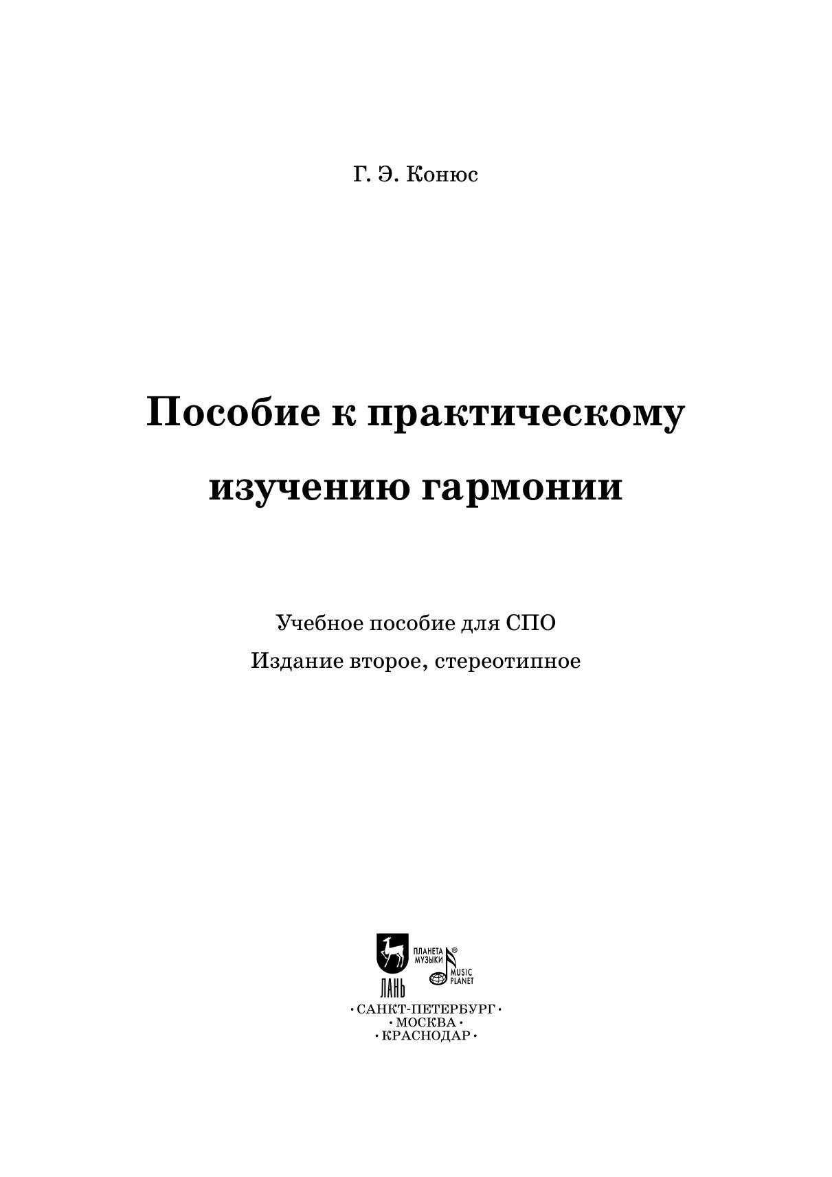 Пособие к практическому изучению гармонии Г. Э. Конюса, преподававшего гармонию в Московской консерватории, содержит подробно выписанные всевозможные упражнения на фортепиано для самообучения. Цель книги — помогать обучающимся в их занятиях гармонией в свободное время.