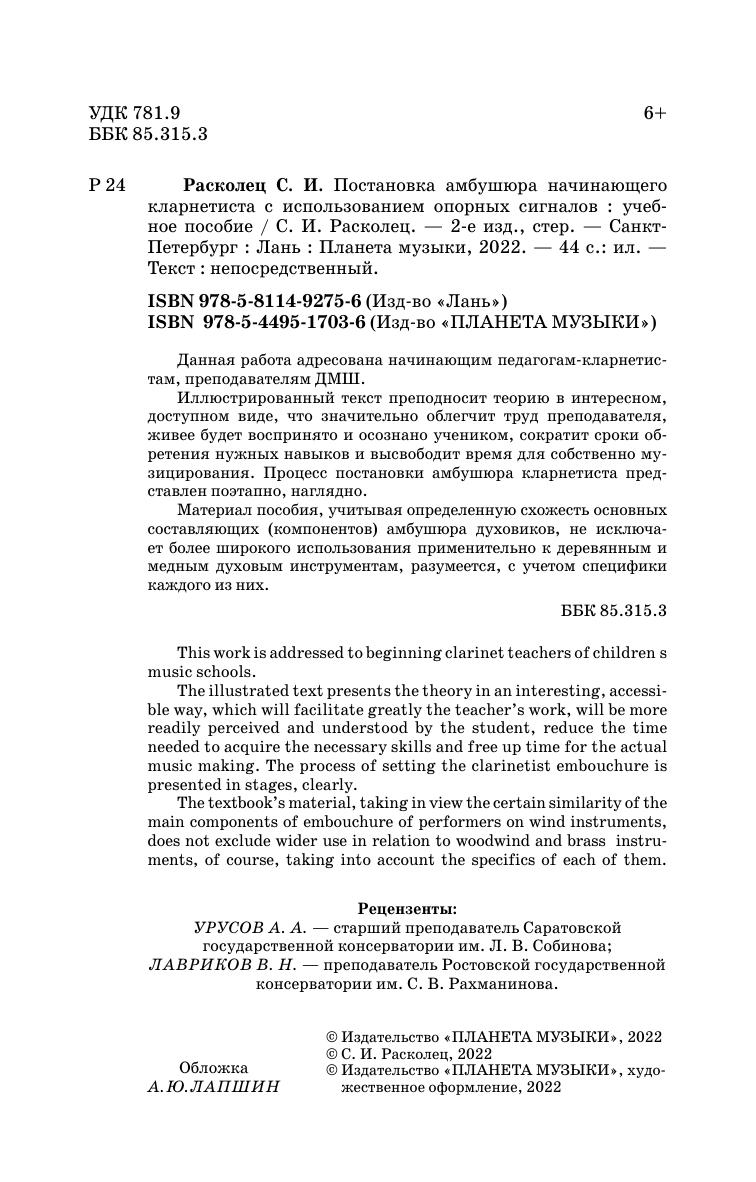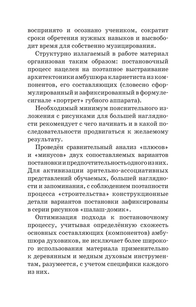 Данная работа адресована начинающим педагогам-кларнетистам, преподавателям ДМШ. Иллюстрированный текст преподносит теорию в интересном, доступном виде, что значительно облегчит труд преподавателя, живее будет воспринято и осознано учеником, сократит сроки обретения нужных навыков и высвободит время для собственно музицирования. Процесс постановки амбушюра кларнетиста представлен поэтапно, наглядно.
