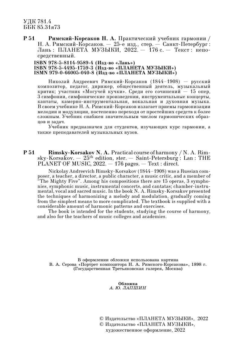 Nickolay Andreevich Rimsky-Korsakov (1844–1908) was a Russian composer, a teacher, a director, a public character, a music critic, and a member of “The Mighty Five”. Among his compositions there are 15 operas, 3 symphonies, symphonic music, instrumental concerts, and cantatas; chamber-instrumental, vocal and sacred music. In the book N.A. Rimsky-Korsakov presented the techniques of harmonizing a melody and modulation, gradually coming from the simplest means to more complicated. The textbook is supplied with a considerable amount of harmonic patterns and exercises.