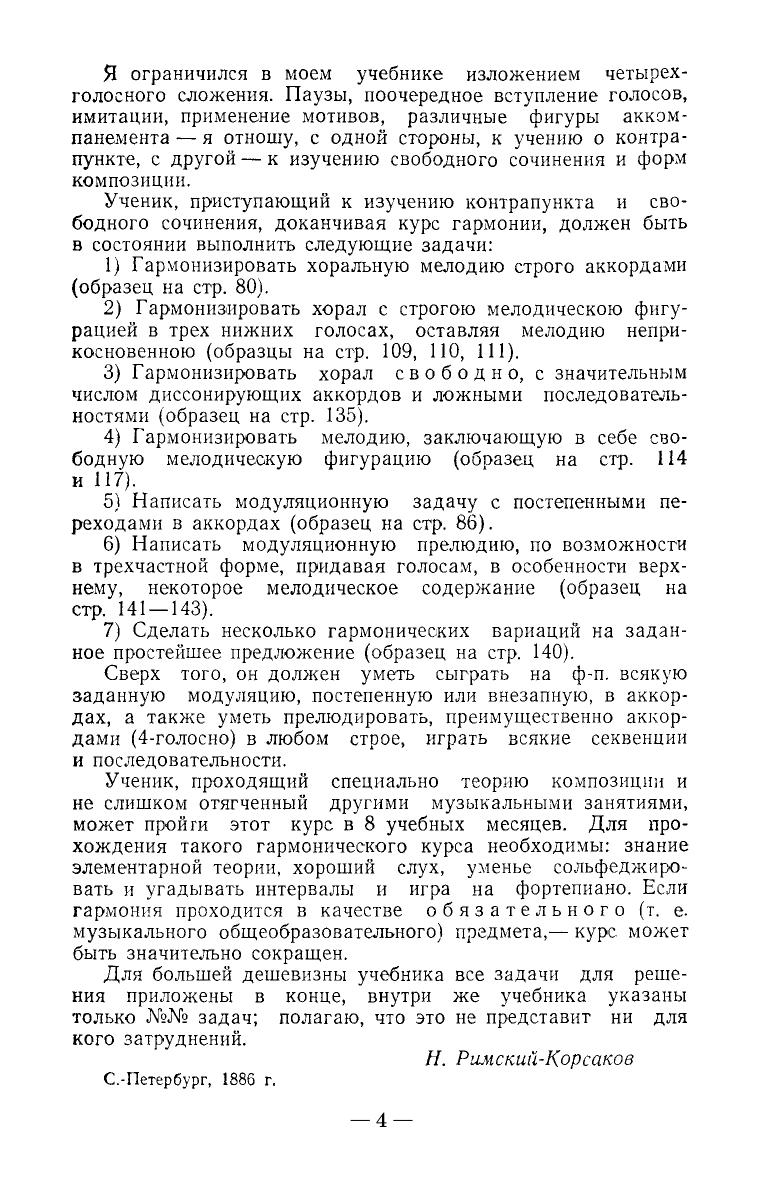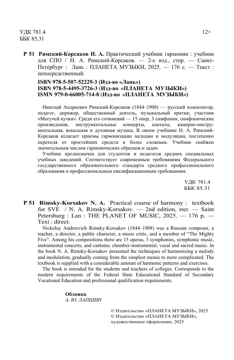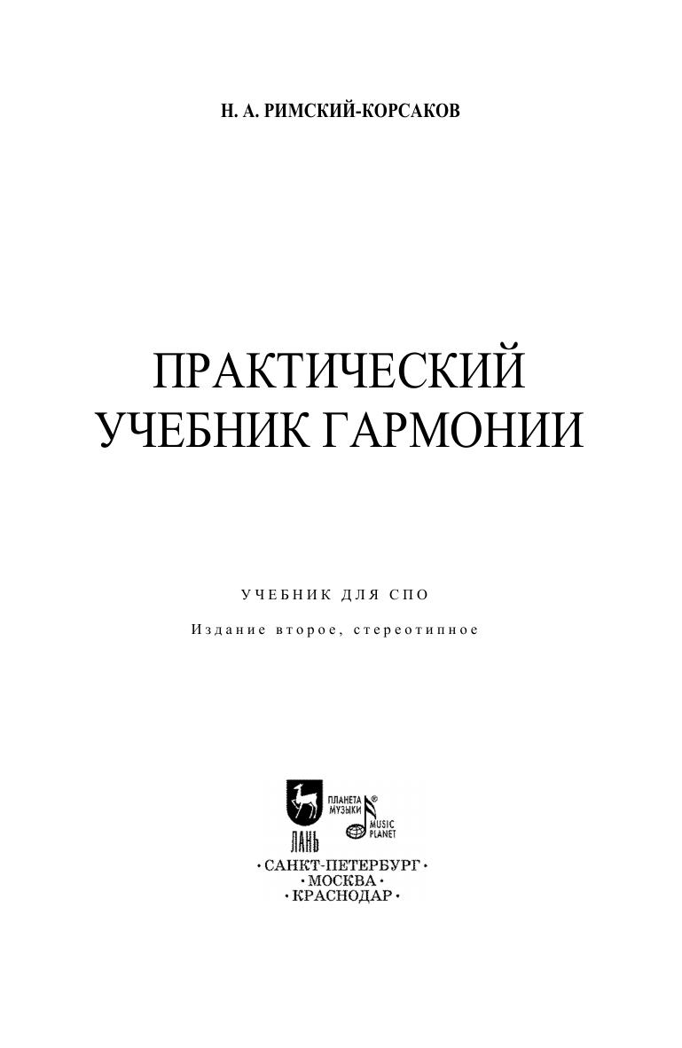Николай Андреевич Римский-Корсаков (1844–1908) — русский композитор, педагог, дирижер, общественный деятель, музыкальный критик, участник «Могучей кучки». Среди его сочинений — 15 опер, 3 симфонии, симфонические произведения, инструментальные концерты, кантаты, камерно-инструментальная, вокальная и духовная музыка. В своем учебнике Н. А. Римский-Корсаков излагает приемы гармонизации мелодии и модуляции, постепенно переходя от простейших средств к более сложным. Учебник снабжен значительным числом гармонических образцов и задач. Учебник предназначен для студентов и педагогов средних специальных учебных заведений. Nickolay Andreevich Rimsky-Korsakov (1844–1908) was a Russian composer, a teacher, a director, a public character, a music critic, and a member of “The Mighty Five”. Among his compositions there are 15 operas, 3 symphonies, symphonic music, instrumental concerts, and cantatas, chamber-instrumental, vocal and sacred music. In the book N.A. Rimsky-Korsakov presented the techniques of harmonizing a melody and modulation, gradually coming from the simplest means to more complicated. The textbook is supplied with a considerable amount of harmonic patterns and exercises. The book is intended for the students and teachers of colleges.