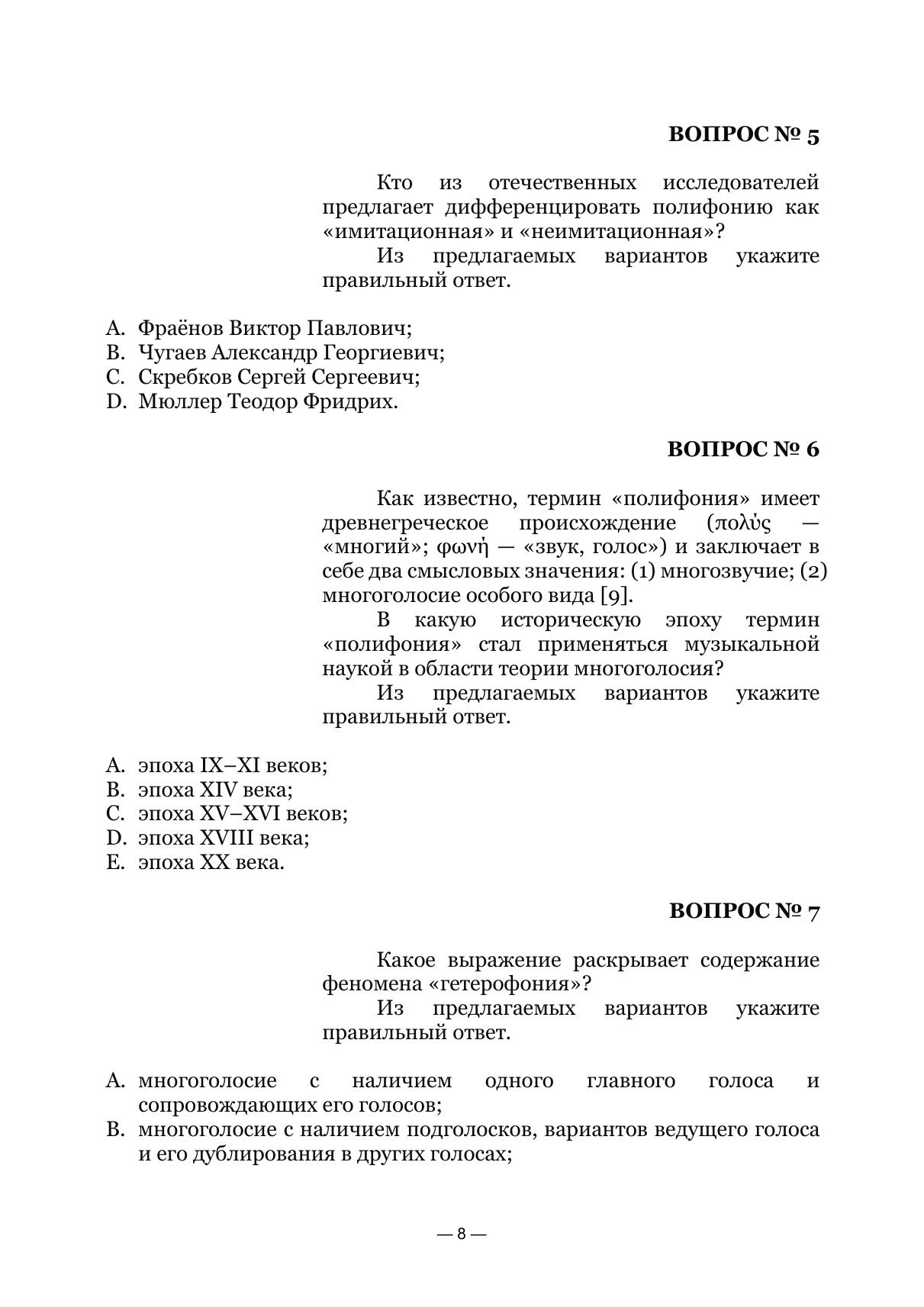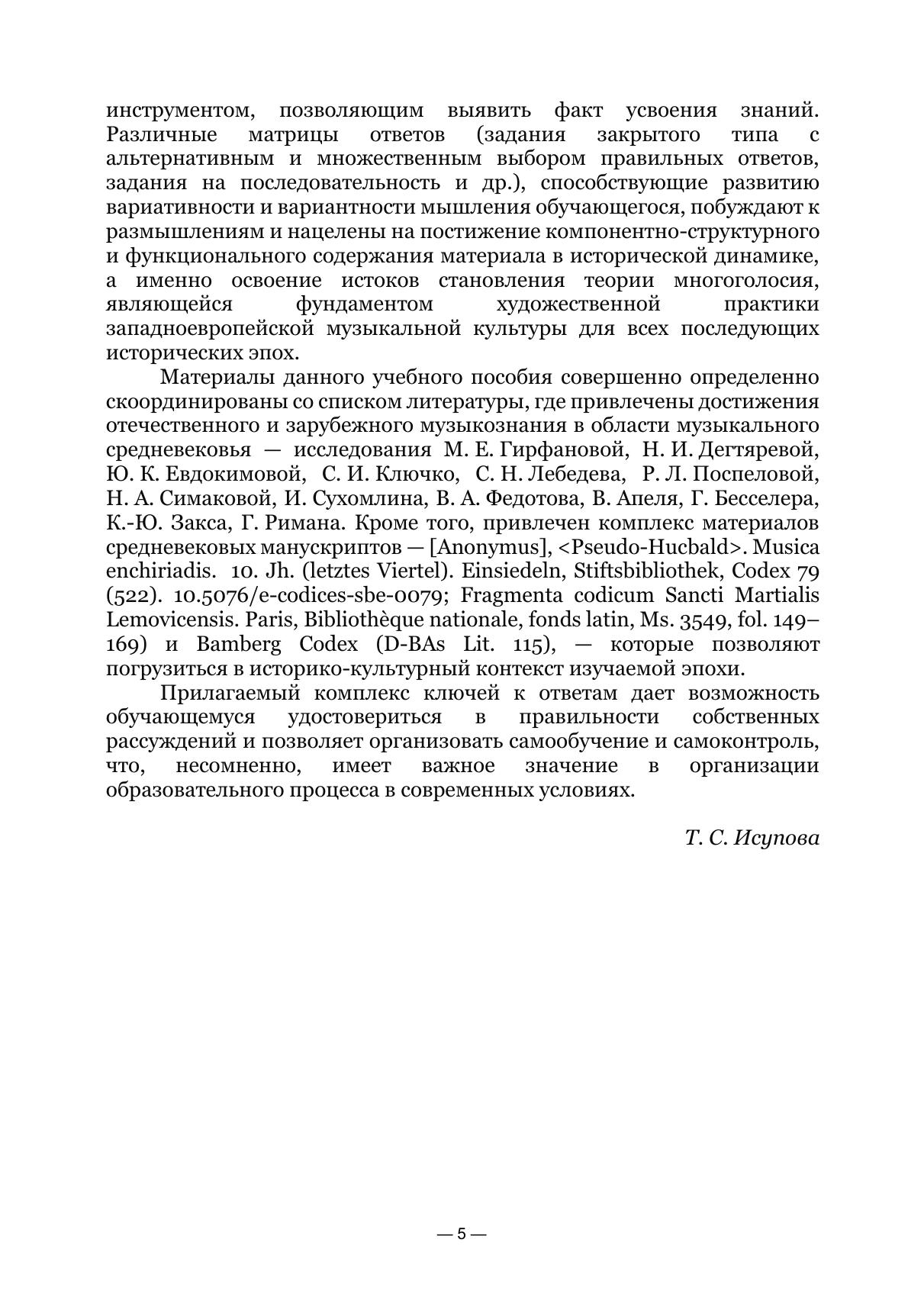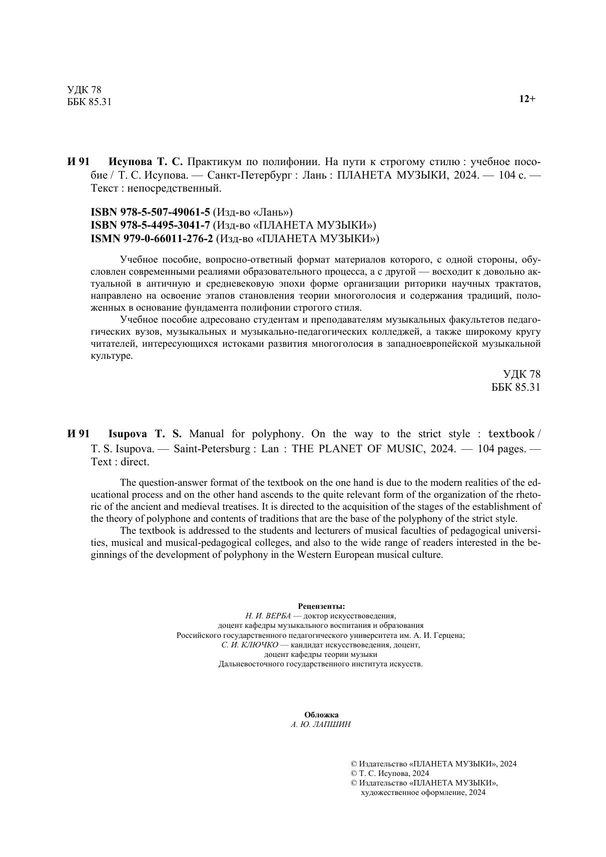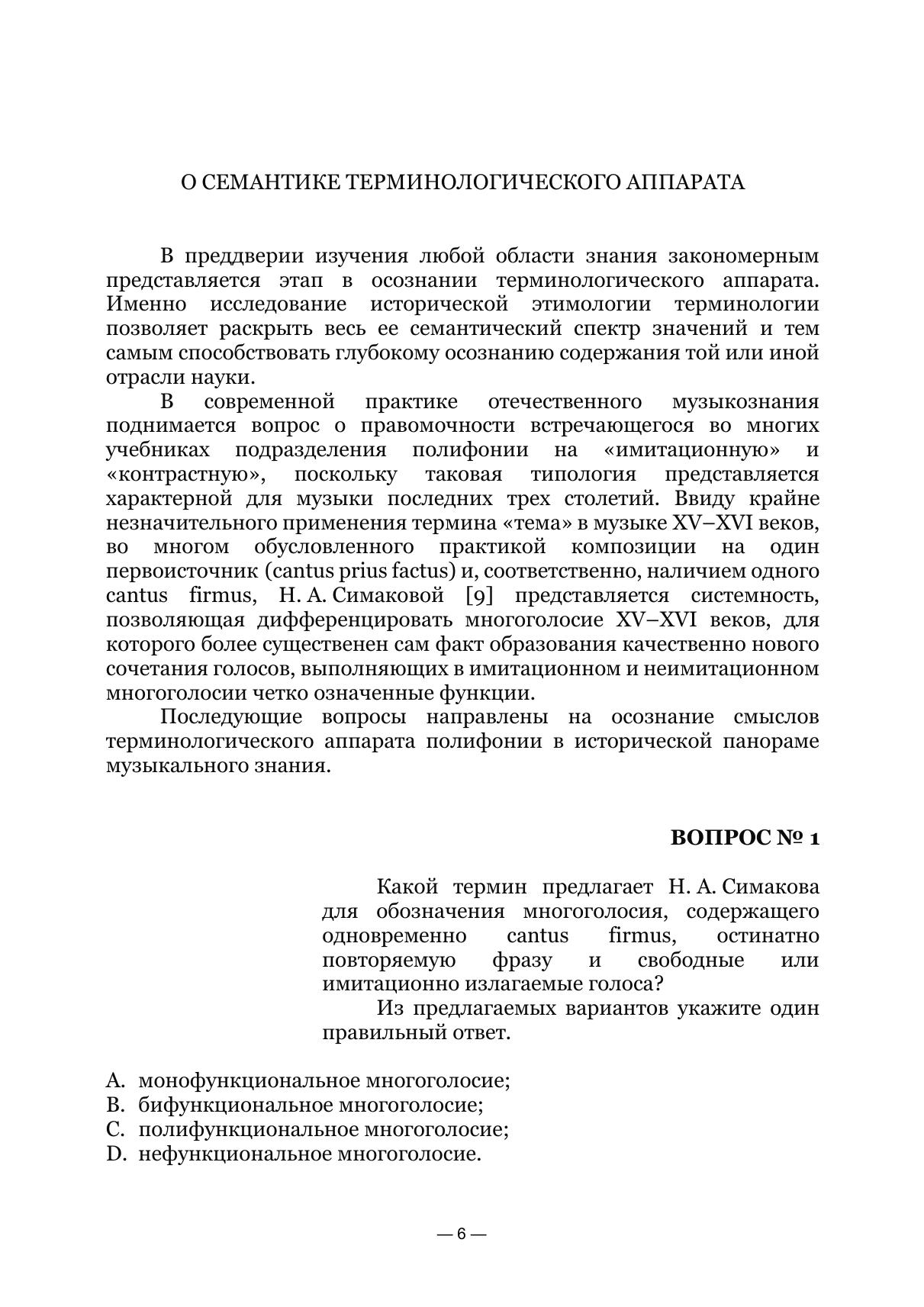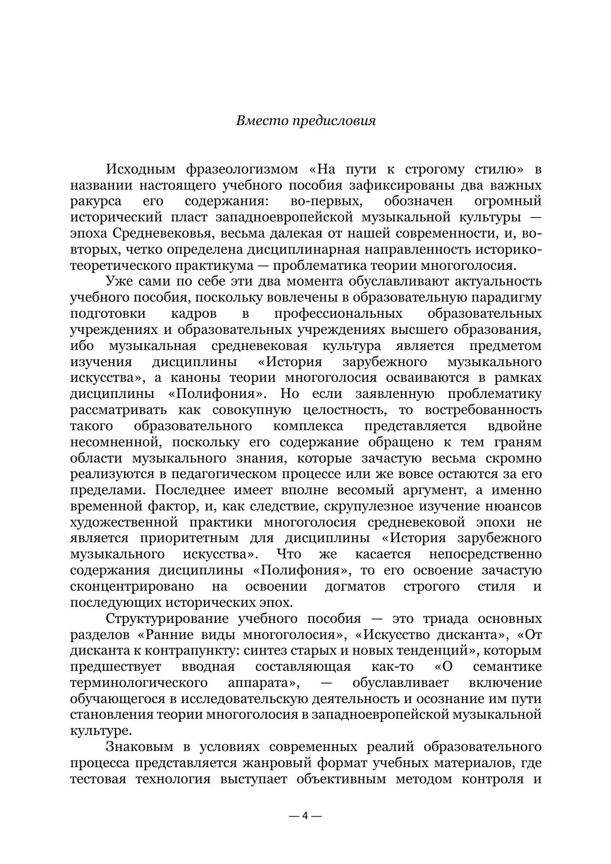 Учебное пособие, вопросно-ответный формат материалов которого, с одной стороны, обусловлен современными реалиями образовательного процесса, а с другой — восходит к до-вольно актуальной в античную и средневековую эпохи форме организации риторики научных трактатов, направлено на освоение этапов становления теории многоголосия и содержания тра-диций, положенных в основание фундамента полифонии строгого стиля. Учебное пособие адресовано студентам и преподавателям музыкальных факультетов пе-дагогических вузов, музыкальных и музыкально-педагогических колледжей, а также широкому кругу читателей, интересующихся истоками развития многоголосия в западноевропейской му-зыкальной культуре. The question-answer format of the textbook on the one hand is due to the modern realities of the educational process and on the other hand ascends to the quite relevant form of the organization of the rhetoric of the ancient and medieval treatises. It is directed to the acquisition of the stages of the establishment of the theory of polyphone and contents of traditions that are the base of the polyphony of the strict style. The textbook is addressed to the students and lecturers of musical faculties of pedagogical universities, musical and musical-pedagogical colleges, and also to the wide range of readers interested in the beginnings of the development of polyphony in the Western European musical culture.