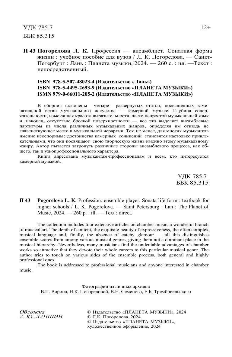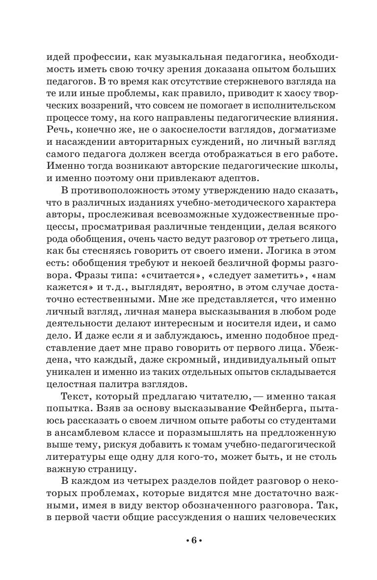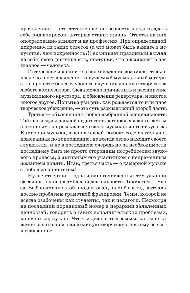 В сборник включены четыре развернутых статьи, посвященных замечательной ветви музыкального искусства — камерной музыке. Глубина содержательности, изысканная красота выразительности, часто непростой музыкальный язык и, наконец, отсутствие броской поверхностности — все это выделяет ансамблевые партитуры из числа различных музыкальных жанров, определяя им отнюдь не главенствующее место в музыкальной иерархии. Тем не менее, для многих музыкантов именно неоспоримые достоинства камерных сочинений становятся настолько привле-кательными, что они посвящают свою творческую жизнь именно этому музыкальному жанру. Автор пытается затронуть различные стороны ансамблевого процесса, как об-щего, так и узкопрофессионального характера. Книга адресована музыкантам-профессионалам и всем, кто интересуется камерной музыкой. The collection includes four extensive articles on chamber music, a wonderful branch of musical art. The depth of content, the exquisite beauty of expressiveness, the often complex musical language and, finally, the absence of catchy glamour — all this distinguishes ensemble scores from among various musical genres, giving them not a dominant place in the musical hierarchy. Nevertheless, many musicians find the undeniable advantages of chamber works so attractive that they devote their whole careers to this particular musical genre. The author tries to touch on various sides of the ensemble process, both general and highly professional ones. The book is addressed to professional musicians and anyone interested in chamber music.