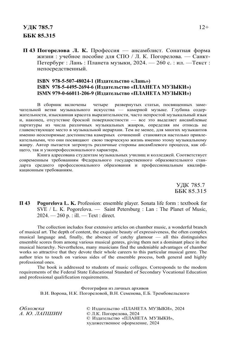 В сборник включены четыре развернутых статьи, посвященных заме-чательной ветви музыкального искусства — камерной музыке. Глубина содер-жательности, изысканная красота выразительности, часто непростой музыкальный язык и, наконец, отсутствие броской поверхностности — все это выделяет ансамблевые партитуры из числа различных музыкальных жанров, определяя им отнюдь не главенствующее место в музыкальной иерархии. Тем не менее, для многих музыкантов именно неоспоримые достоинства камерных сочинений становятся настолько привле-кательными, что они посвящают свою творческую жизнь именно этому музыкальному жанру. Автор пытается затронуть различные стороны ансамблевого процесса, как об-щего, так и узкопрофессионального характера. Книга адресована студентам музыкальных училищ и колледжей. Соответствует современным требованиям Федерального государственного образовательного стан-дарта среднего профессионального образования и профессиональным квалифи-кационным требованиям. The collection includes four extensive articles on chamber music, a wonderful branch of musical art. The depth of content, the exquisite beauty of expressiveness, the often complex musical language and, finally, the absence of catchy glamour — all this distinguishes ensemble scores from among various musical genres, giving them not a dominant place in the musical hierarchy. Nevertheless, many musicians find the undeniable advantages of chamber works so attractive that they devote their whole careers to this particular musical genre. The author tries to touch on various sides of the ensemble process, both general and highly professional ones. The book is addressed to students of music colleges. Corresponds to the modern requirements of the Federal State Educational Standard of Secondary Vocational Education and professional qualification requirements.