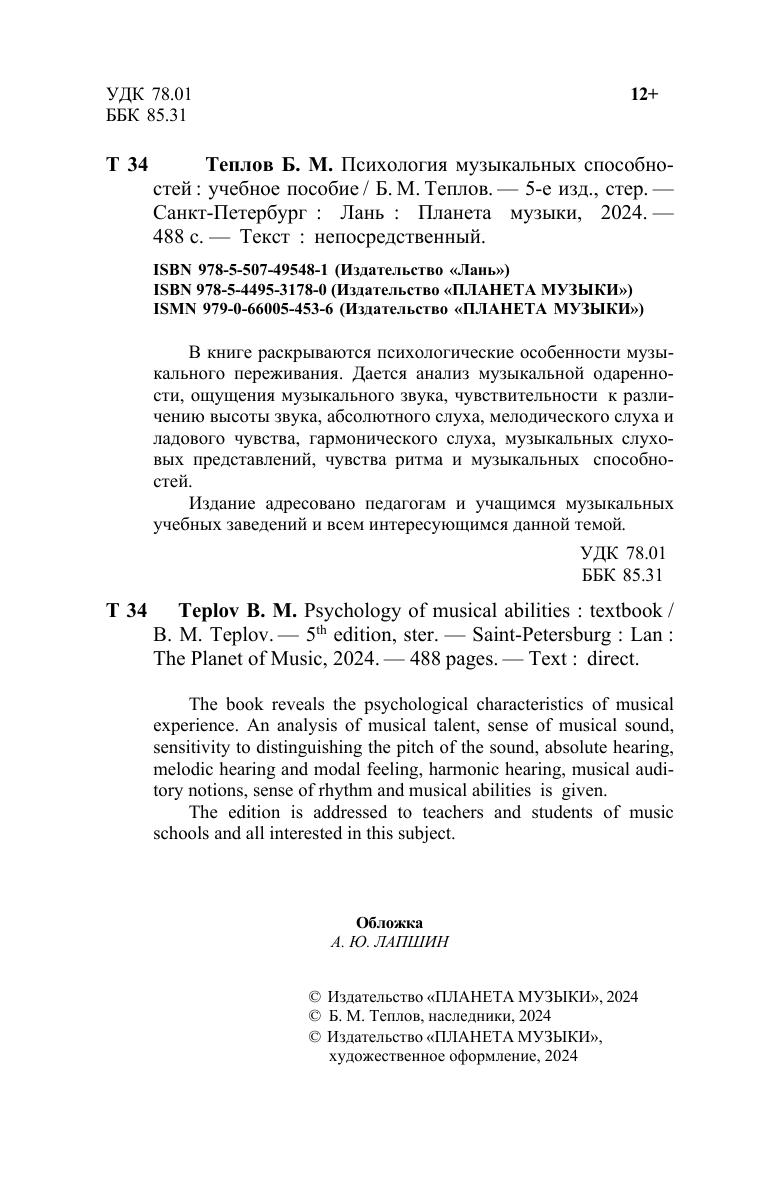 В книге раскрываются психологические особенности музыкального переживания. Дается анализ музыкальной одаренности, ощущения музыкального звука, чувствительности к различению высоты звука, абсолютного слуха, мелодического слуха и ладового чувства, гармонического слуха, музыкальных слуховых представлений, чувства ритма и музыкальных способностей. Издание адресовано педагогам и учащимся музыкальных учебных заведений и всем, интересующимся данной темой.